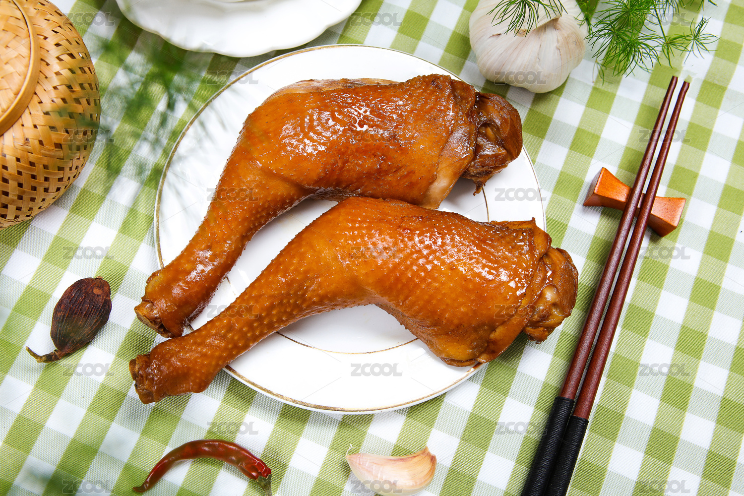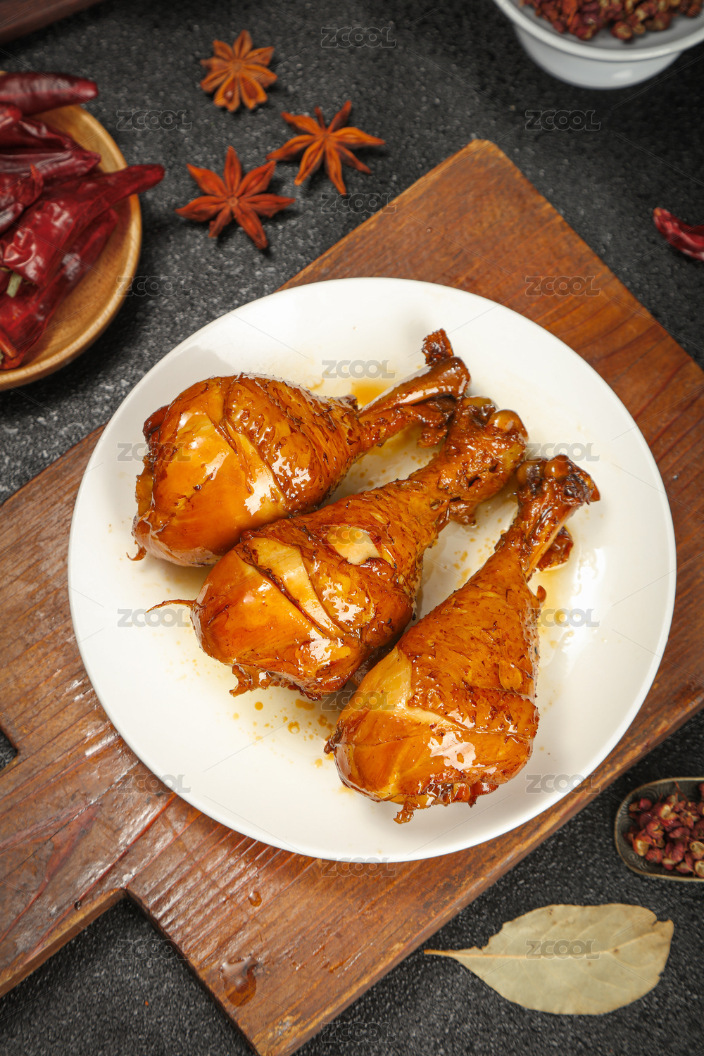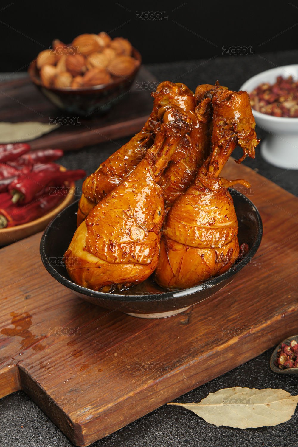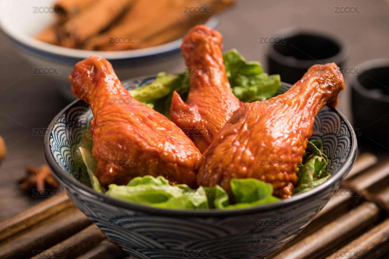 傳統(tǒng)背景下裝在碗里的三只鹵雞腿
