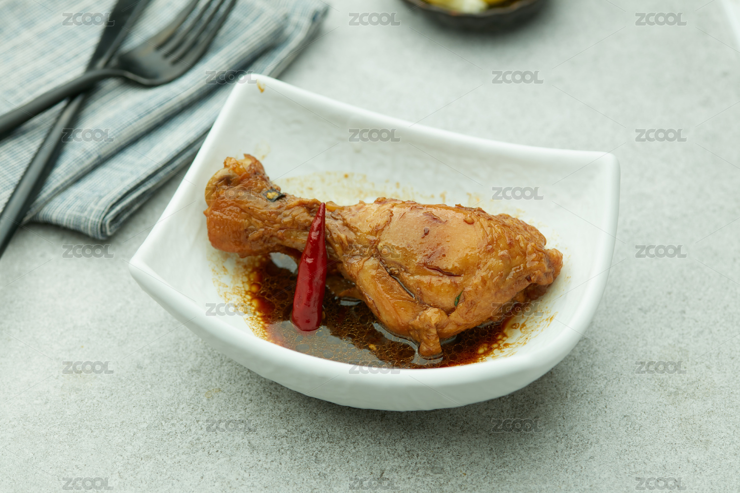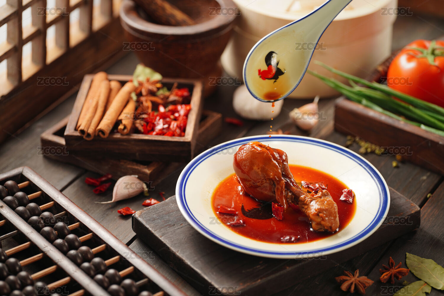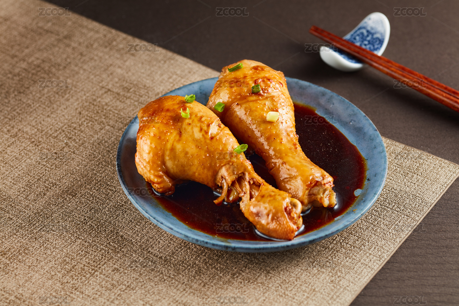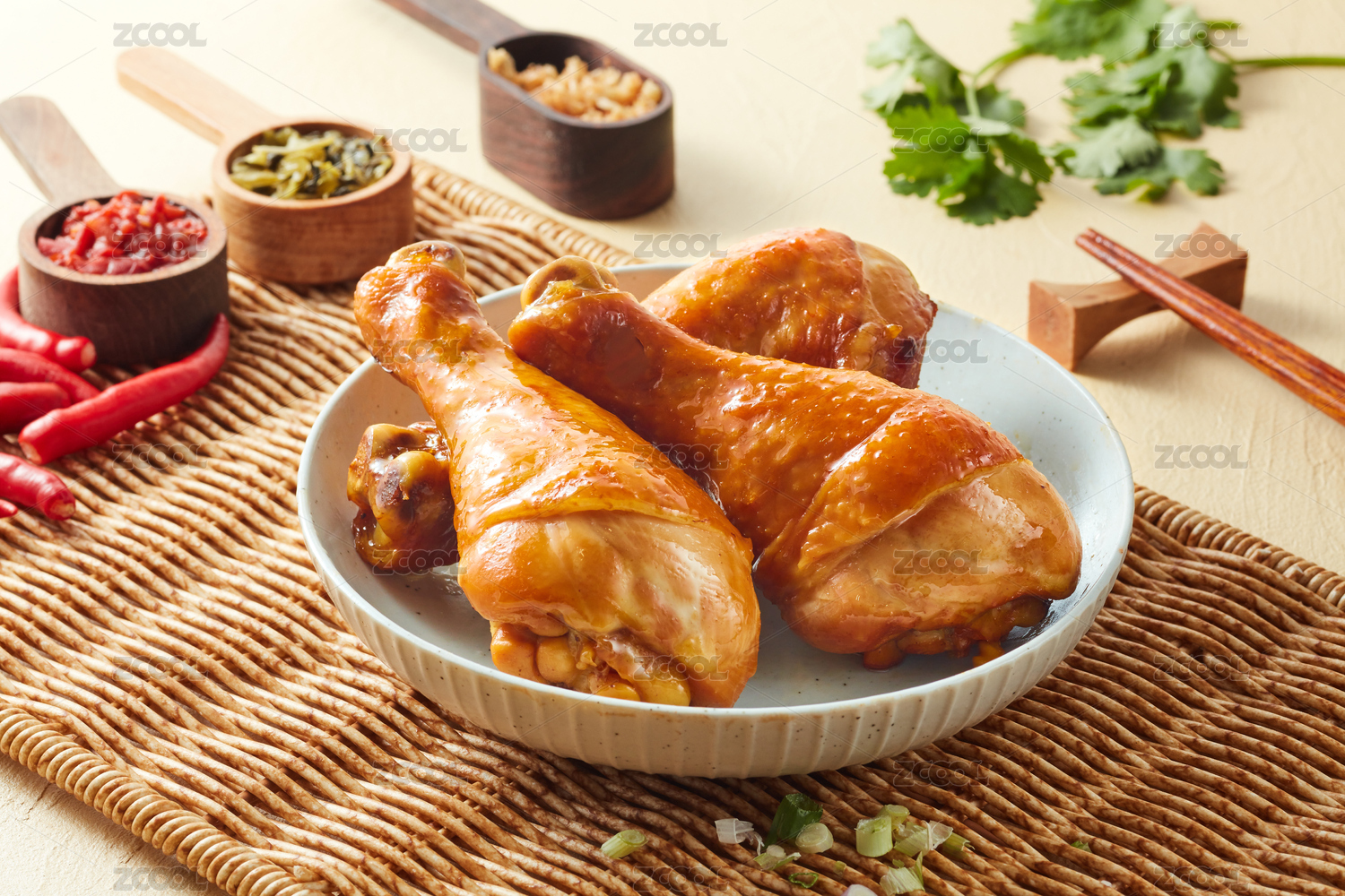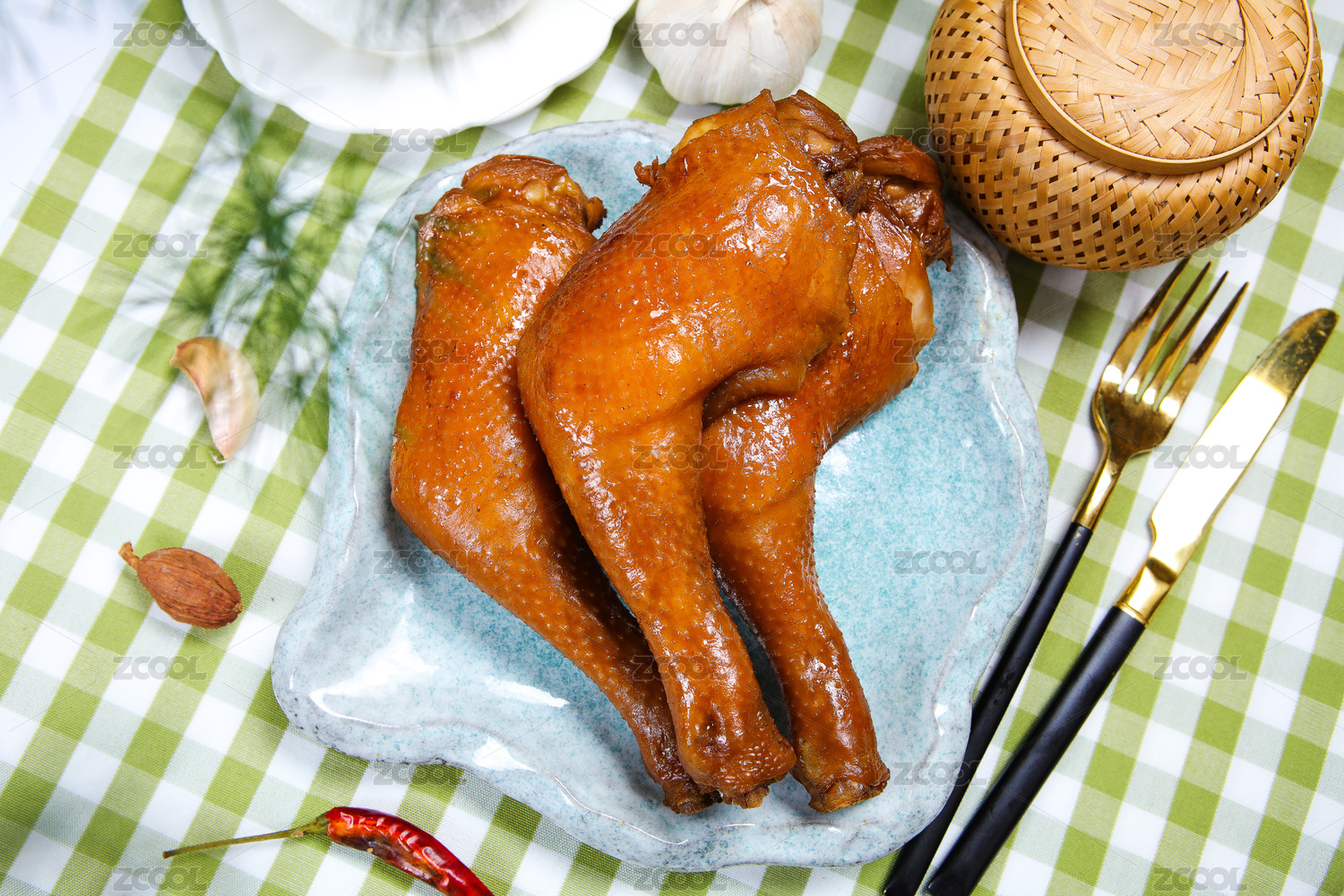 傳統(tǒng)背景下裝在碗里的三只鹵雞腿
