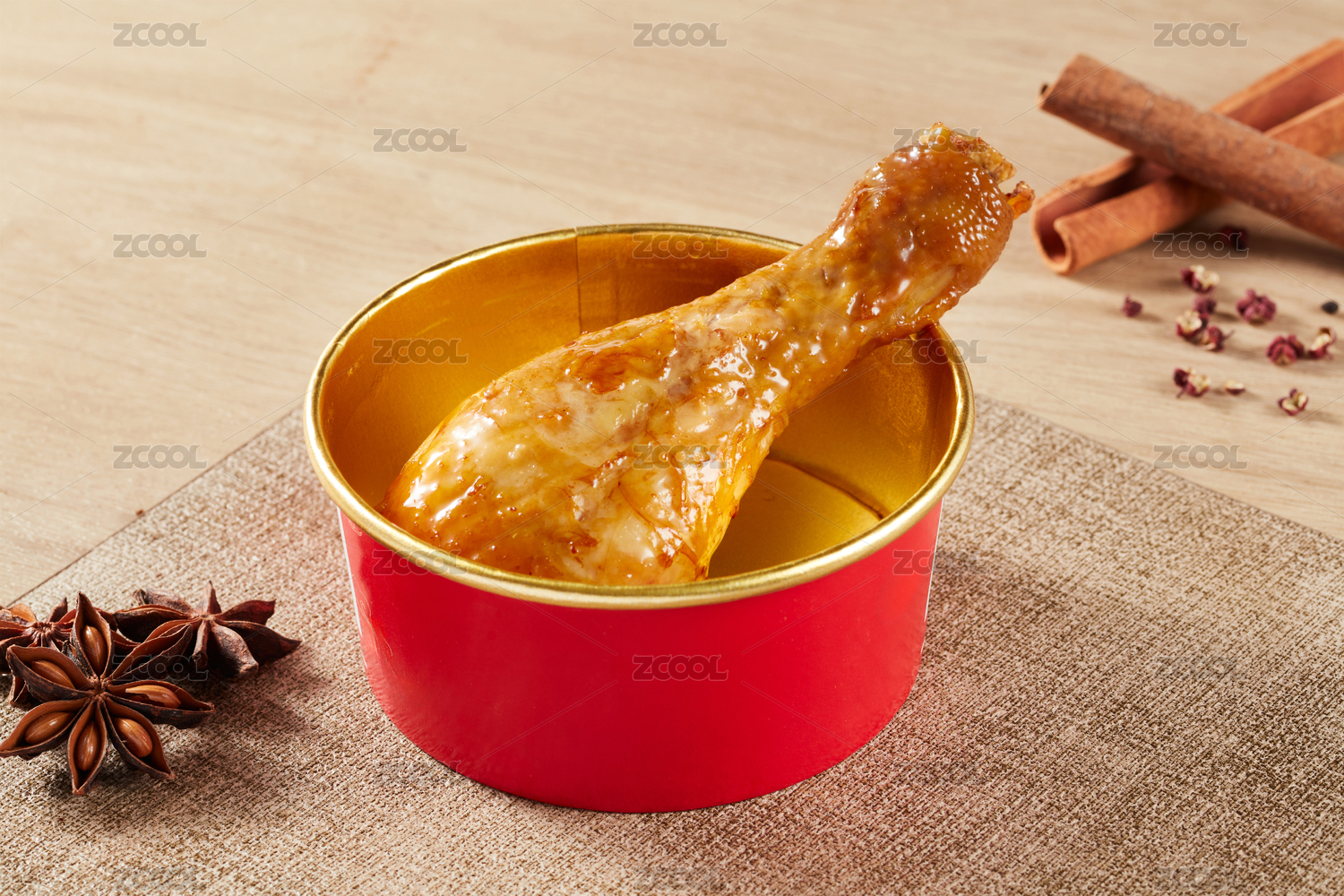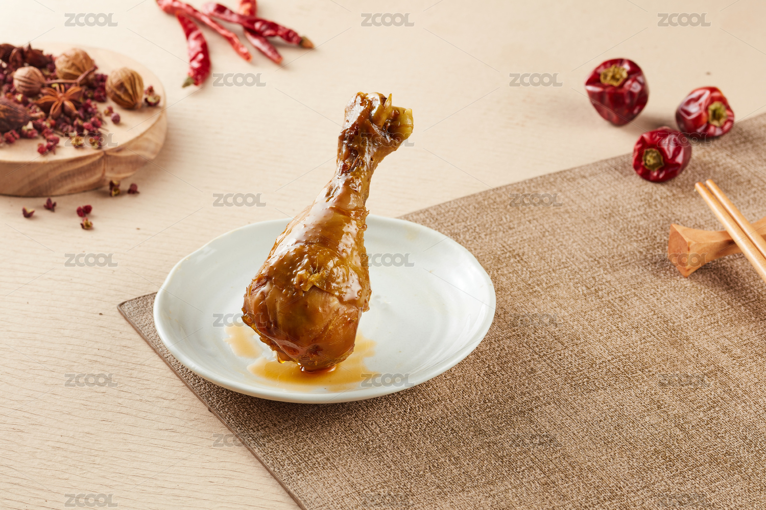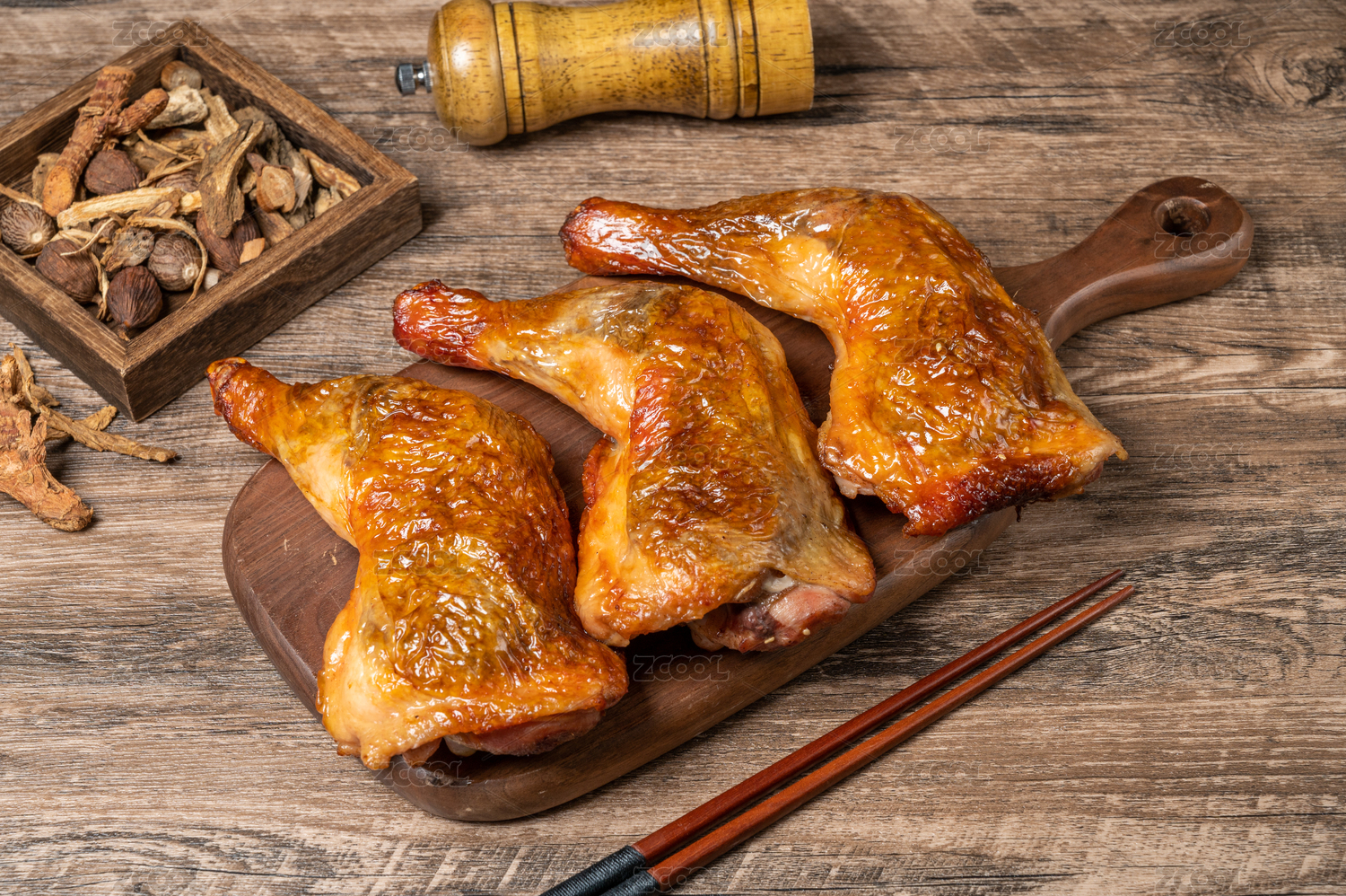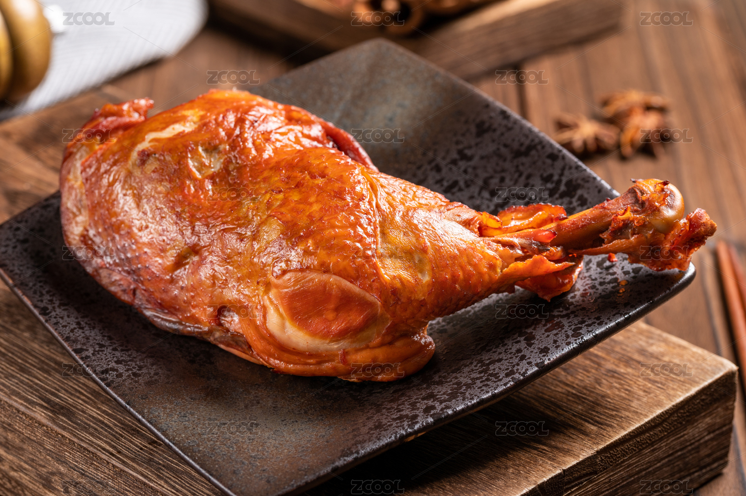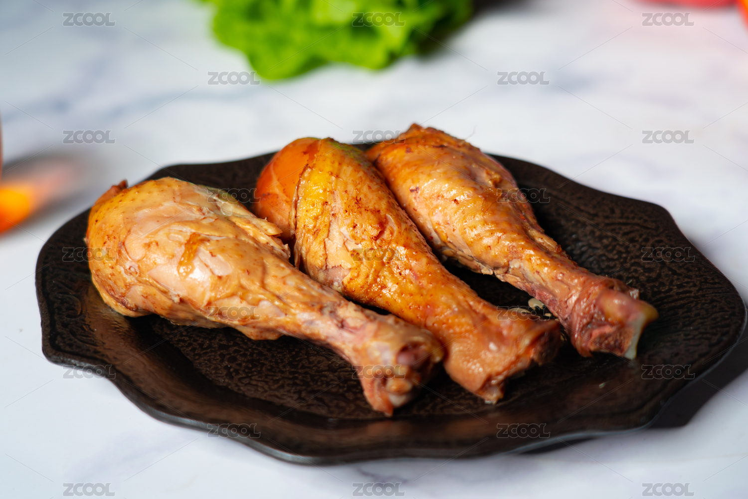 木紋桌上的鹵雞腿熟食