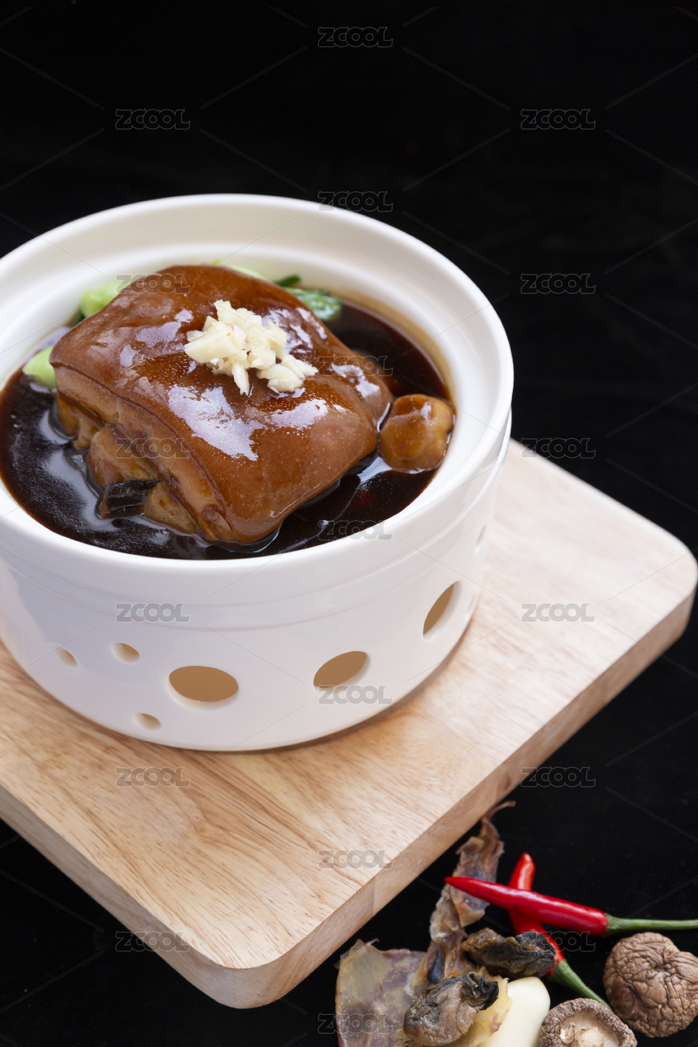 放在木頭案板上的一碗東坡肉
