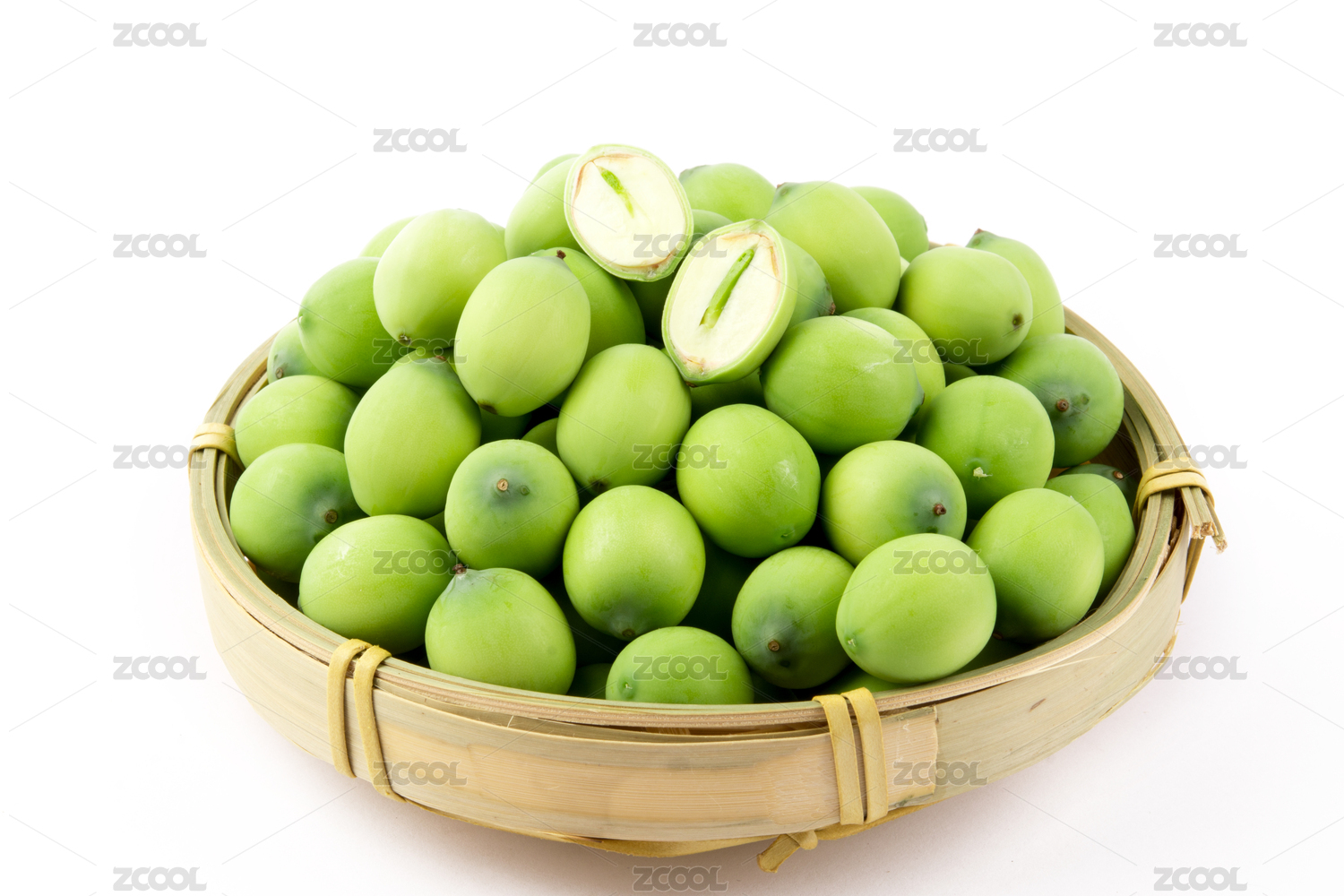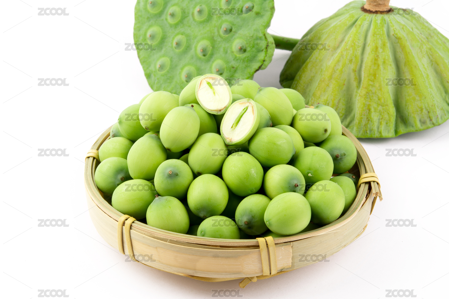 白色背景上放著一筐蓮子,蓮子上面放著一顆切開了能看到蓮心的蓮子