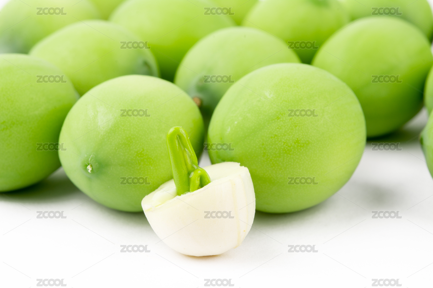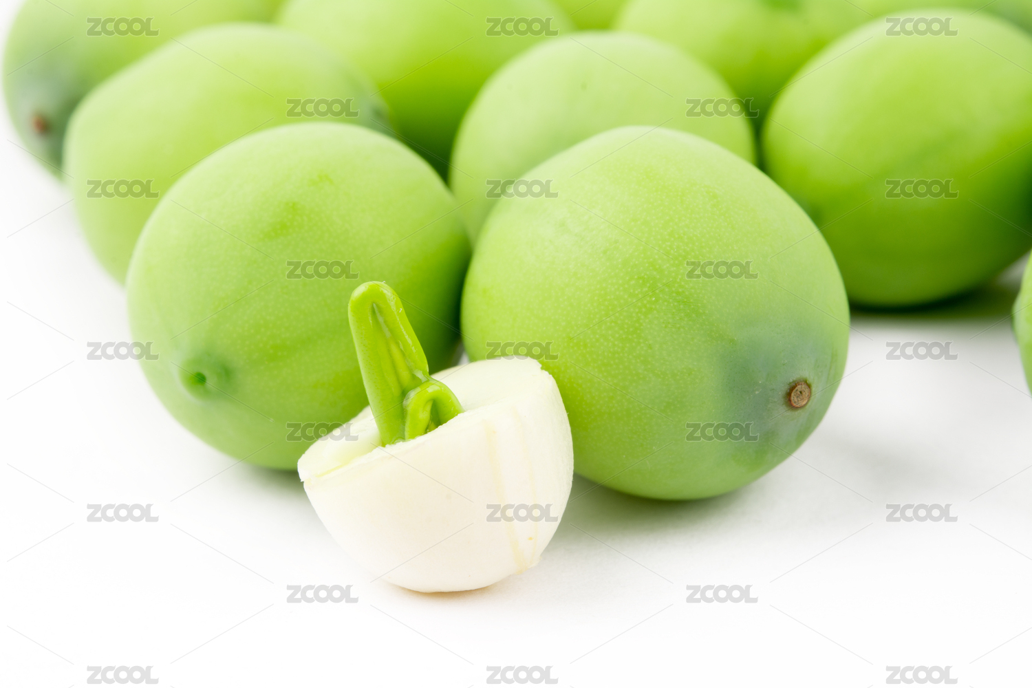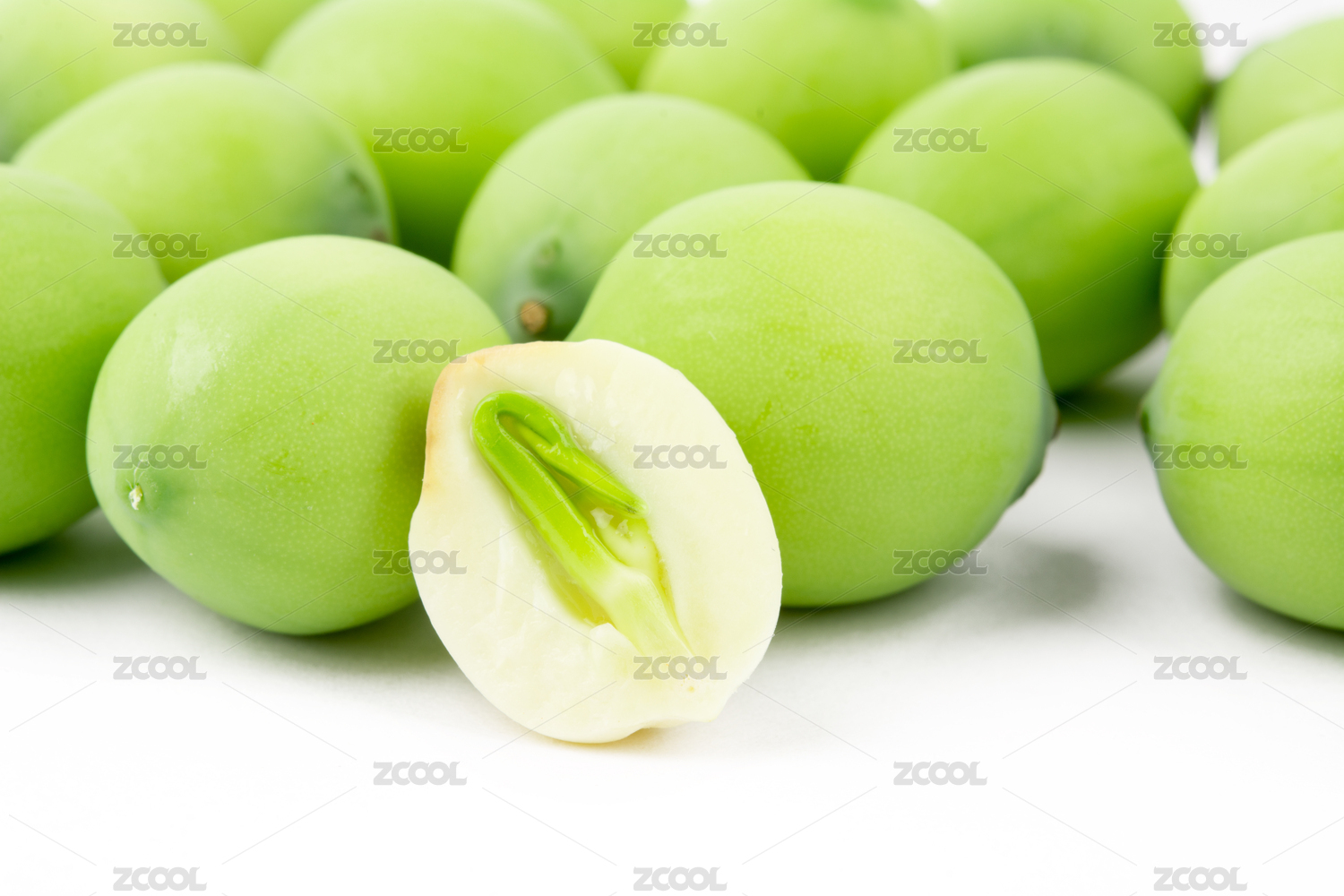 白色背景上放著一堆新鮮蓮子,蓮子前面放著切開能看到蓮心的蓮子