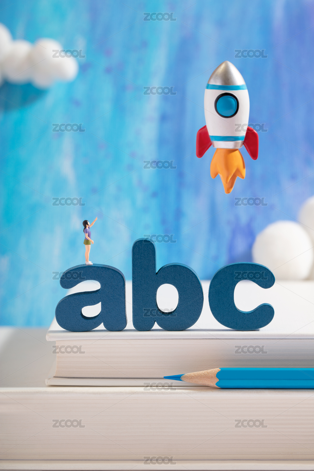 微縮創(chuàng)意書本上的字母abc和學(xué)英語(yǔ)的學(xué)生
