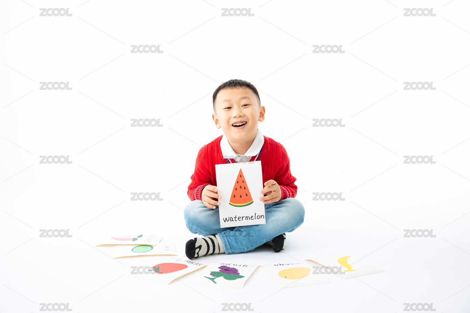 室內(nèi)白色背景男孩拿著英語(yǔ)卡片學(xué)英語(yǔ)