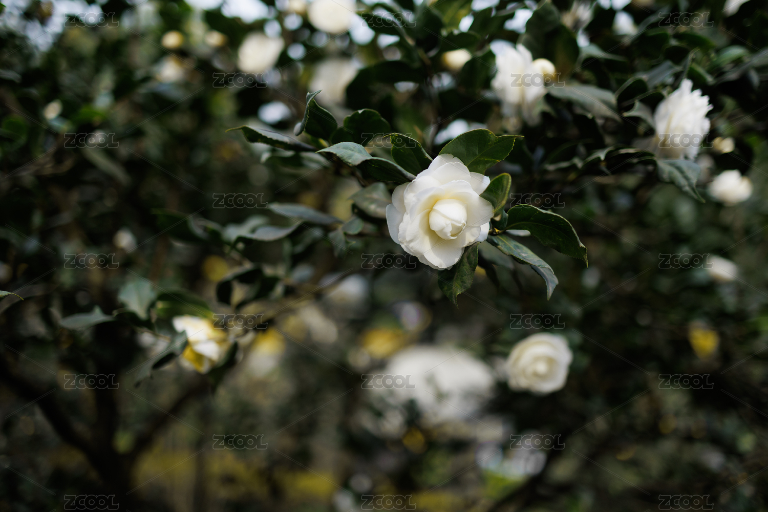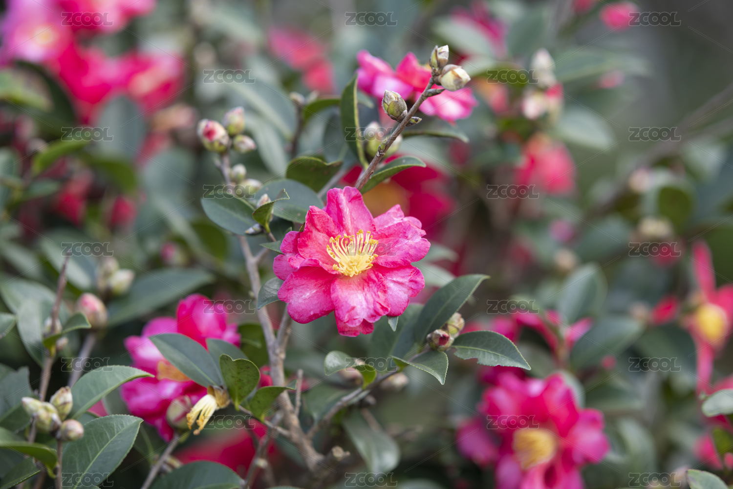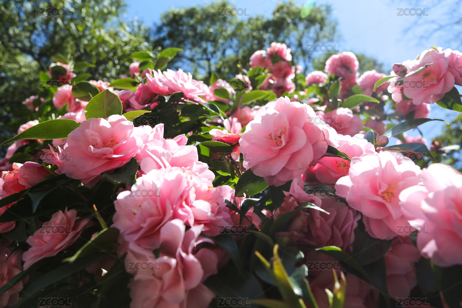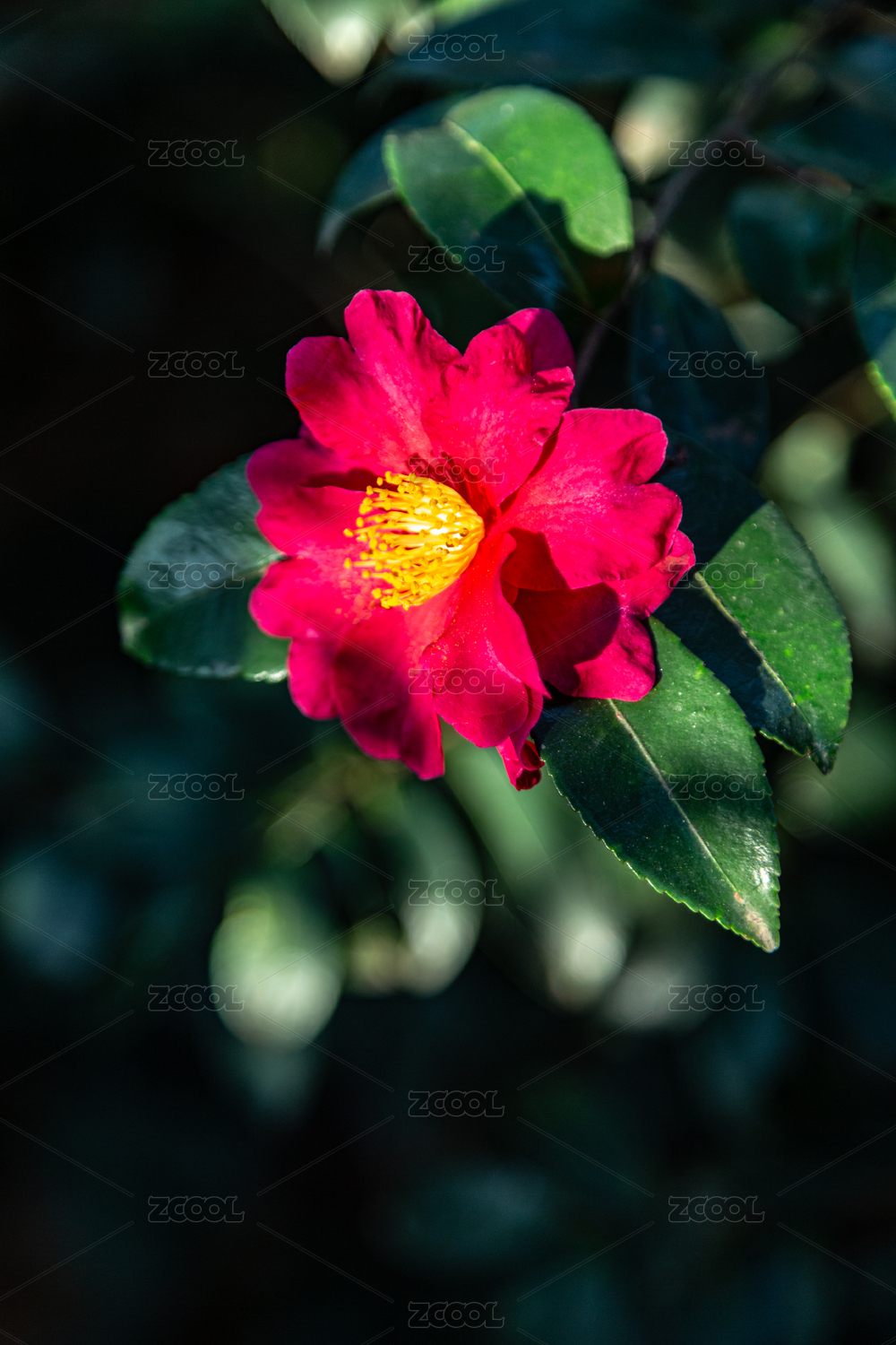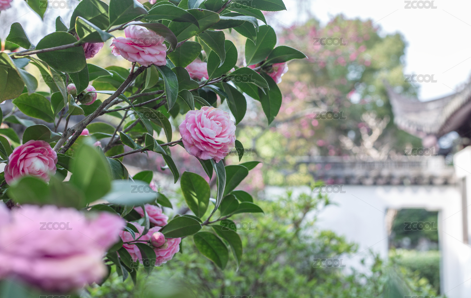 上海青浦曲水園春天山茶花盛開(kāi)的景色