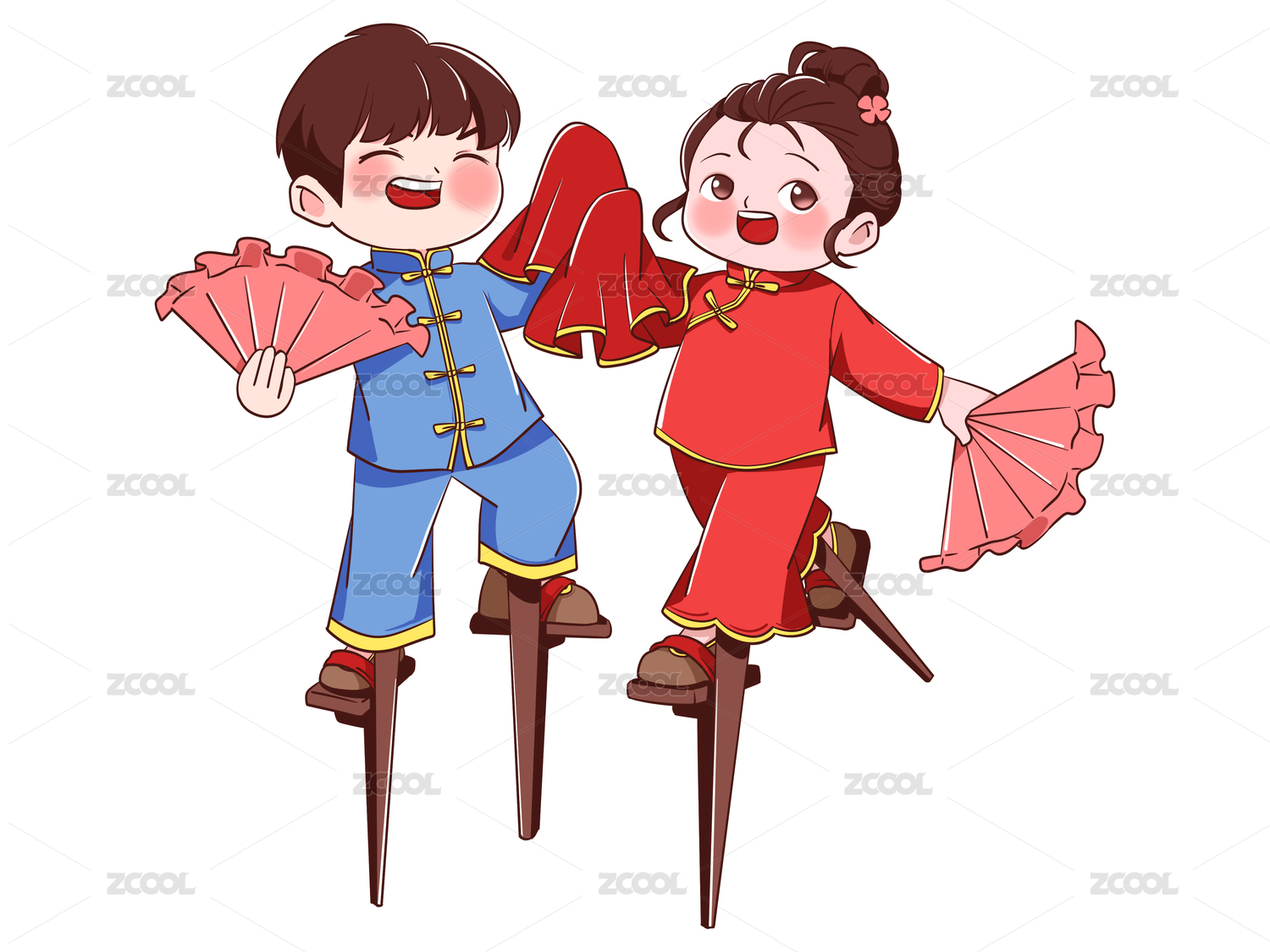 踩著高蹺跳秧歌開心男孩女孩手拿扇子踩高蹺