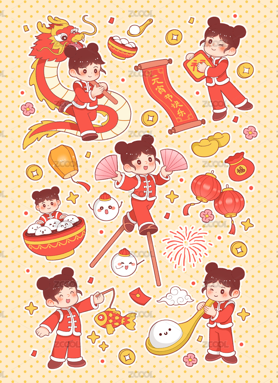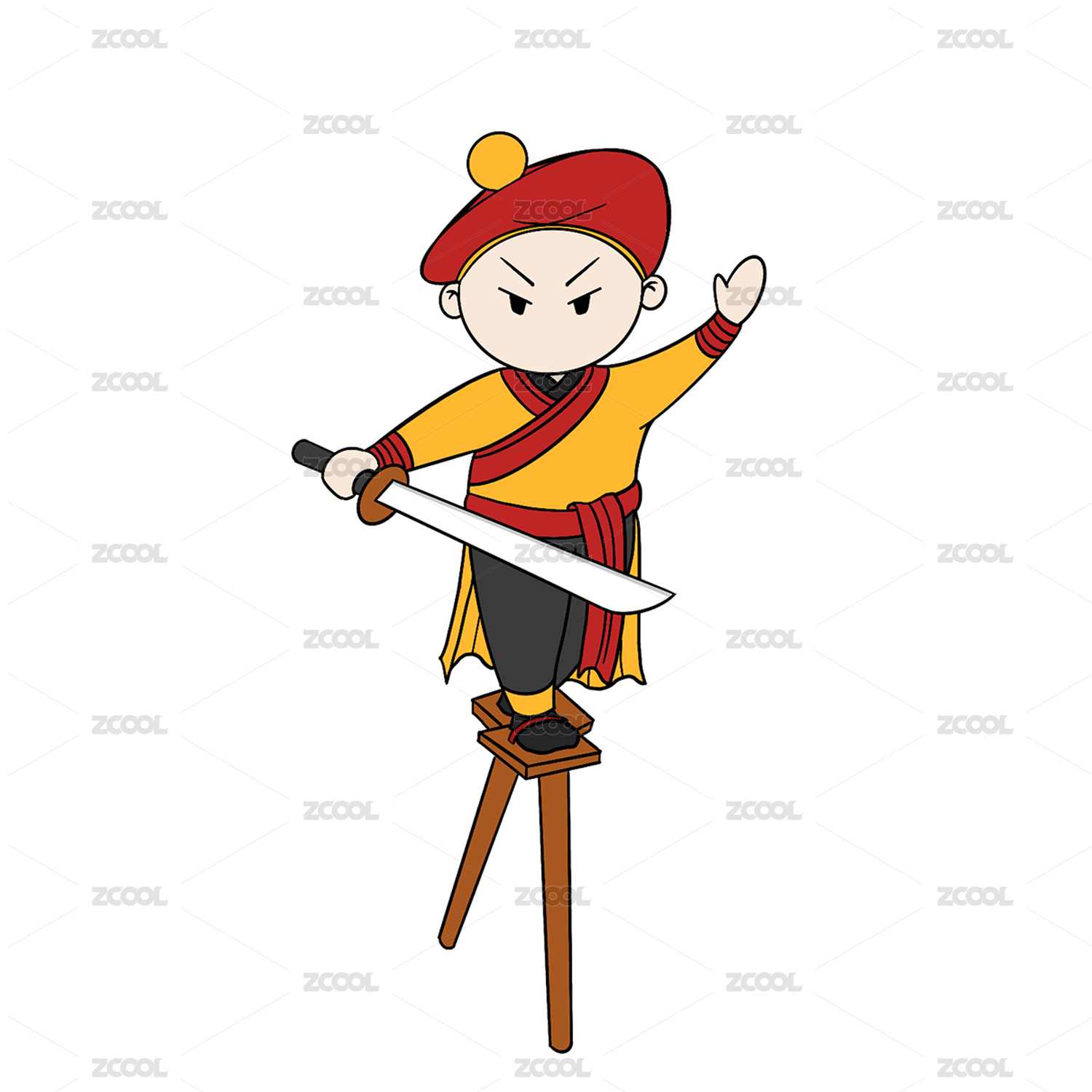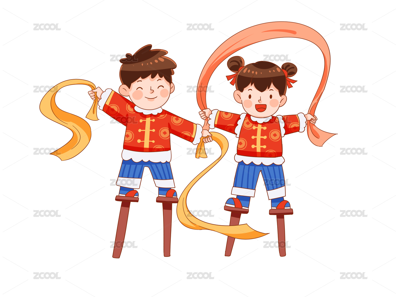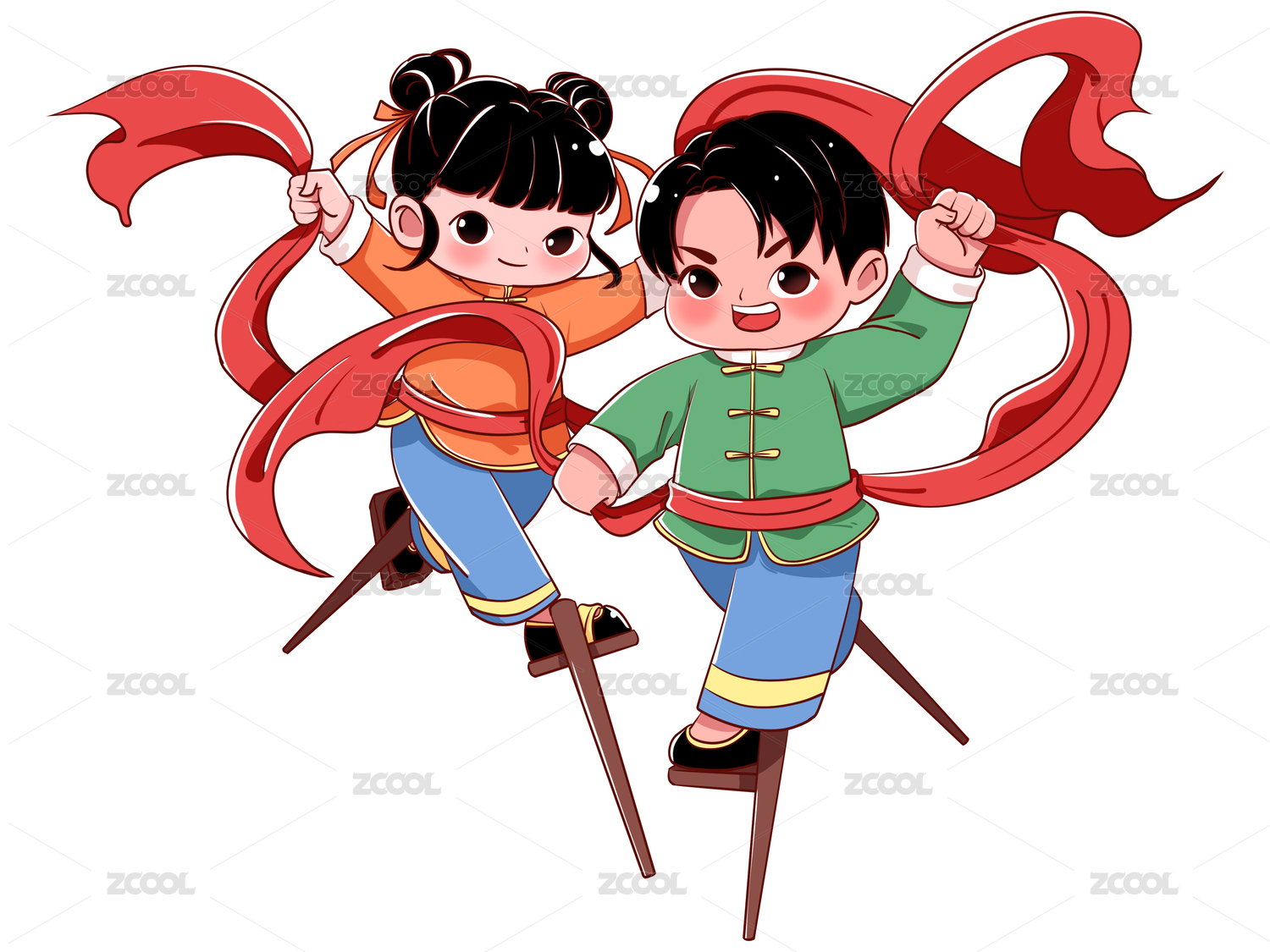 紅色卡通開心兒童踩高蹺拿絲巾跳秧歌元素