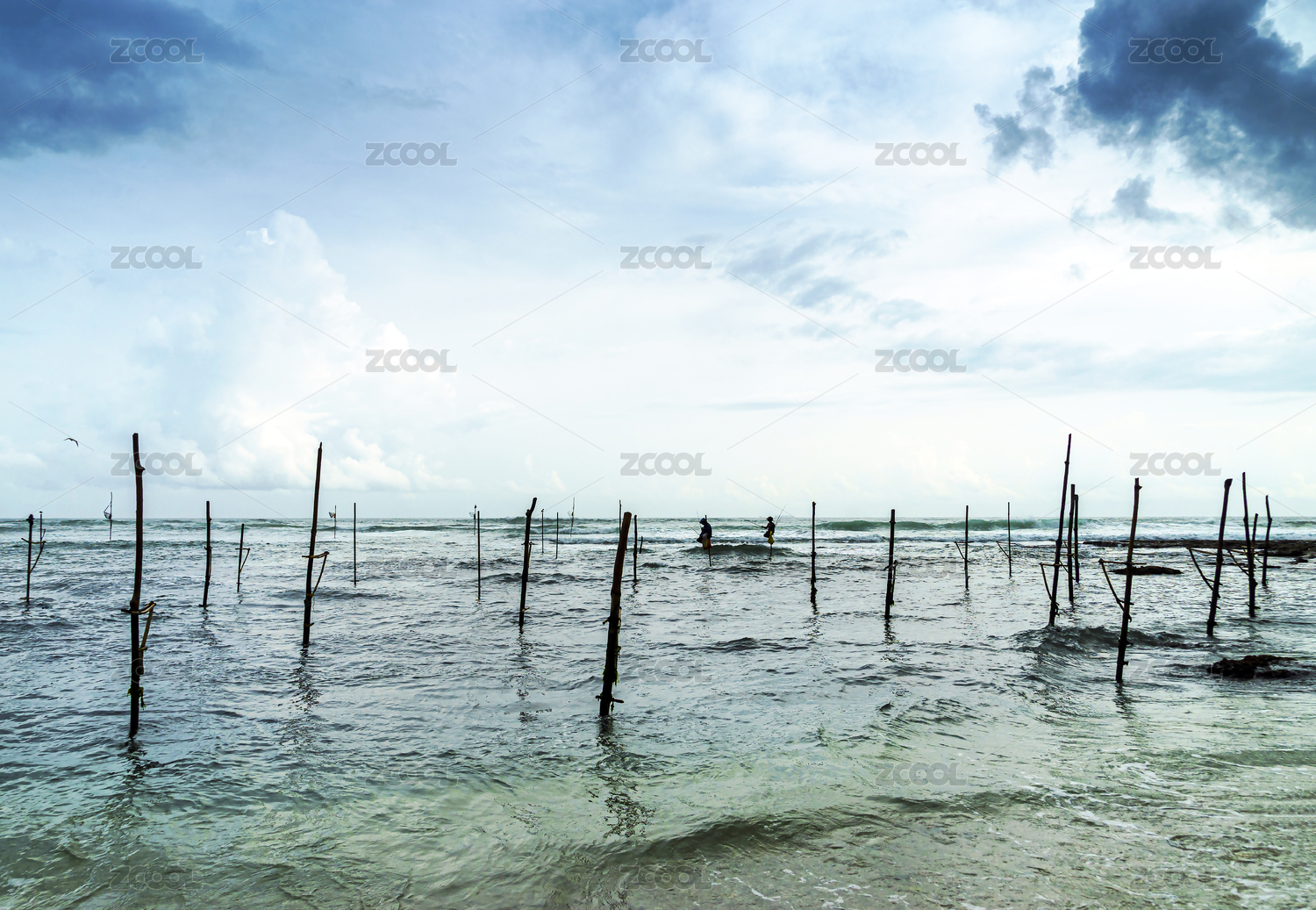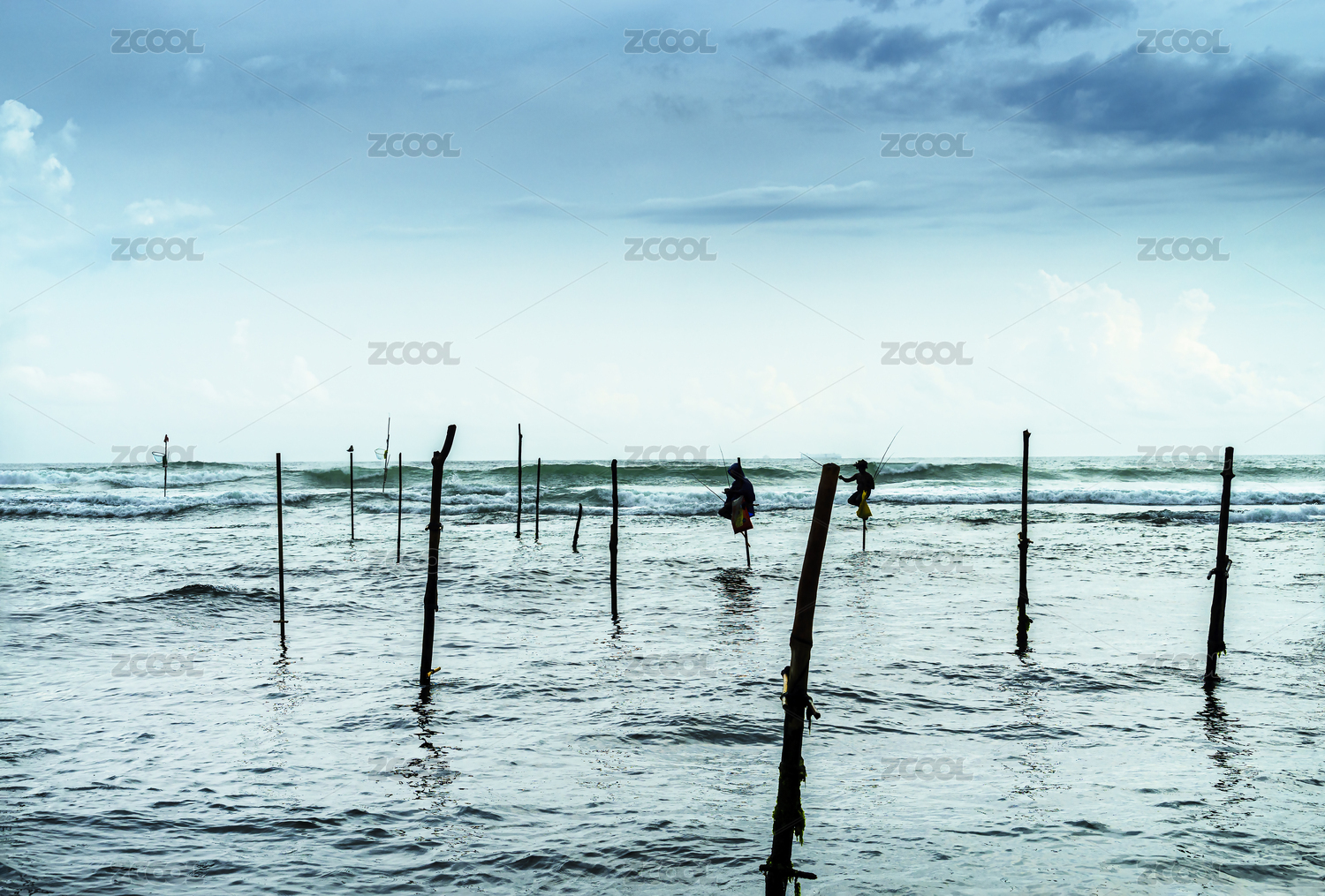 斯里蘭卡雨季加勒高蹺海灘釣魚風光