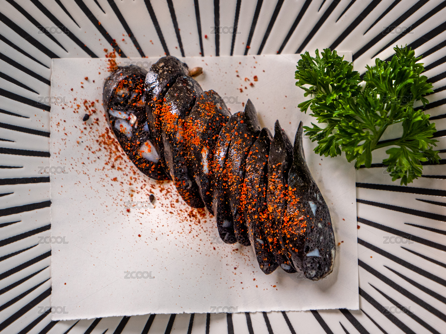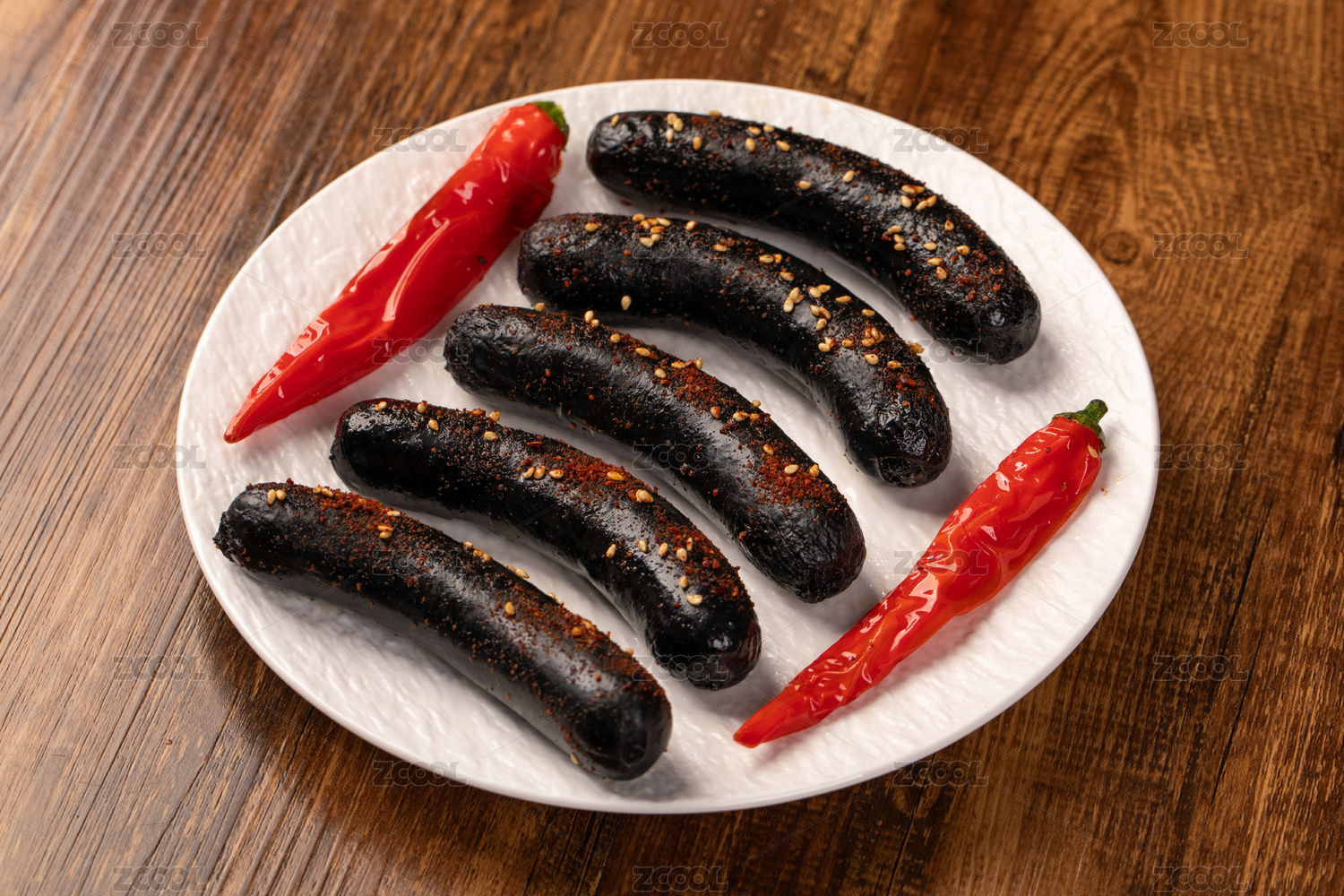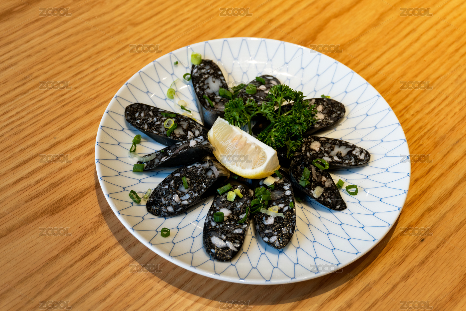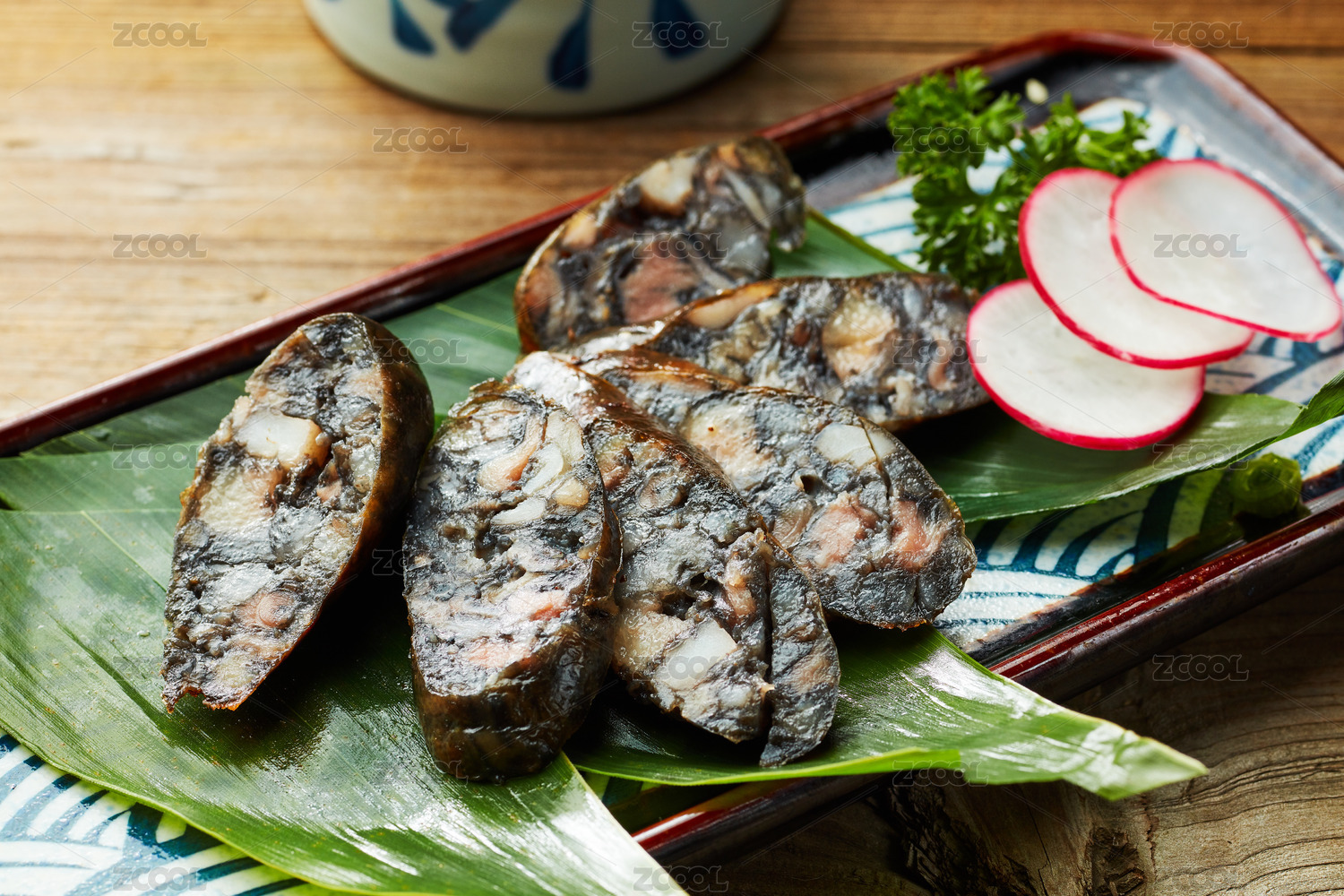 一盤(pán)墨魚(yú)腸食材擺盤(pán)放桌子上