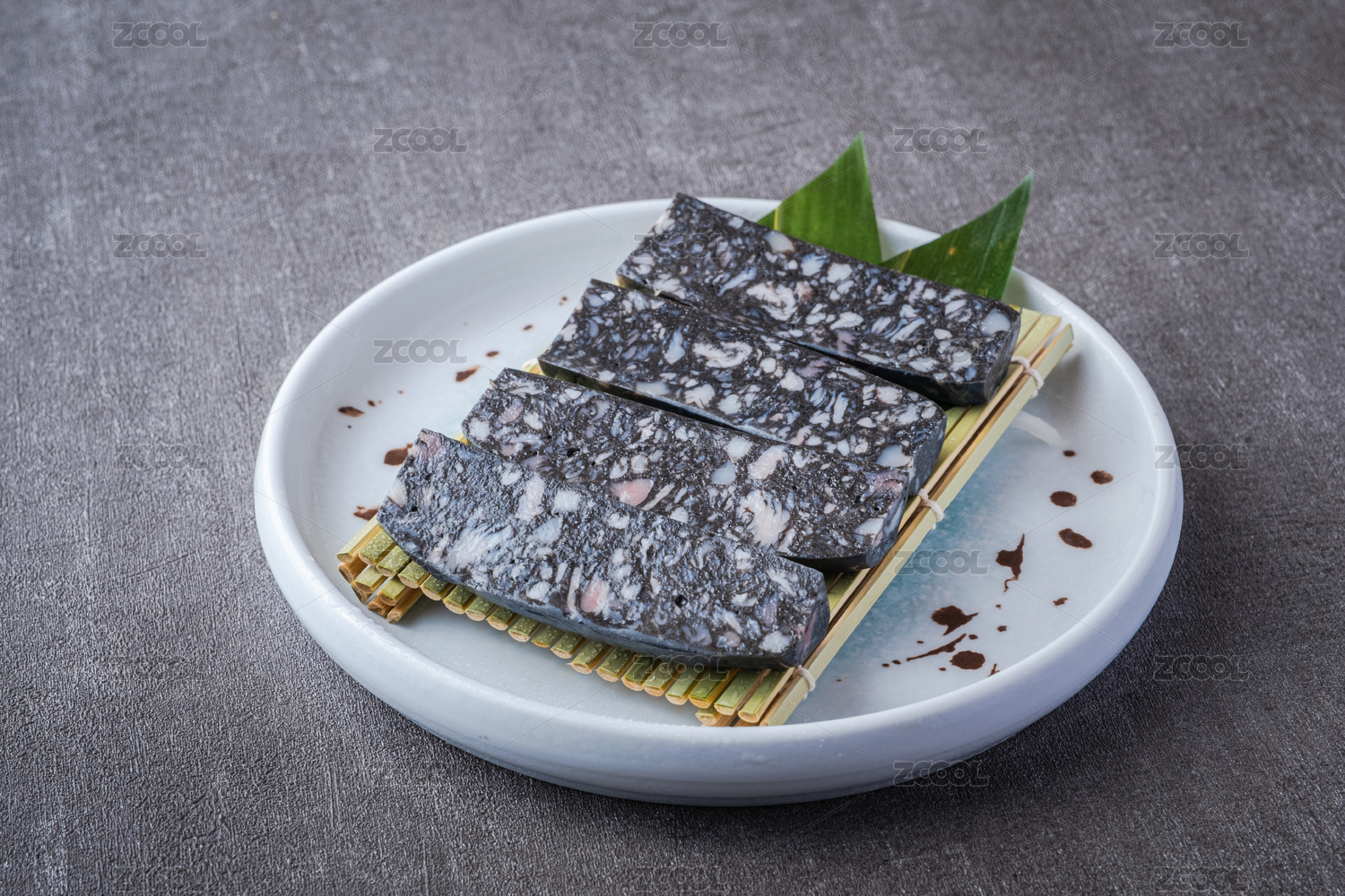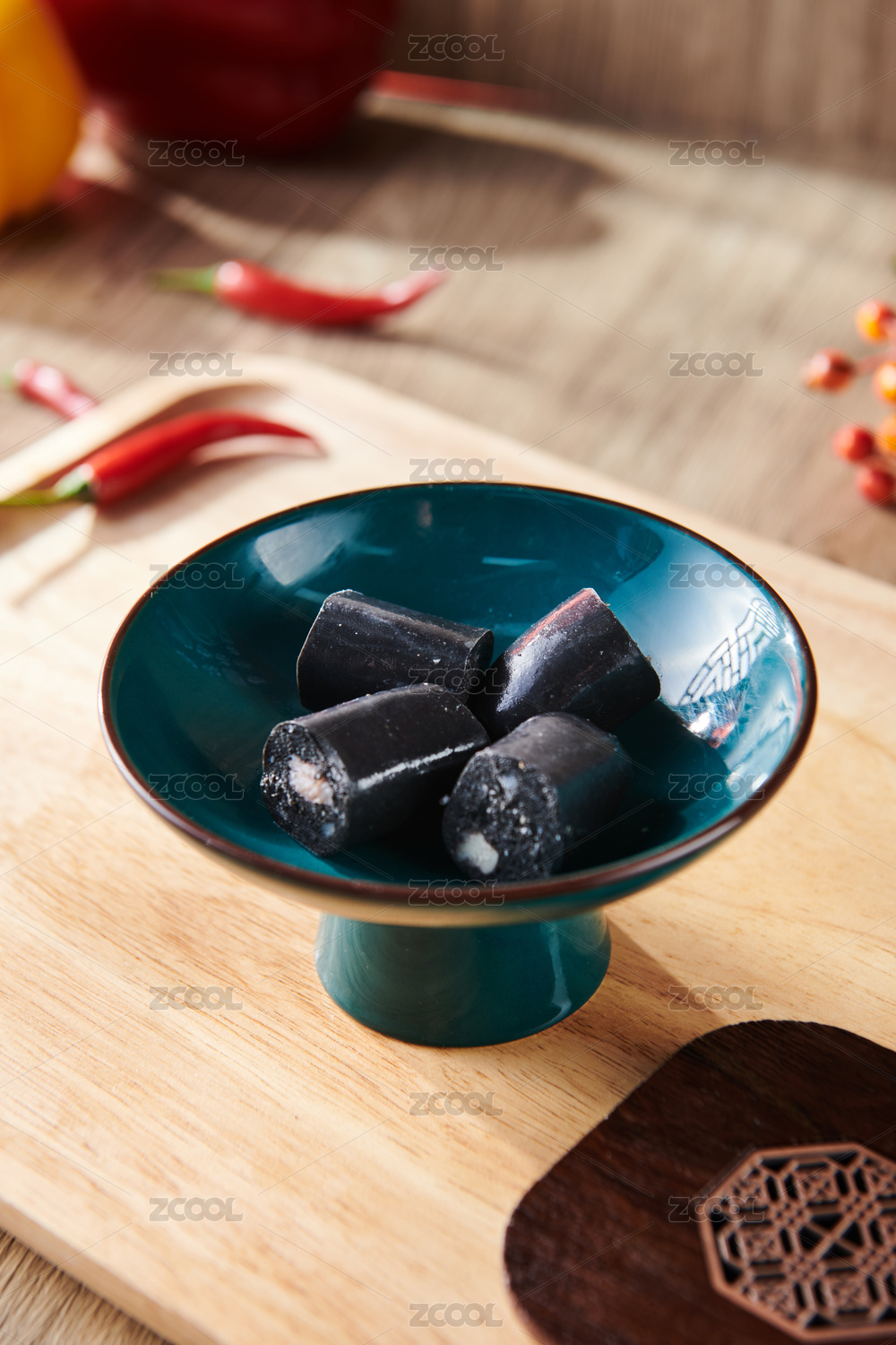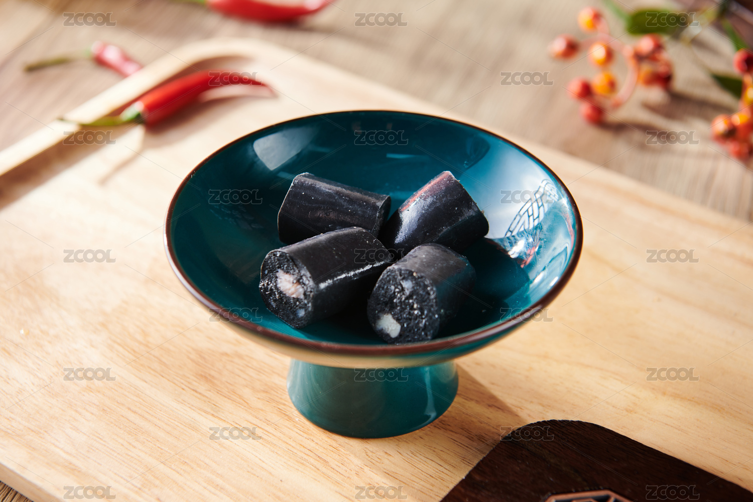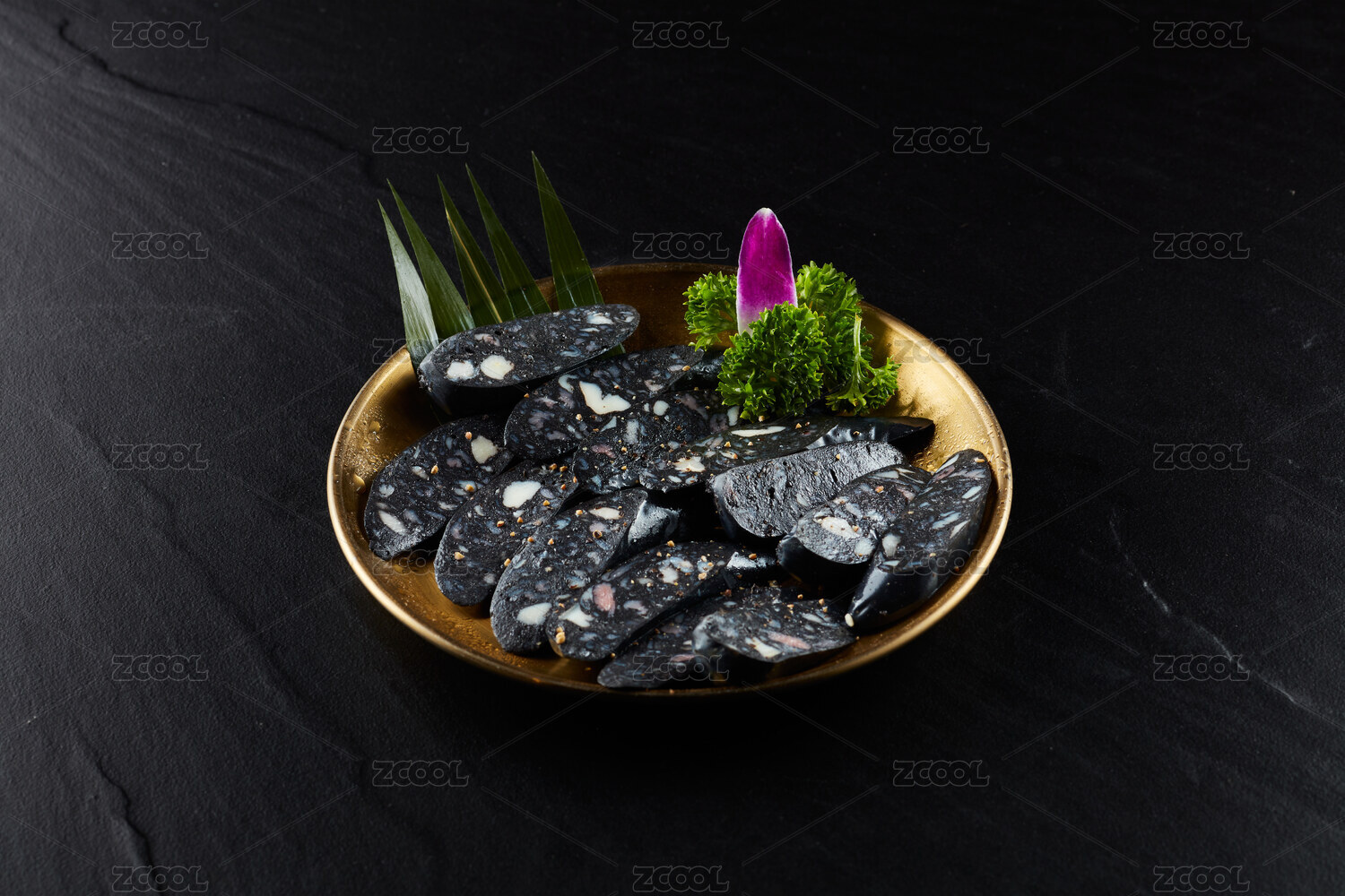 一盤(pán)墨魚(yú)腸食材擺盤(pán)放桌子上