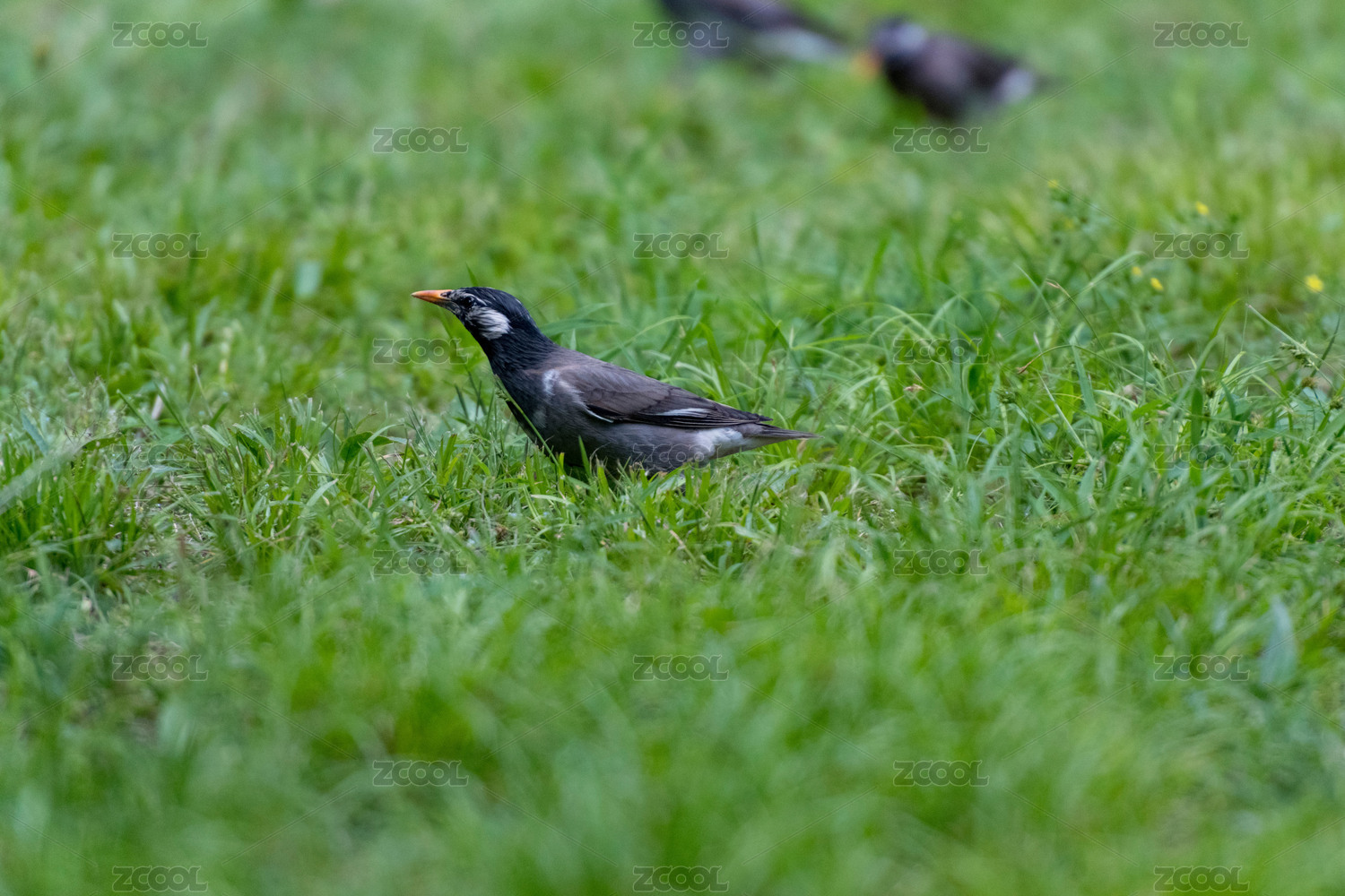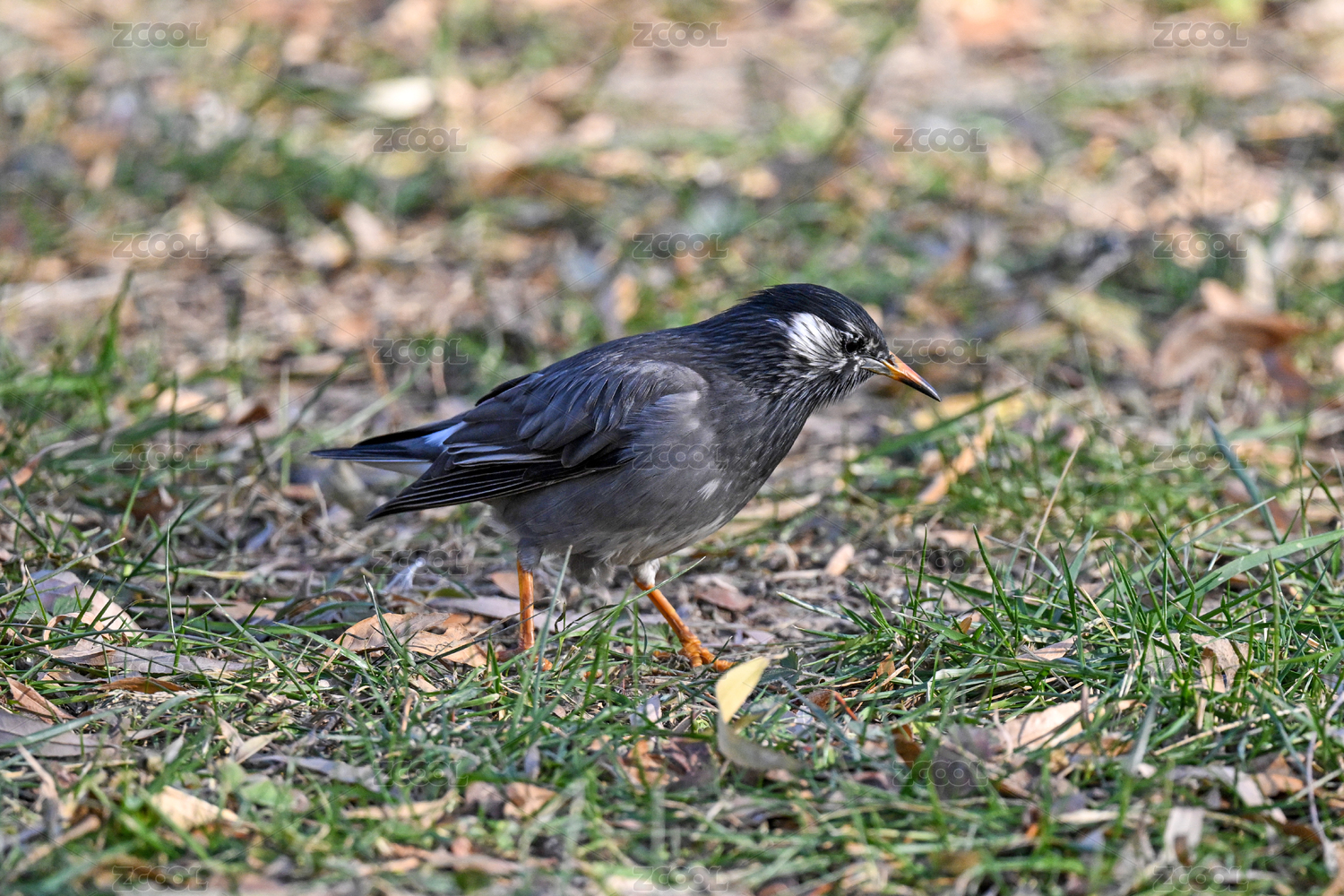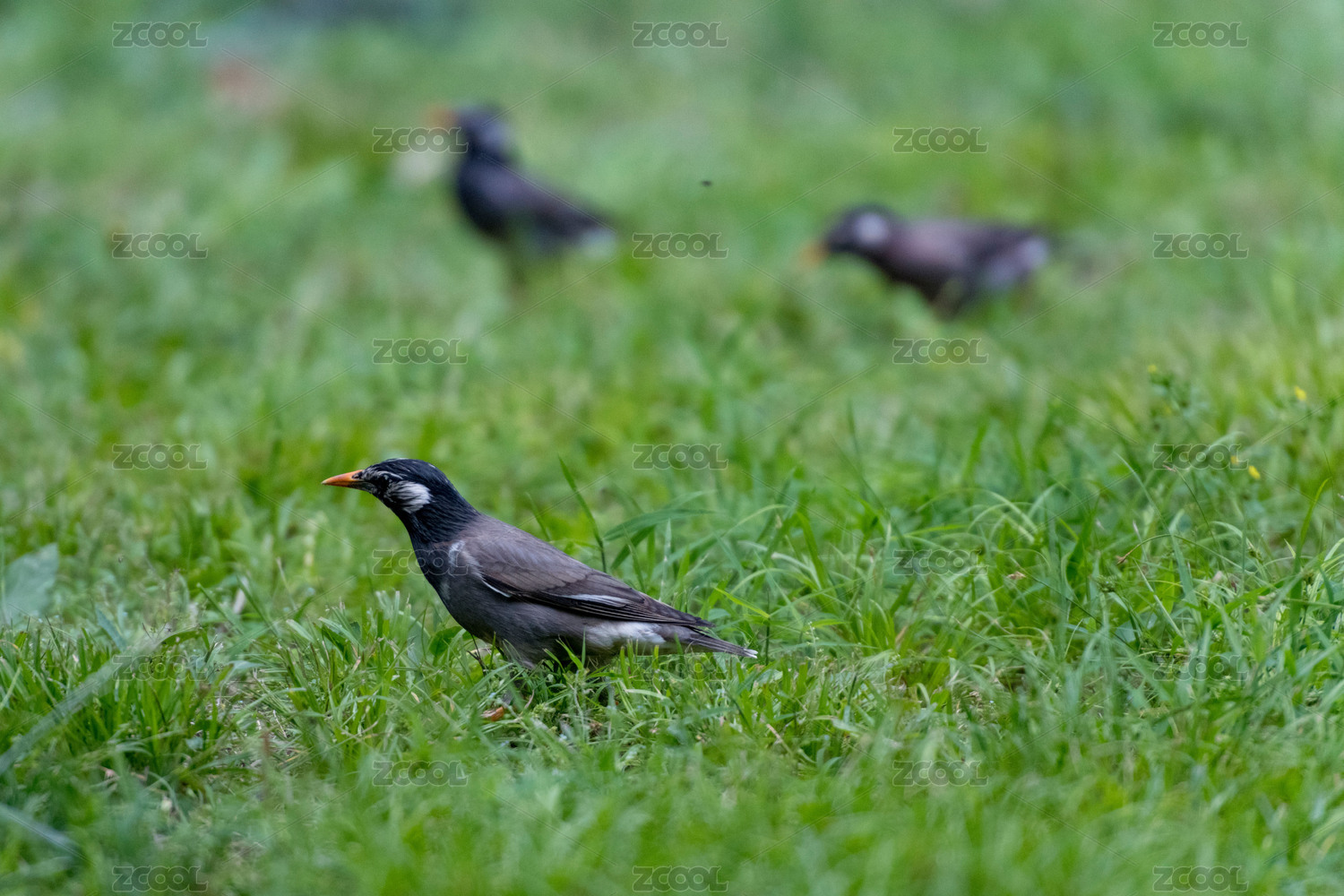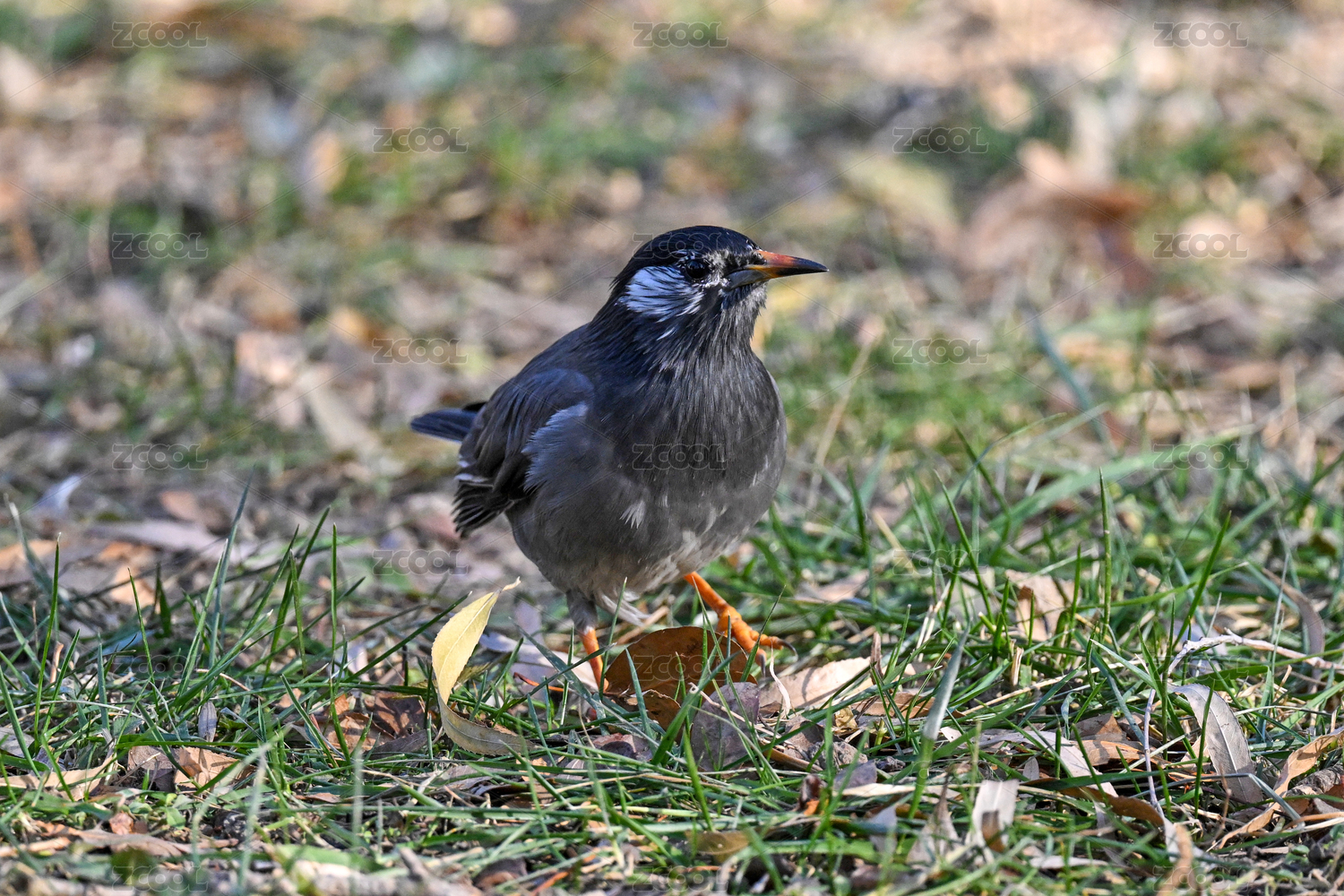 站在草地上覓食的灰椋鳥特寫