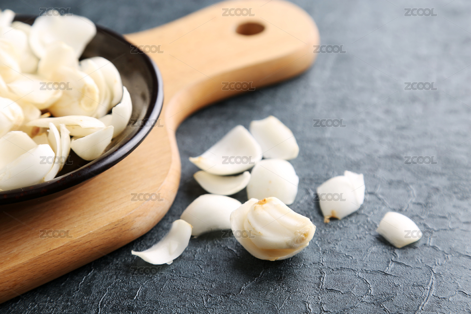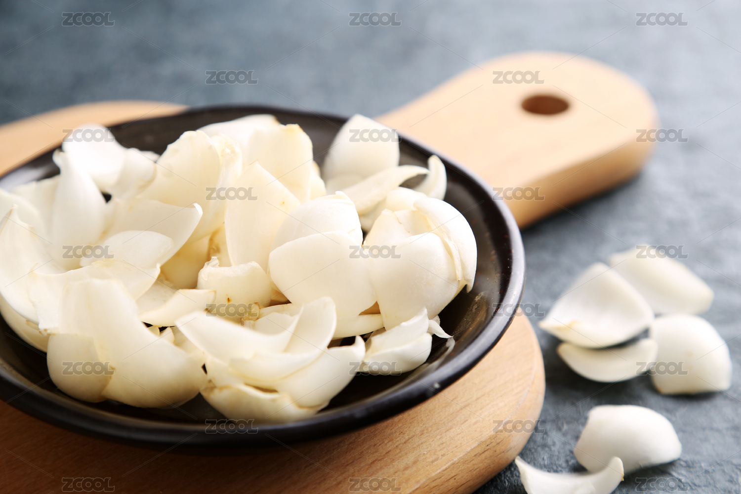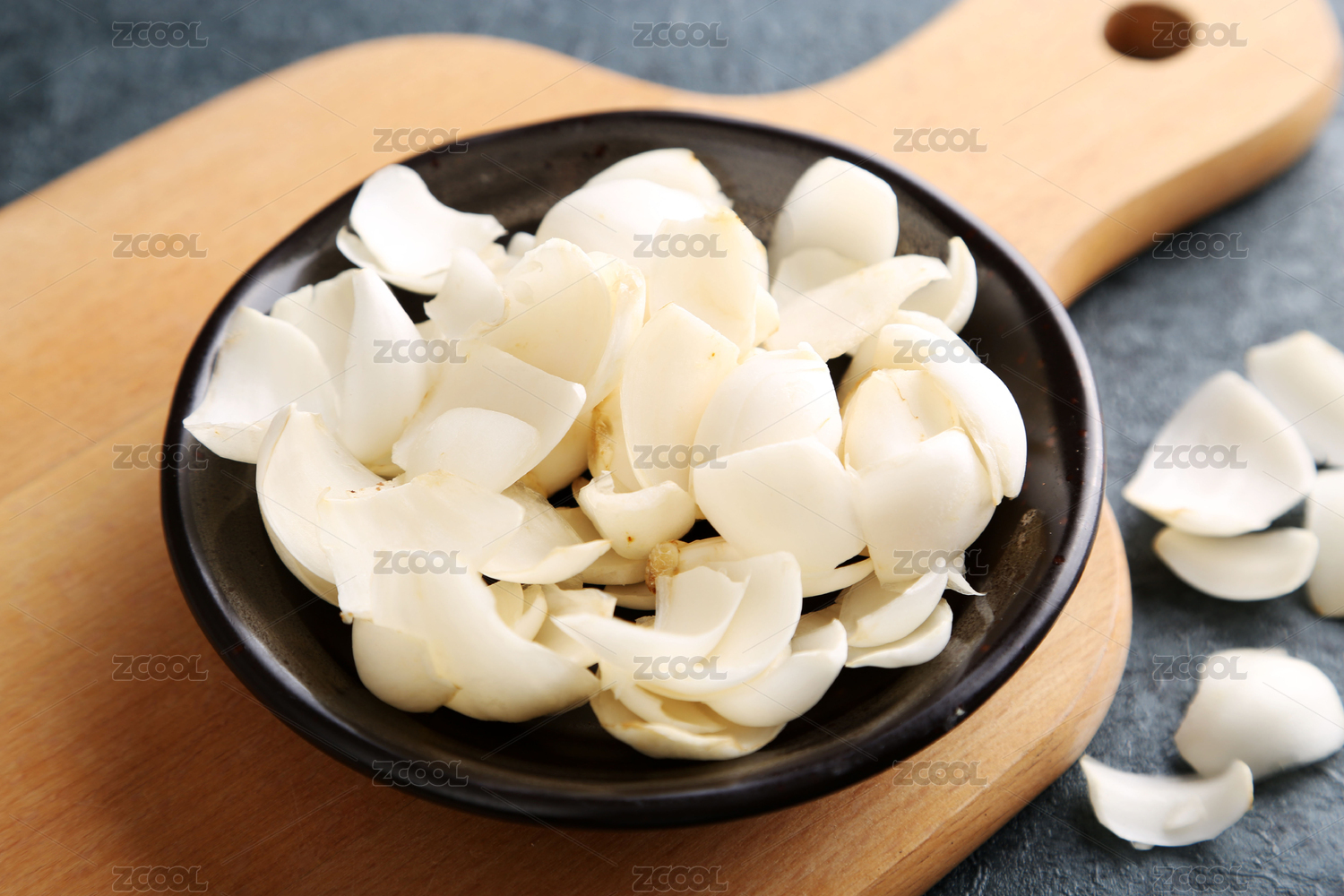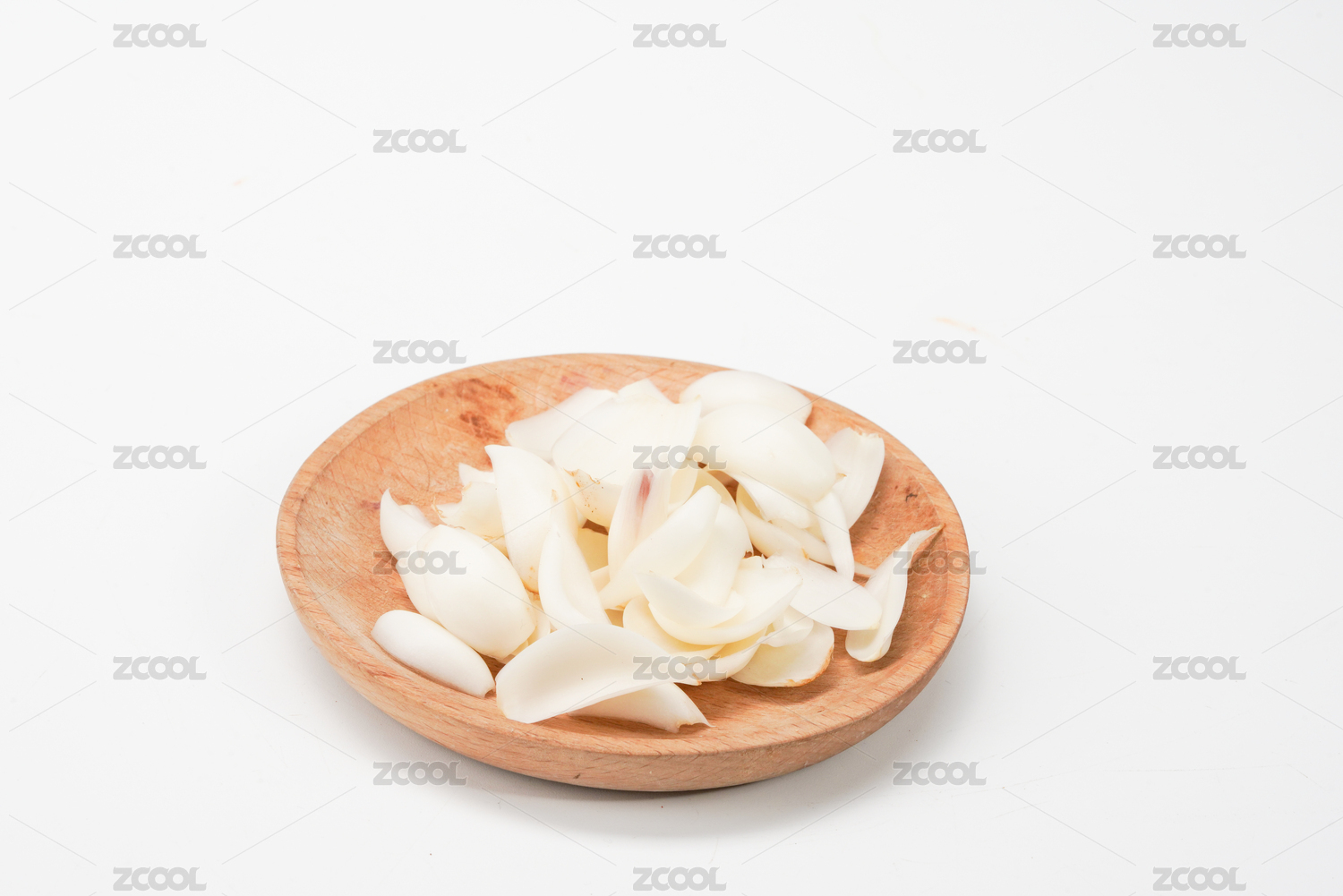 放在木紋背景木盤上的新鮮百合瓣