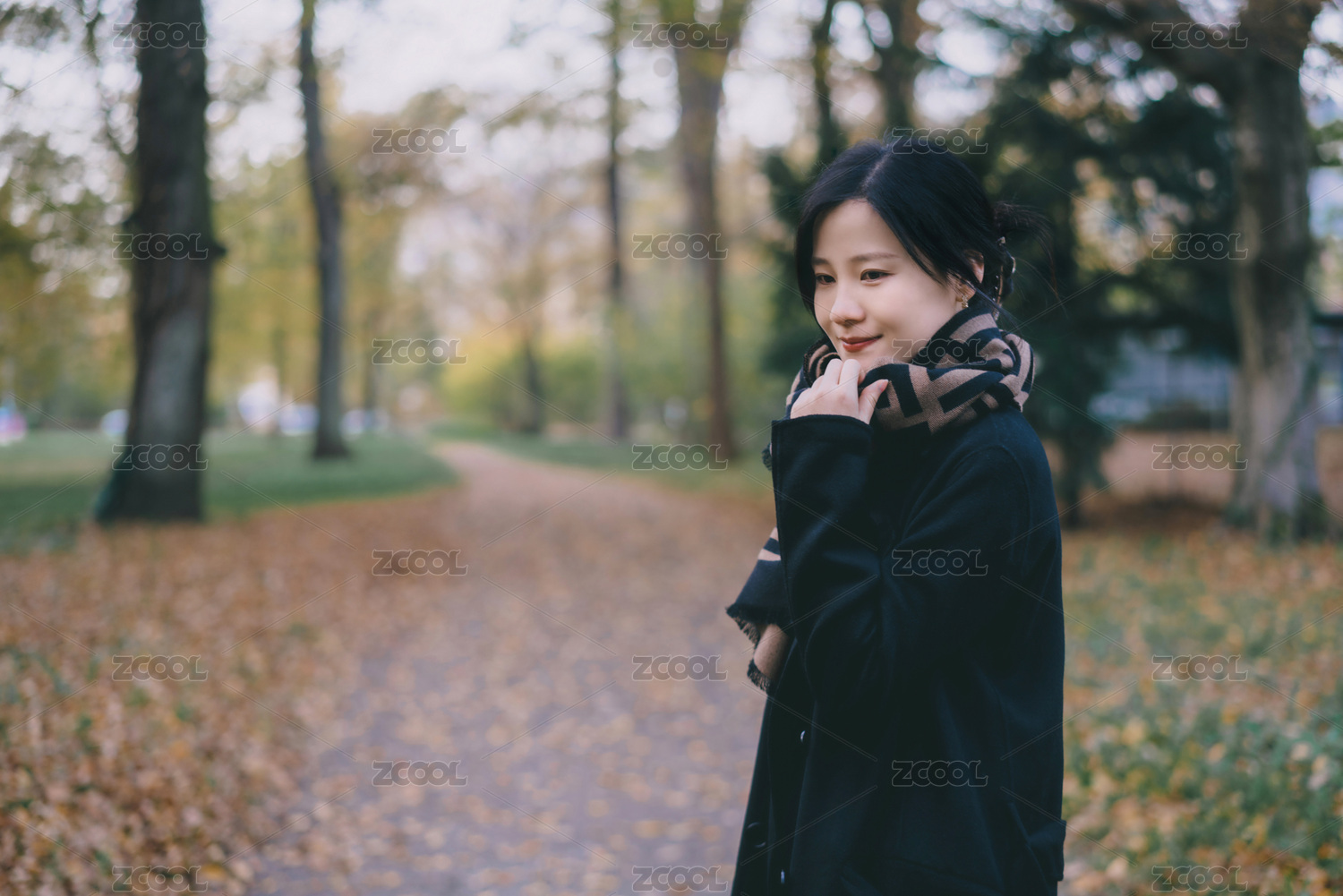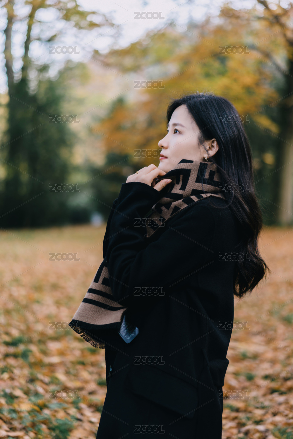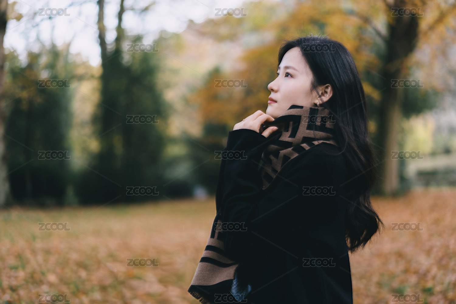 穿黑色大衣和圍巾的女孩,在深秋落葉森林里