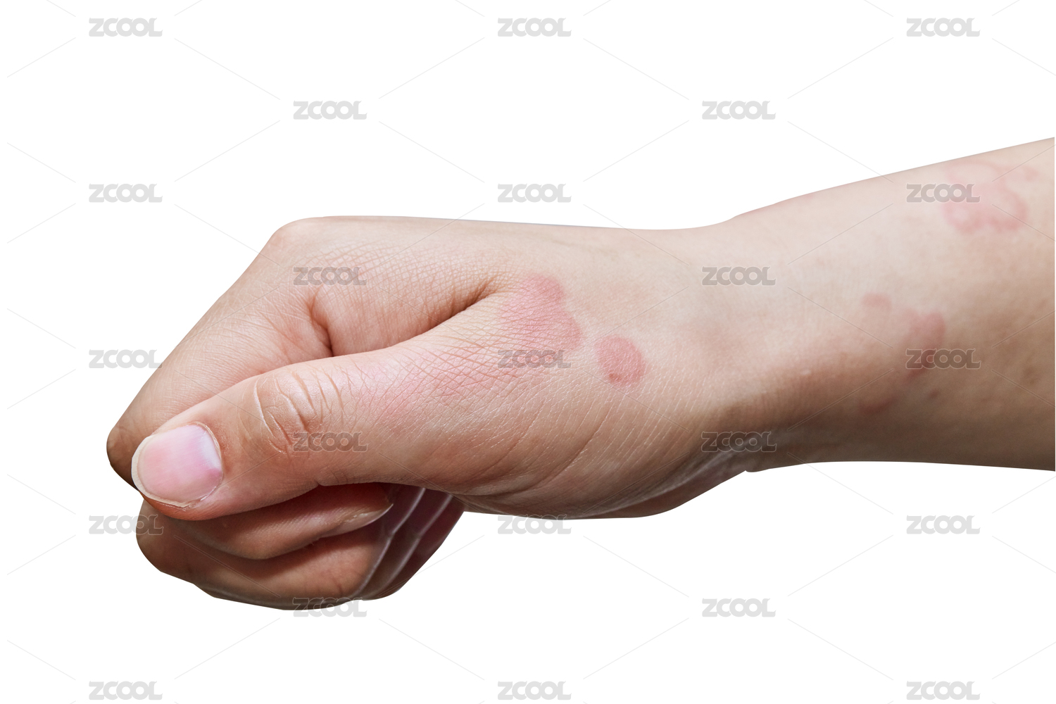 手背皮膚上的過敏性皮炎癥狀和蕁麻疹紅腫