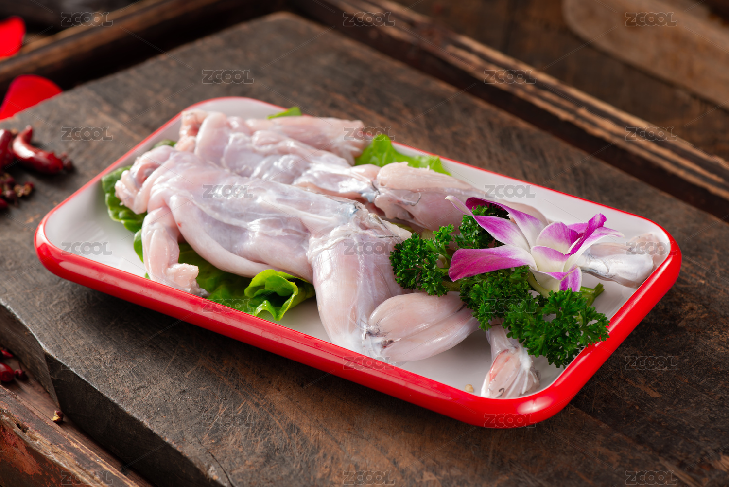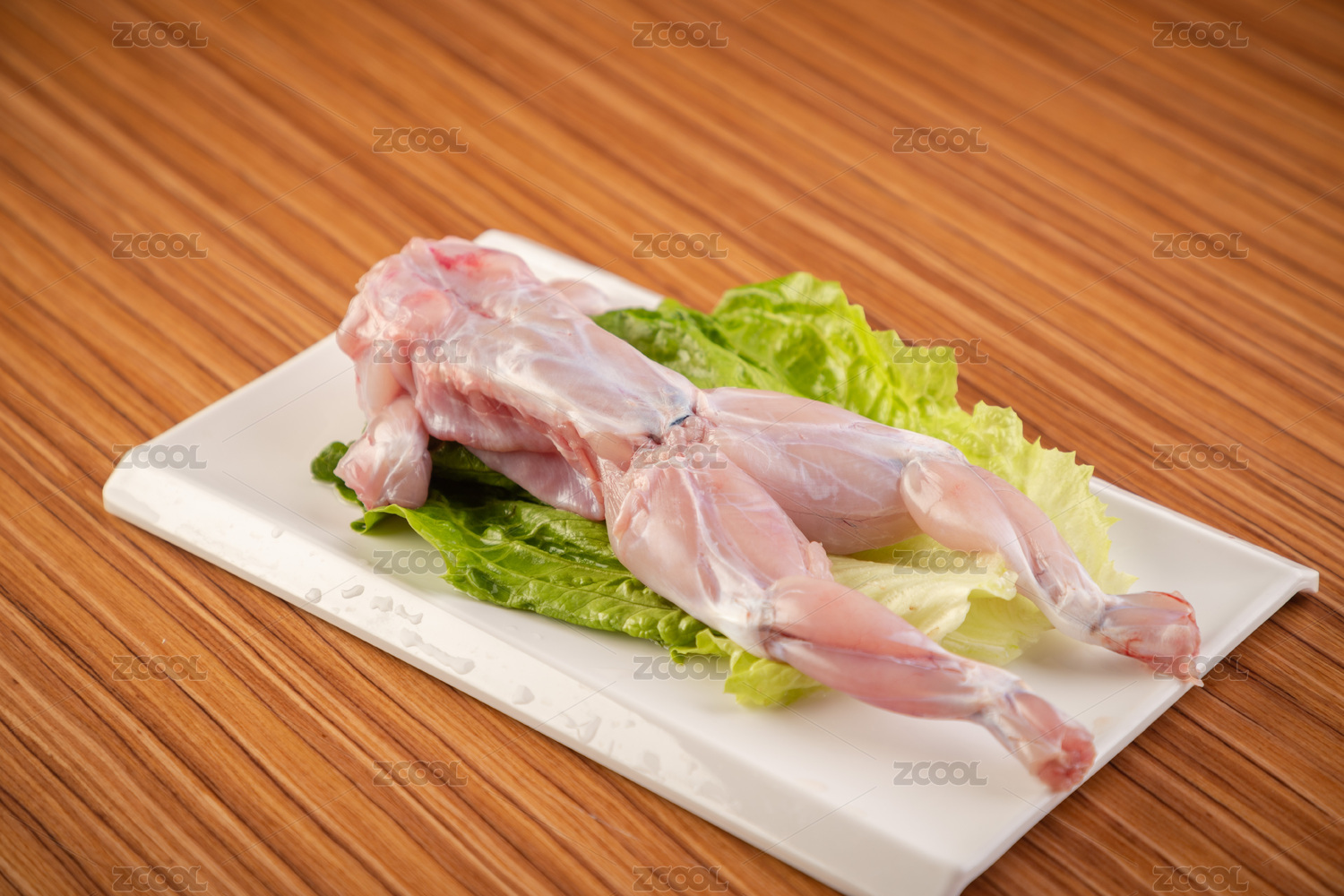 淺色木紋板上放著一盤牛蛙