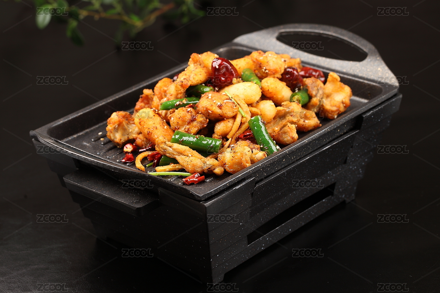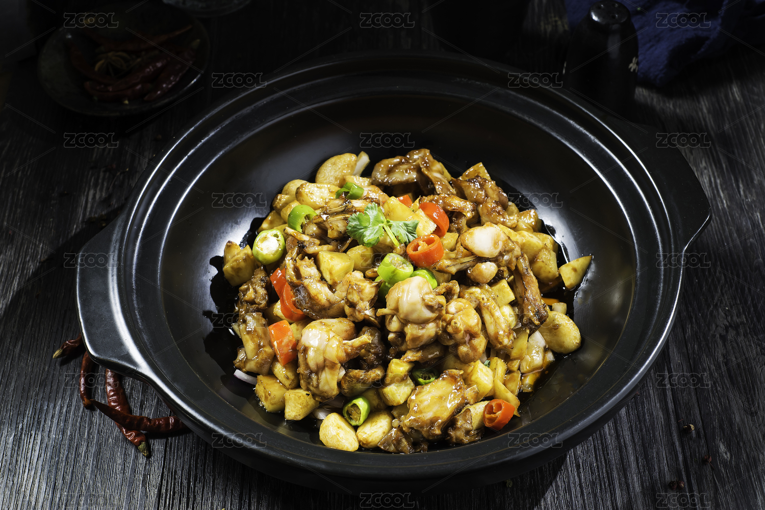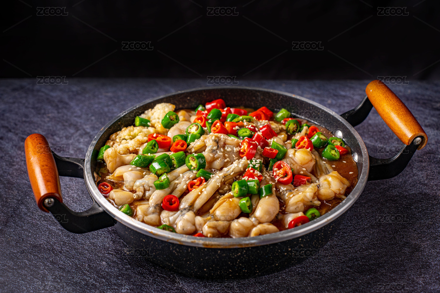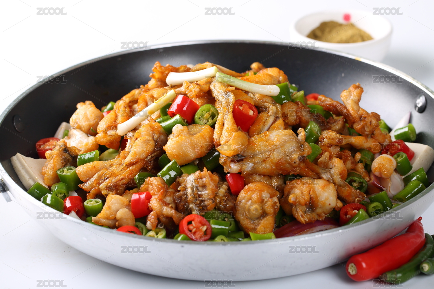 大鐵鍋里的川菜麻辣干鍋青椒紅椒圈小蔥段爆牛蛙