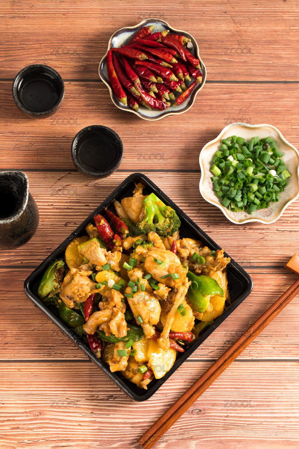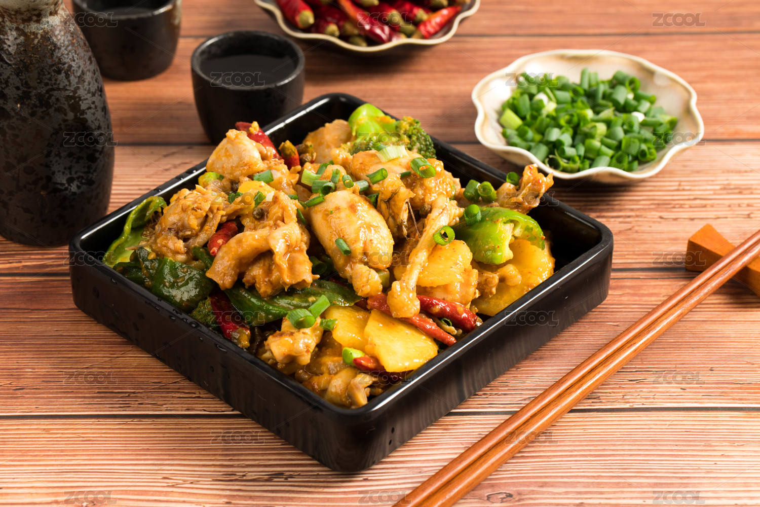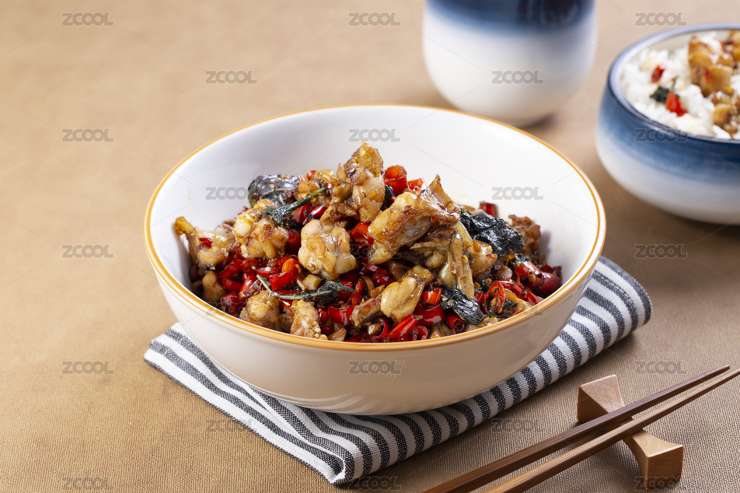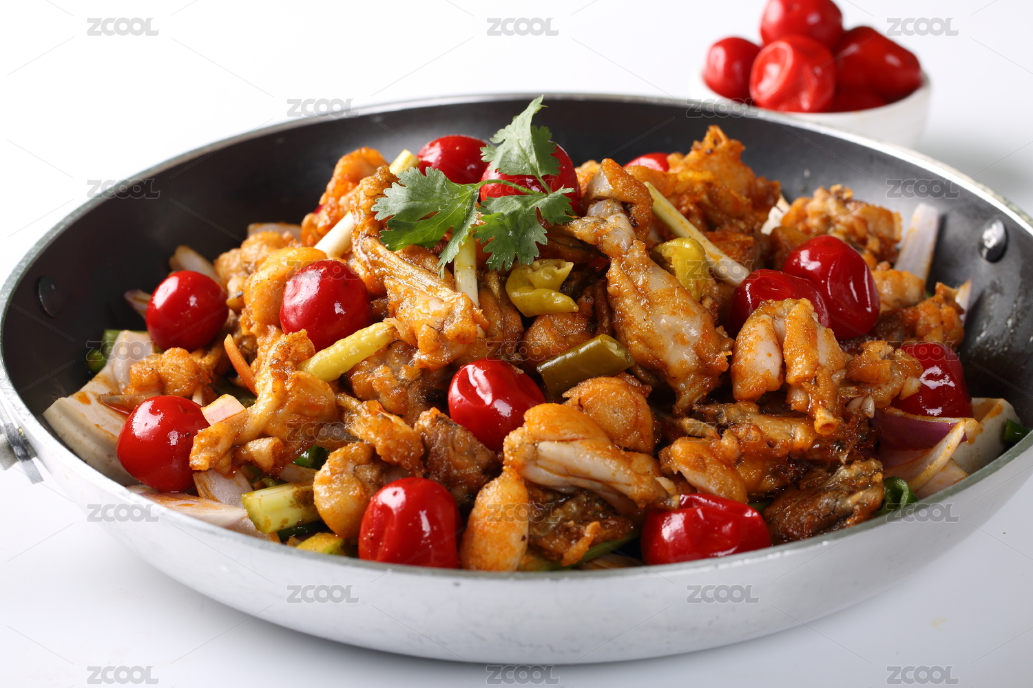 大鐵鍋里的川菜麻辣干鍋青椒紅椒圈小蔥段爆牛蛙