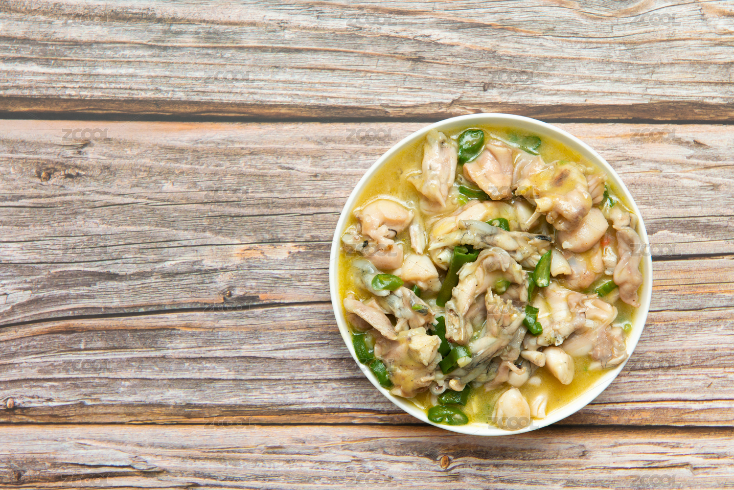 放在木紋背景上的一盤藤椒牛蛙