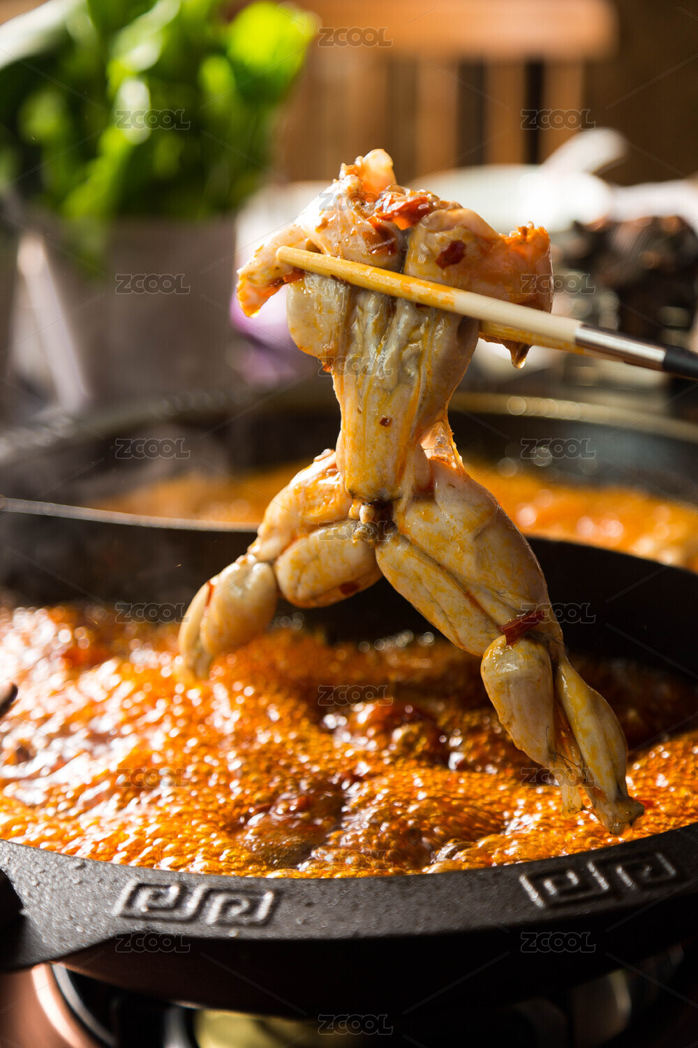 大鐵鍋里的川菜麻辣干鍋野山椒泡椒小蔥段爆牛蛙