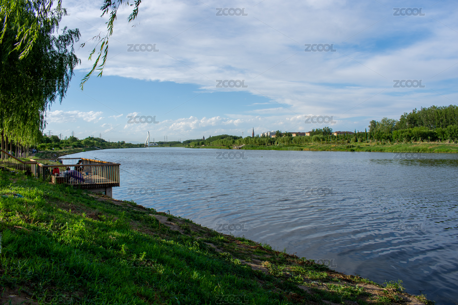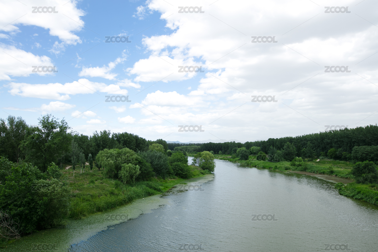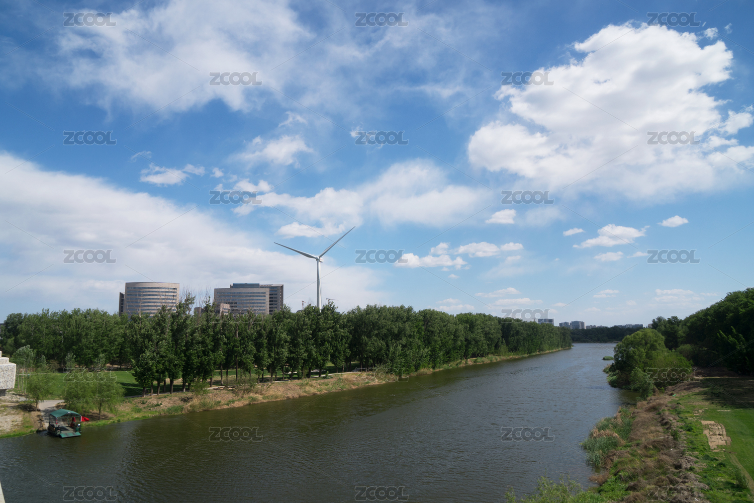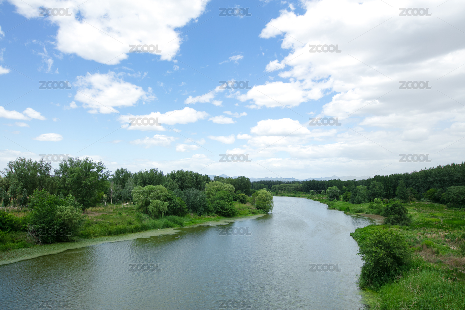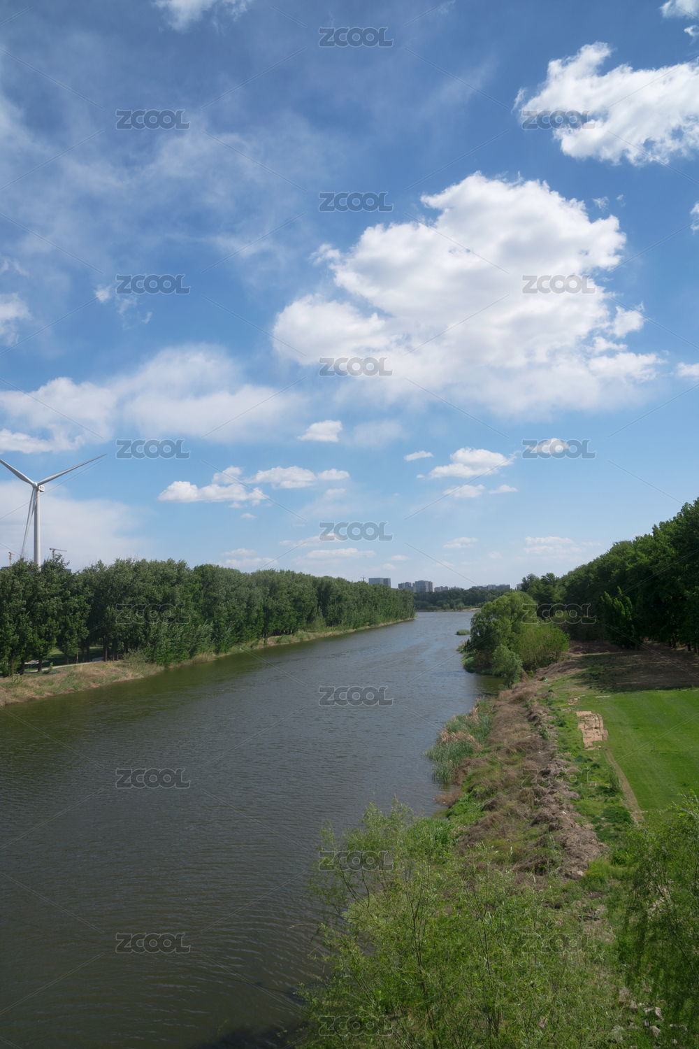 春末夏初北京溫榆河河床返青藍(lán)天白云