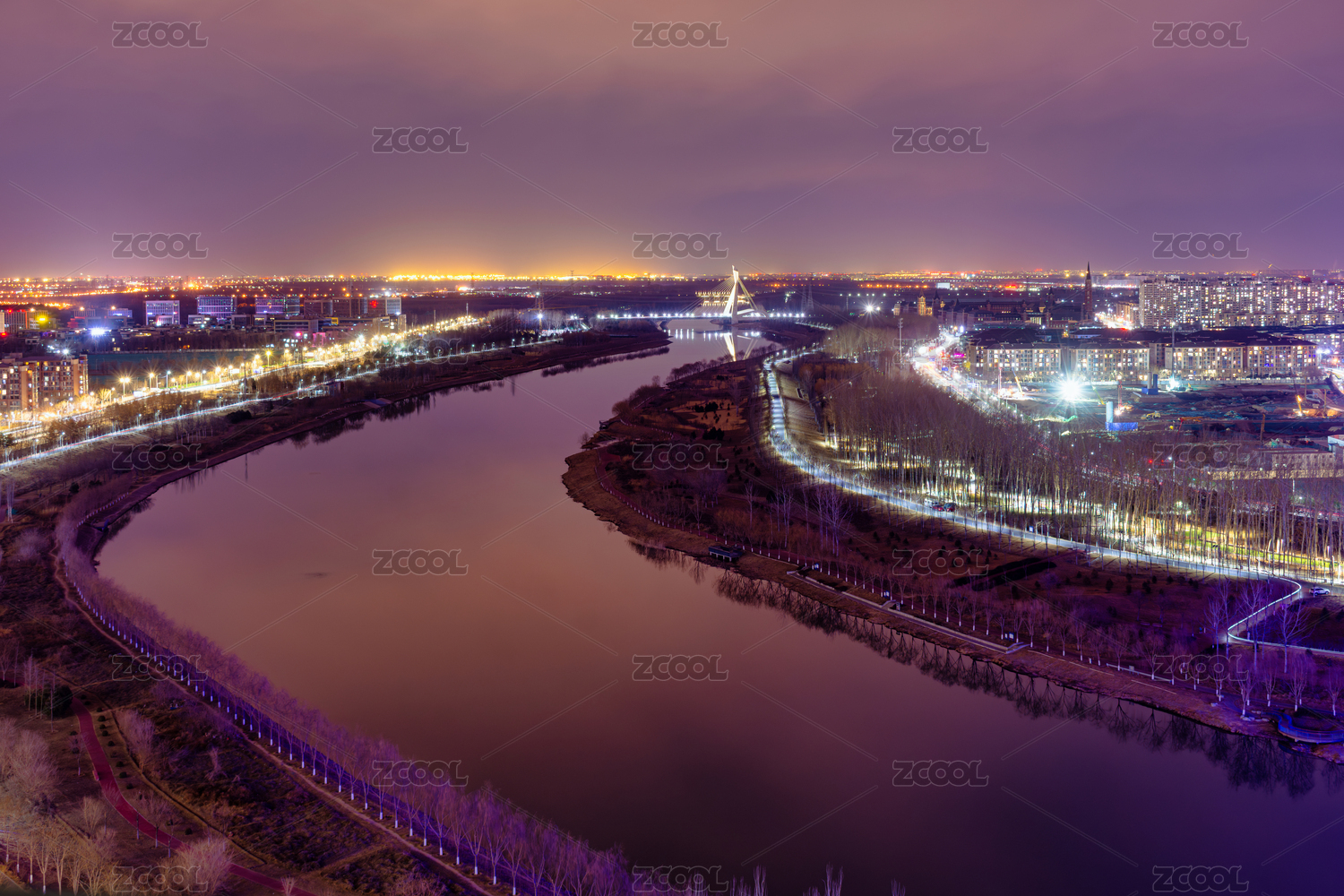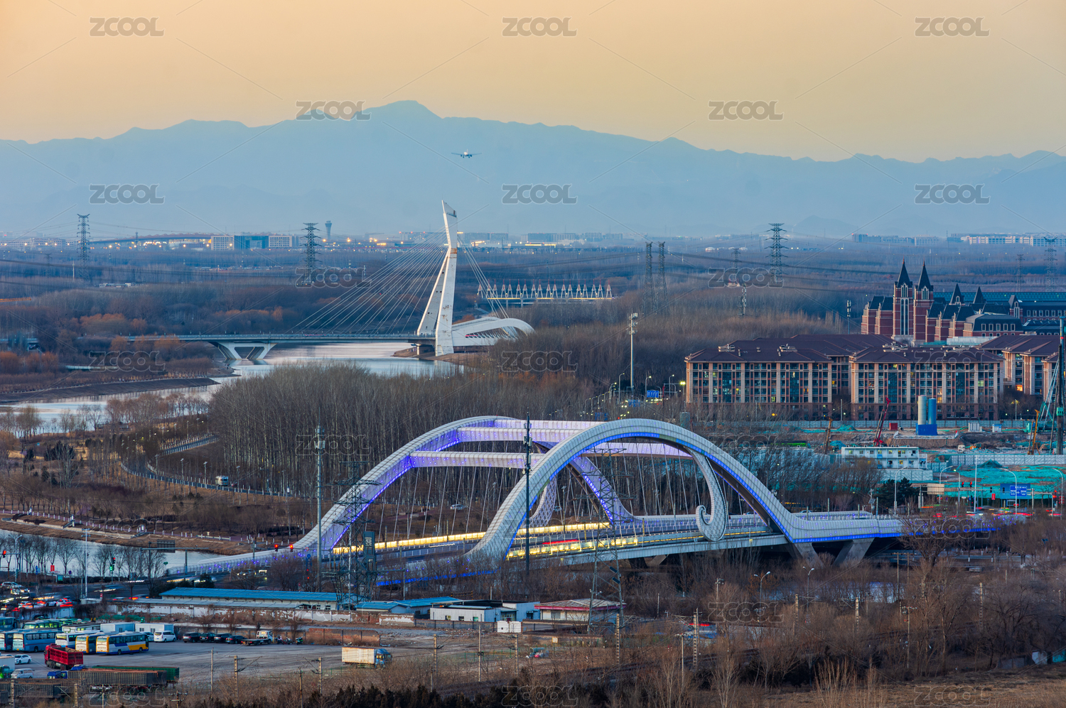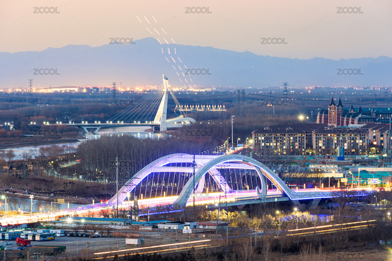 傍晚的溫榆河上,鄧家窯橋和溫榆河大橋亮燈