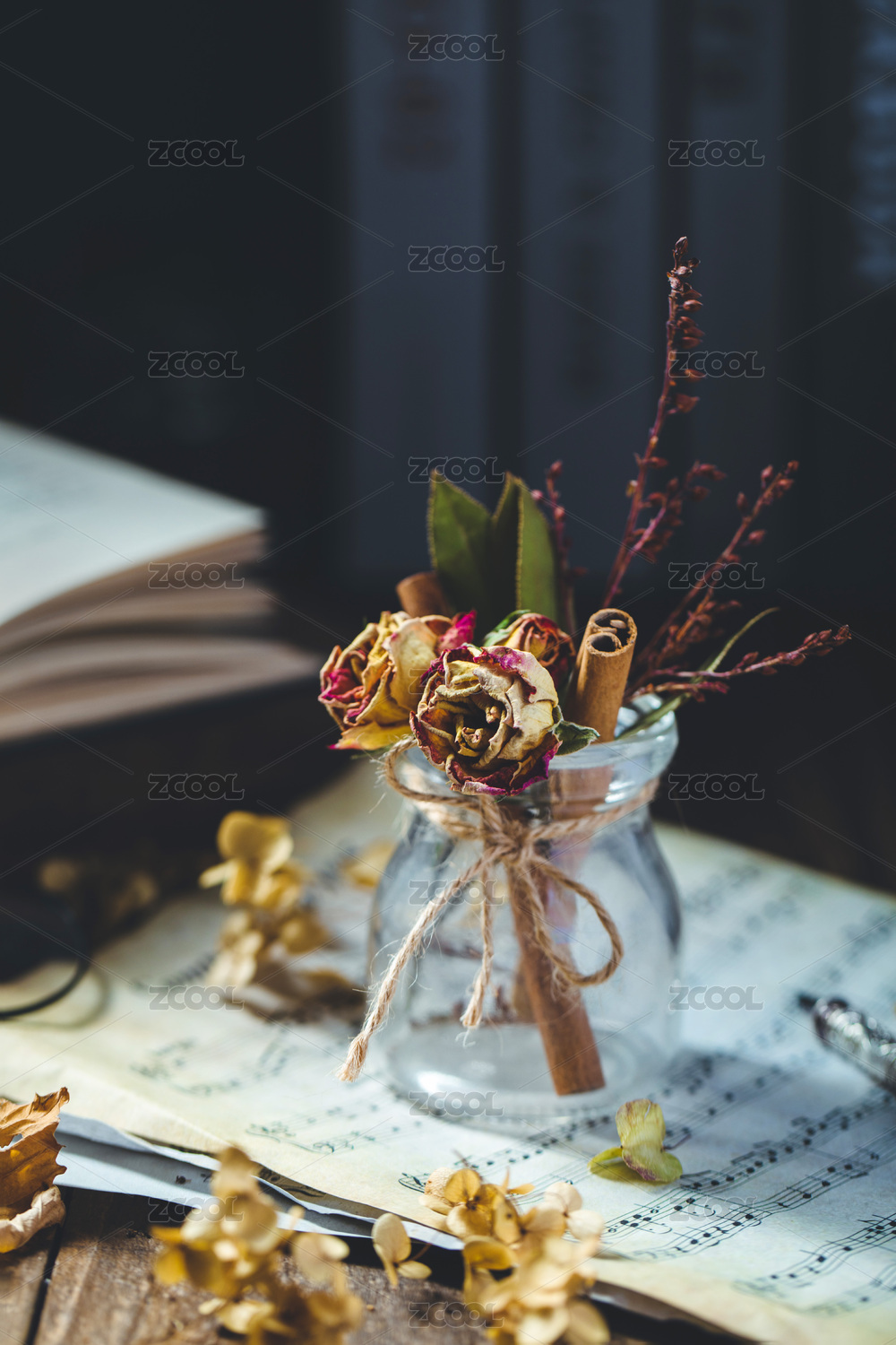 照射入窗的夕陽(yáng)正好照射在玫瑰干花上