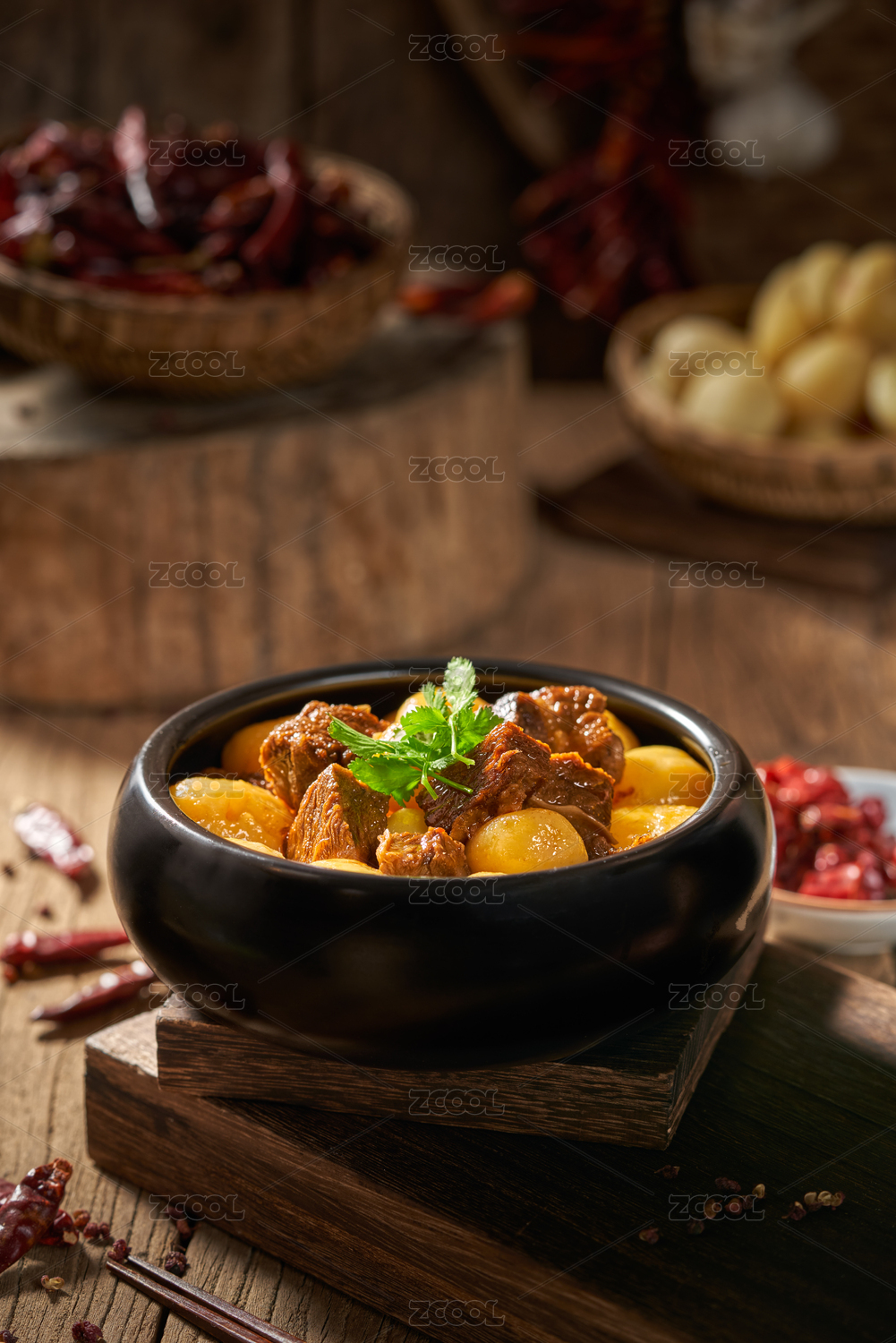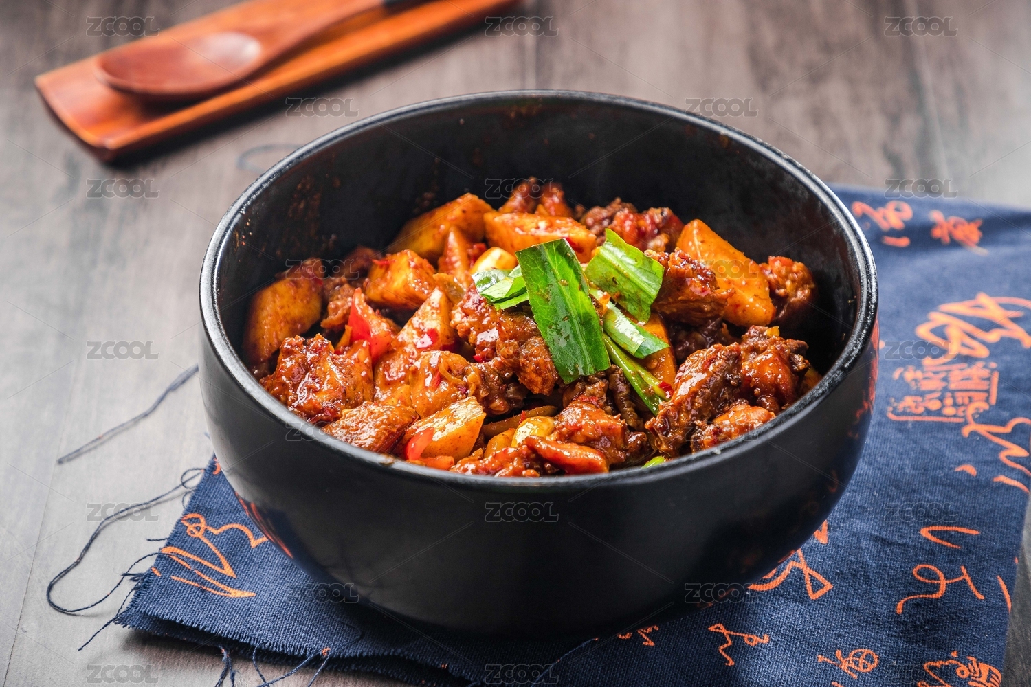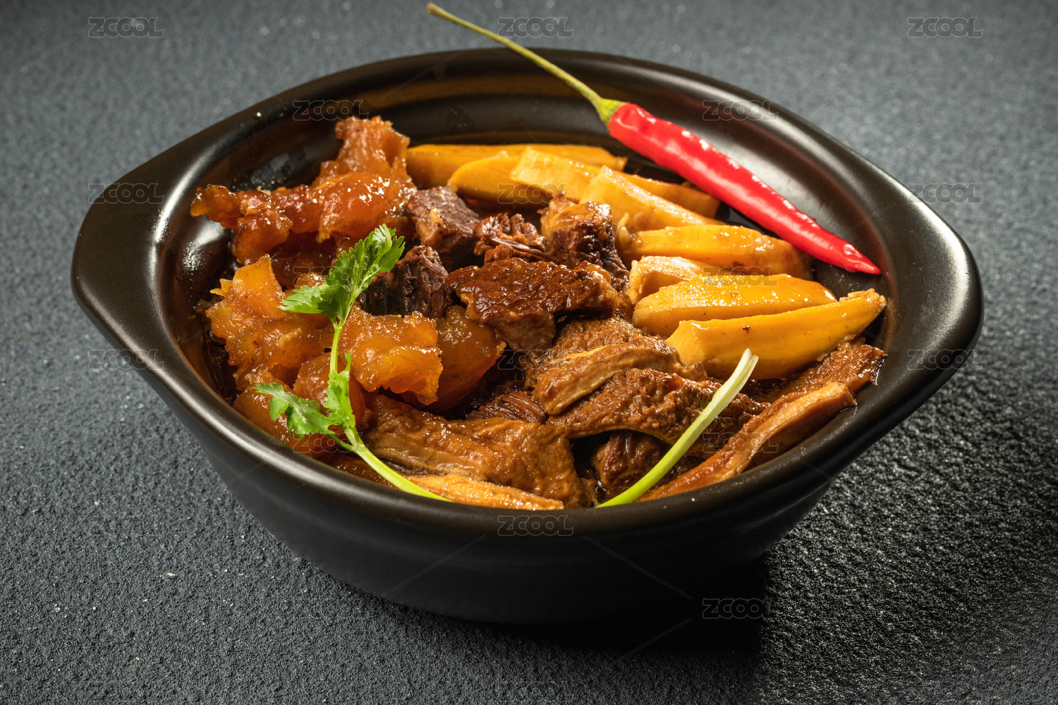 棕色桌面上有一盆土豆山藥燉排骨砂鍋菜