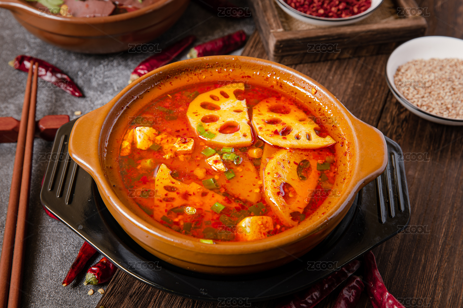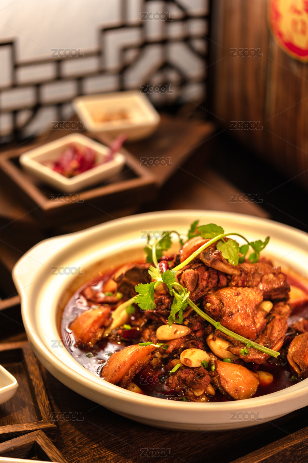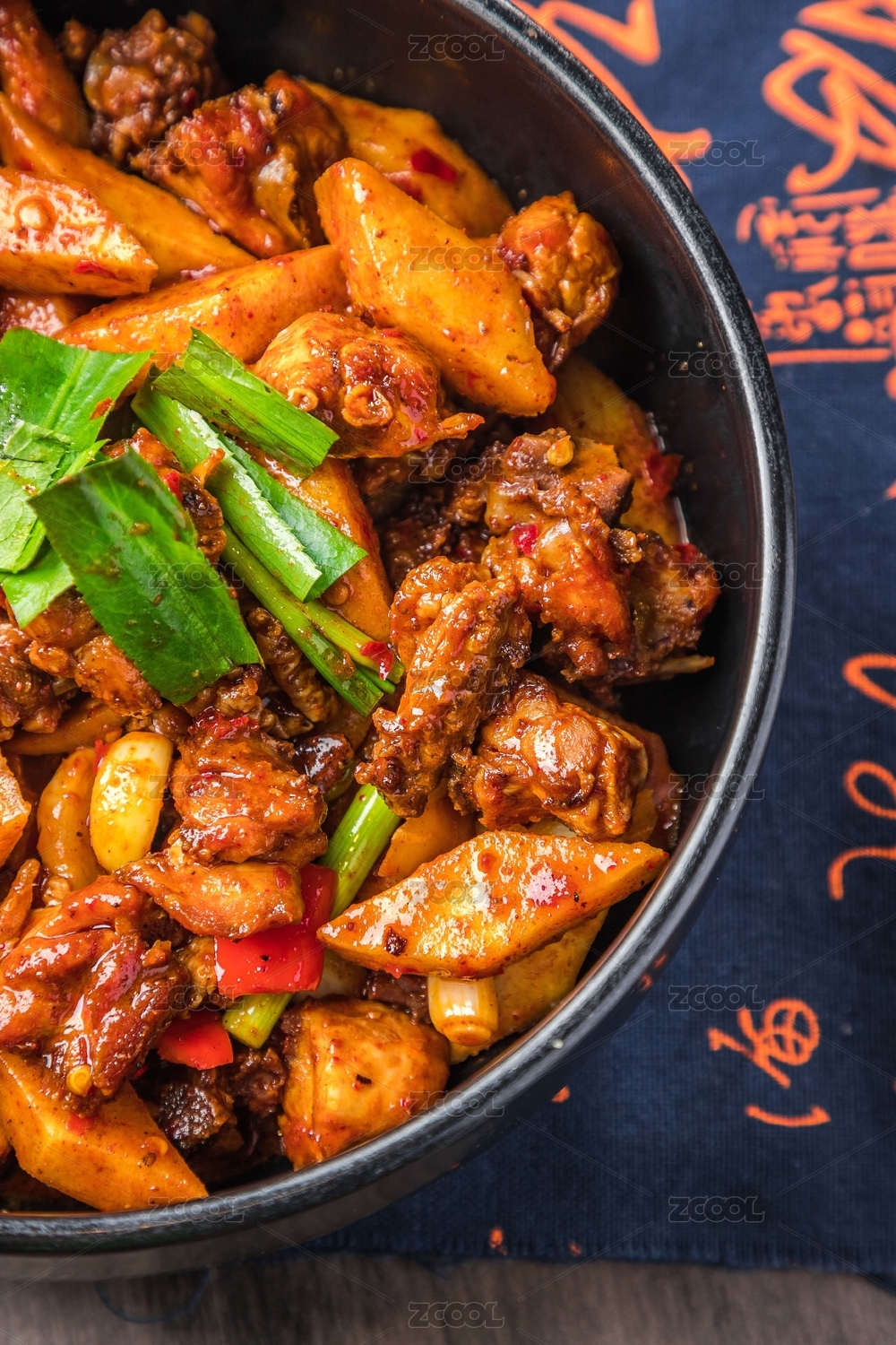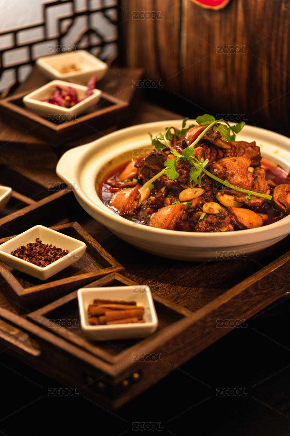 棕色桌面上有一盆土豆山藥燉排骨砂鍋菜