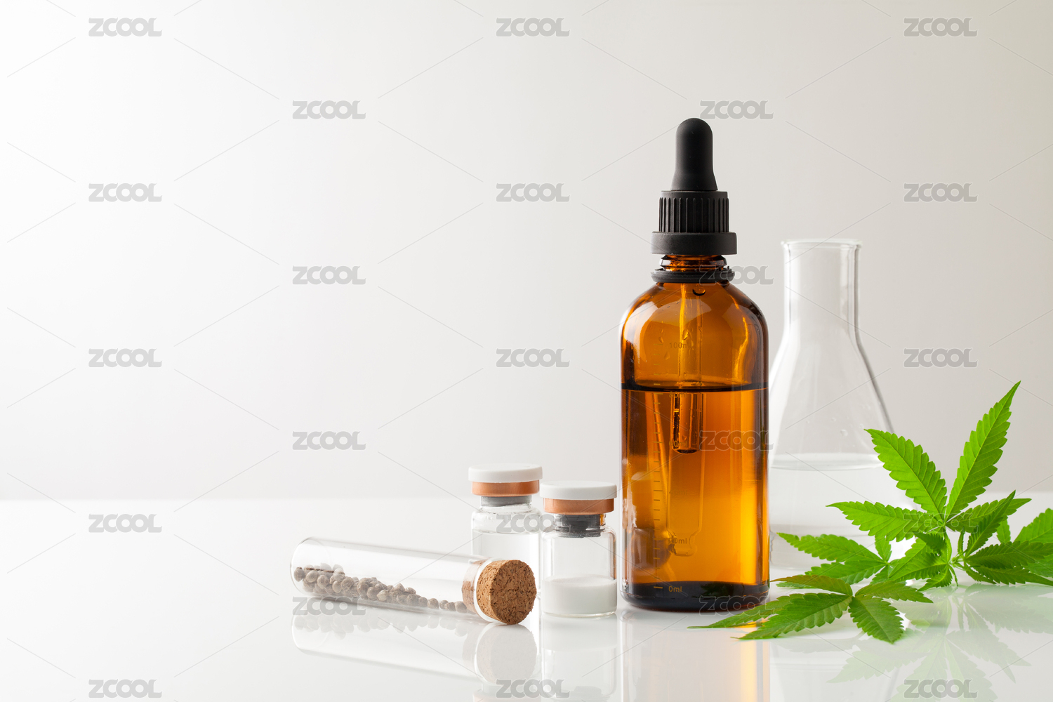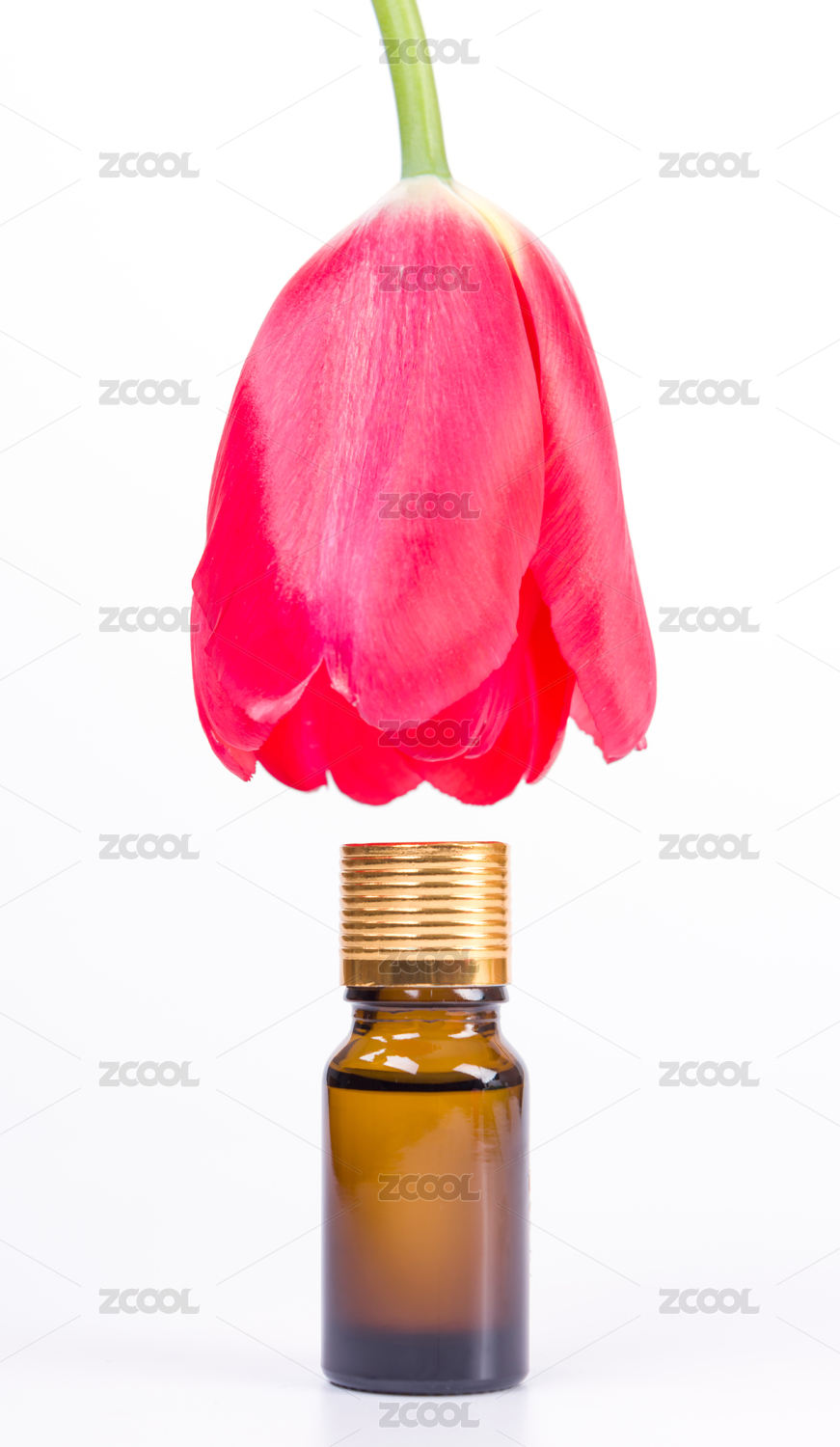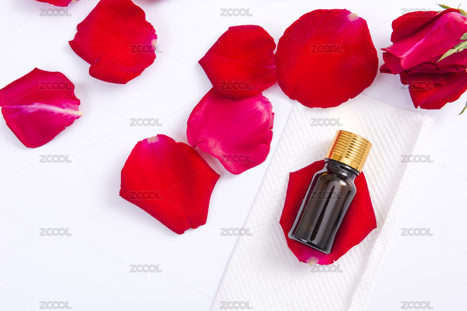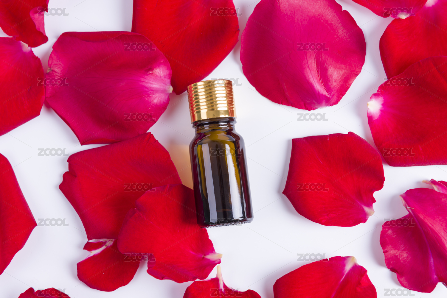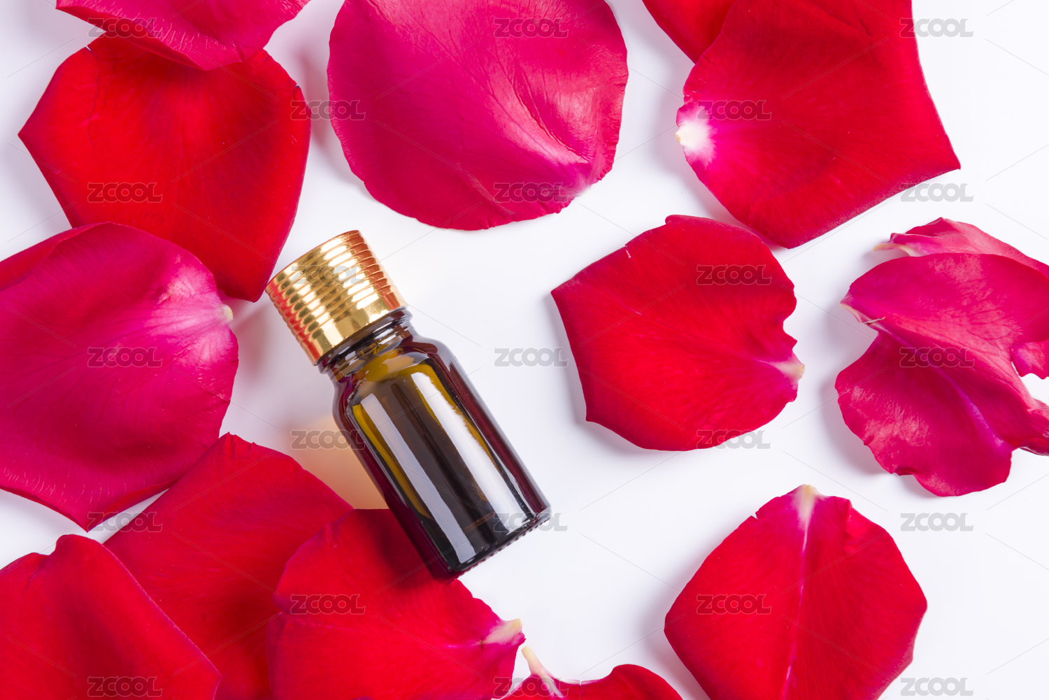 玫瑰精油,棕色的精油瓶和一些紅色的玫瑰花瓣
