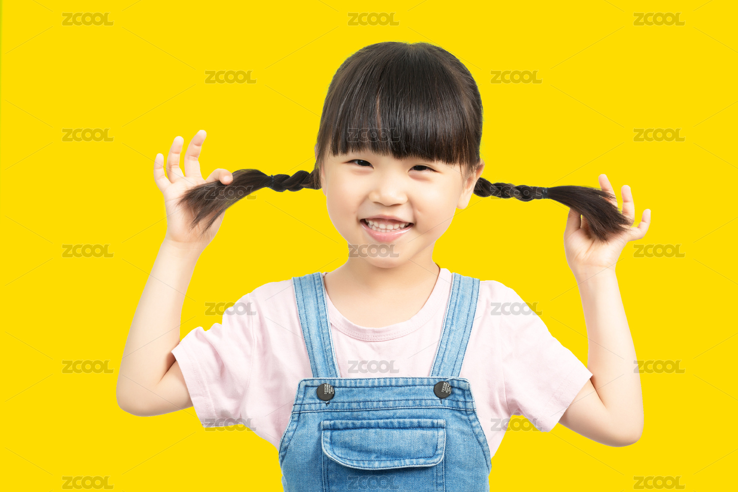 可愛的亞洲小女孩笑著雙手抓著辮子