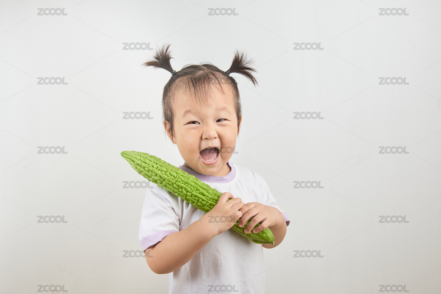 扎著小辮子的幼兒手捧一根苦瓜