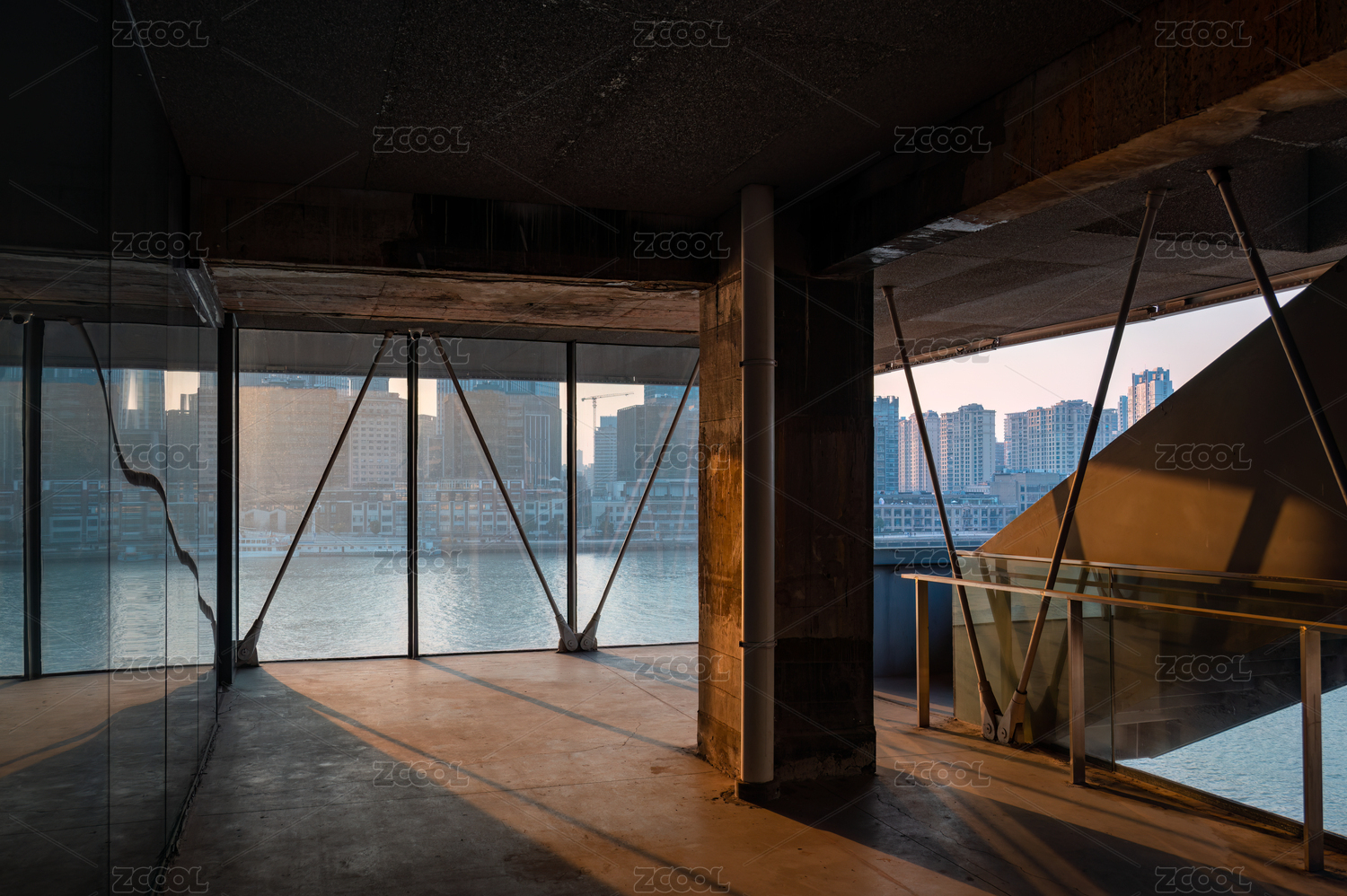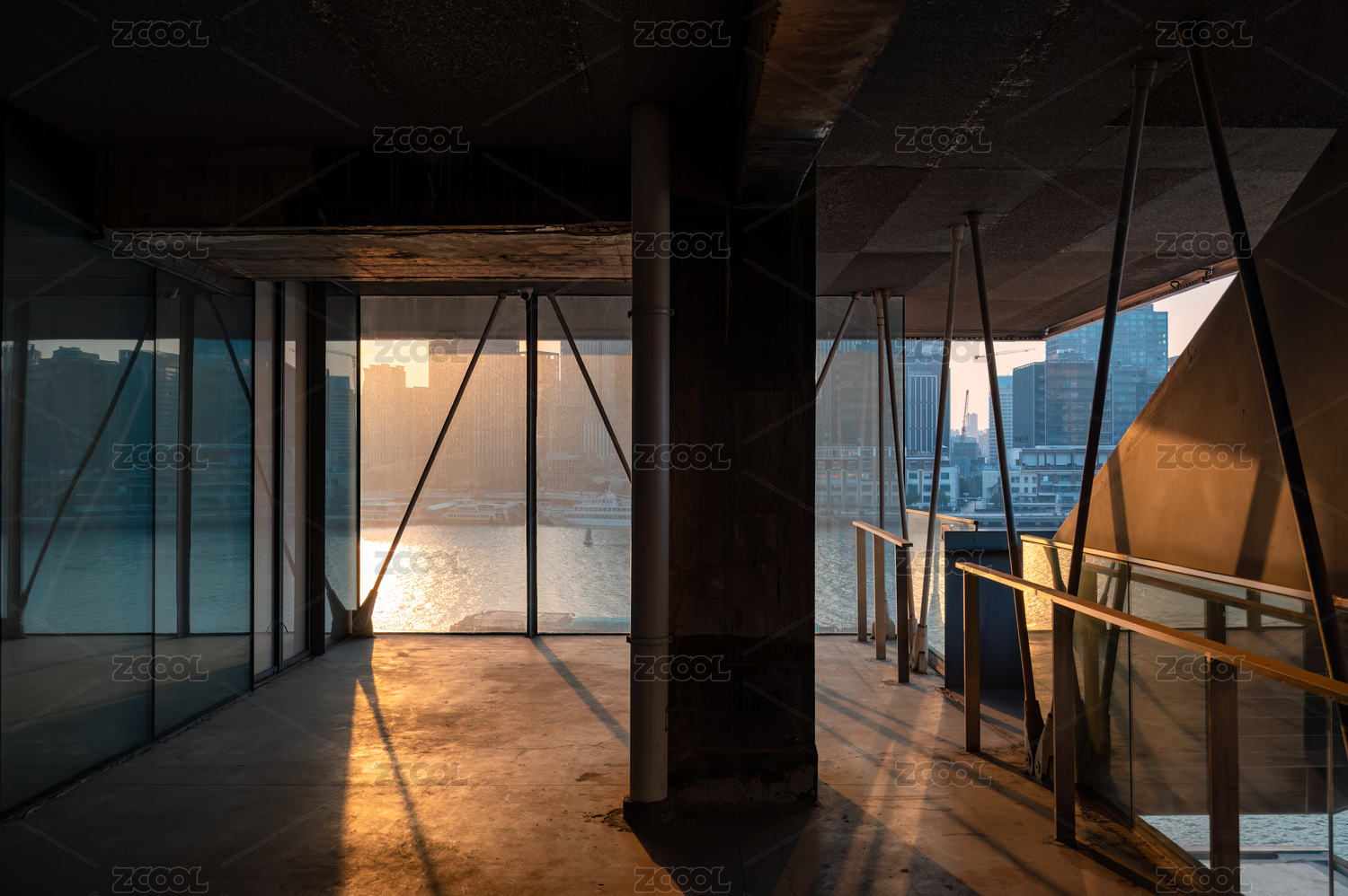 黃昏光線下空曠的建筑樓層空間