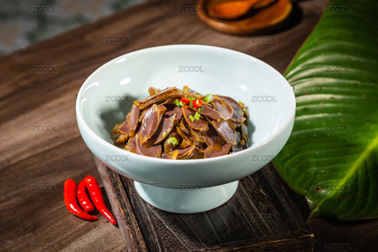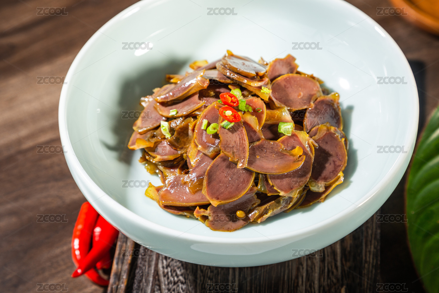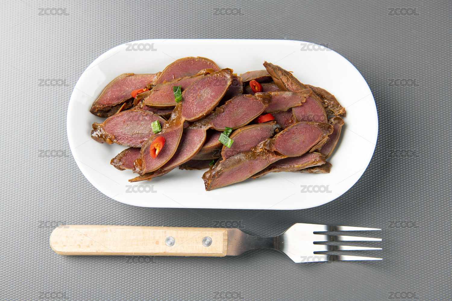 木紋桌面上有一盤鹵鴨胗