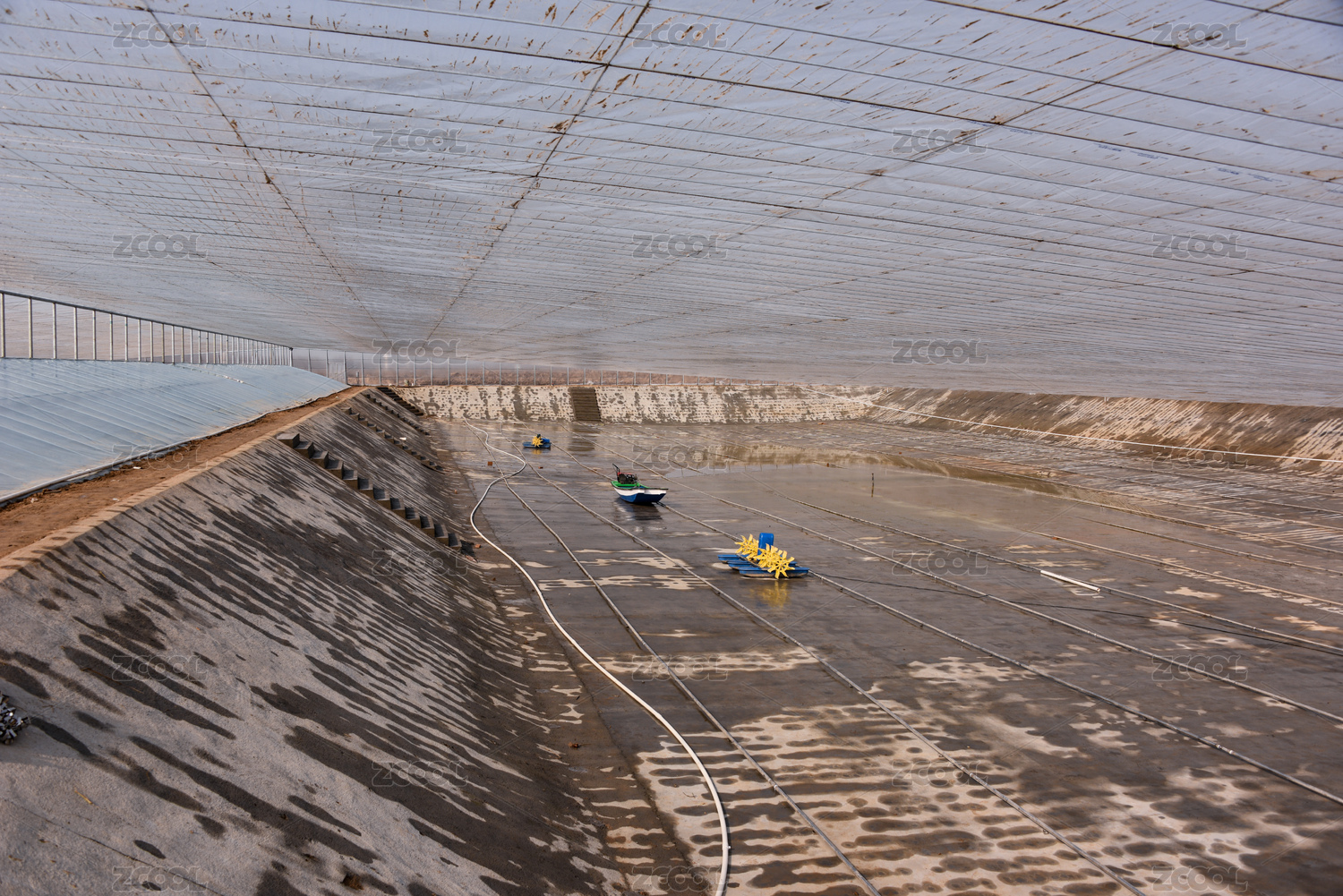藍天白云下塑料大棚里的水稻秧苗