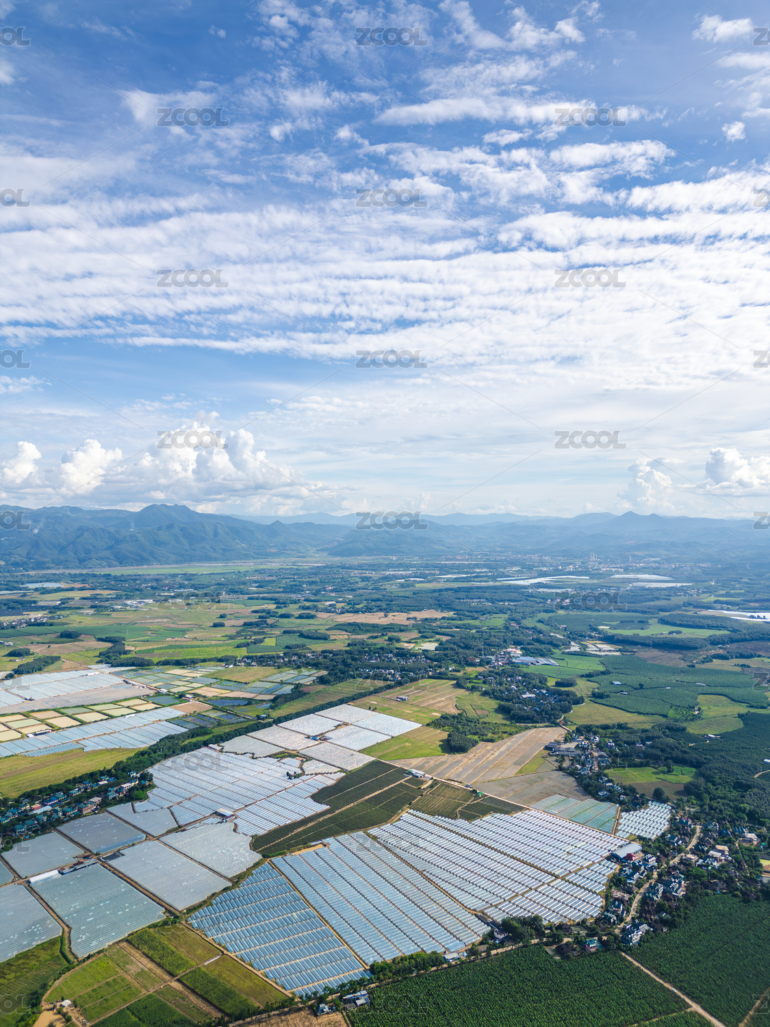 山間田野的塑料大棚種植園全景