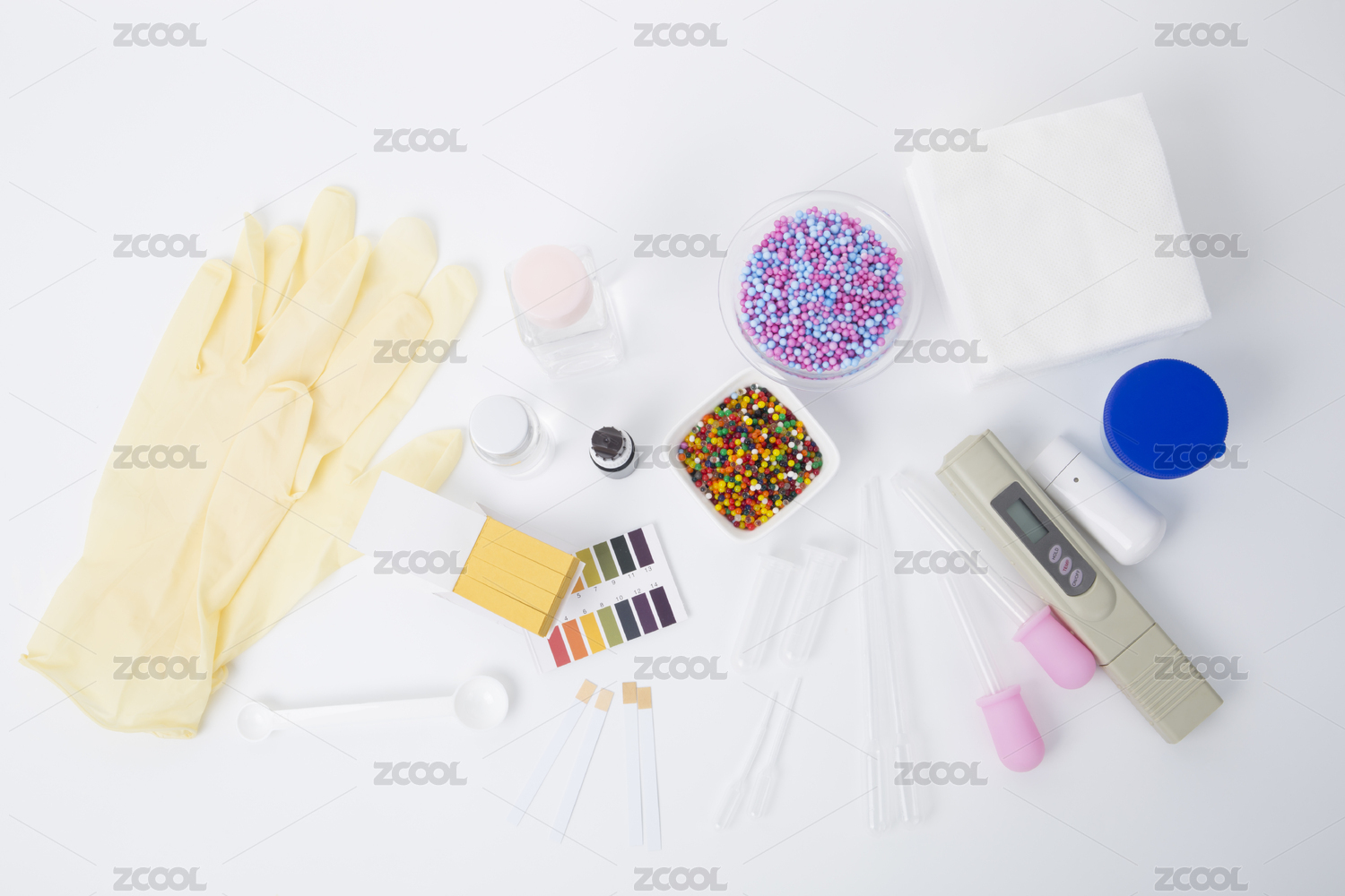 化妝品檢測工具,化學試驗套裝,ph紙,化學溶劑,滴管等在白色的背景上