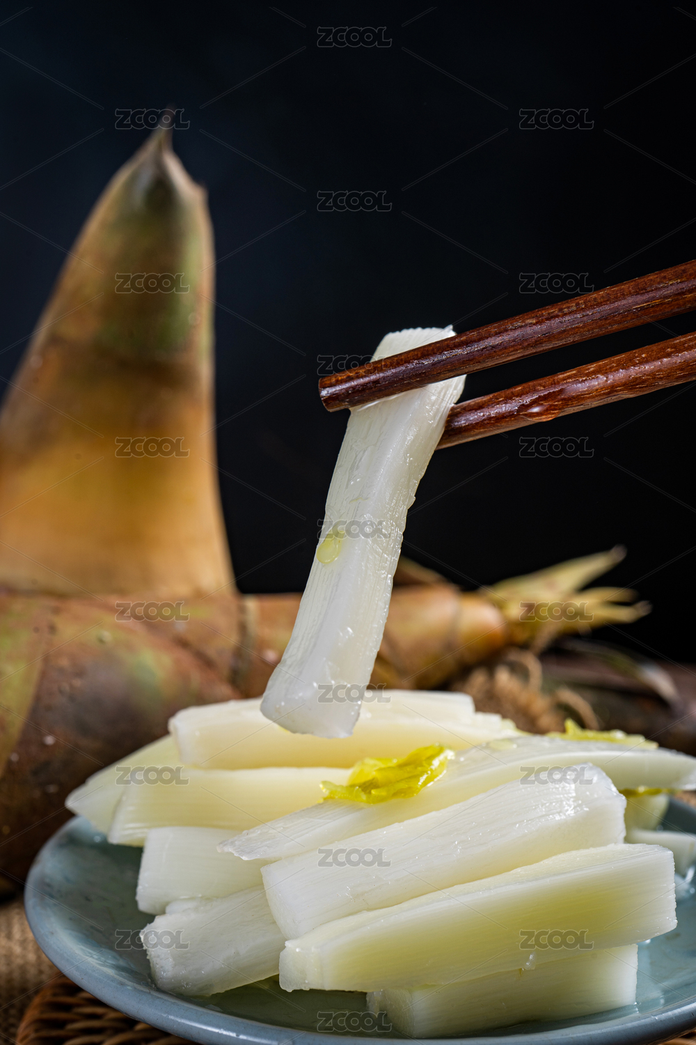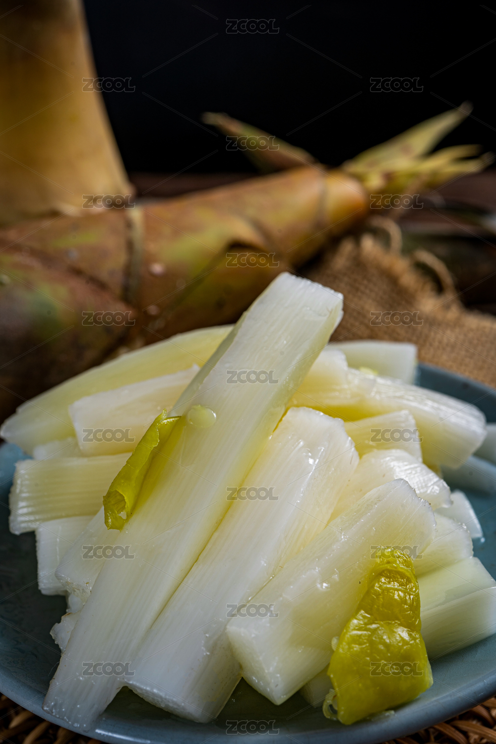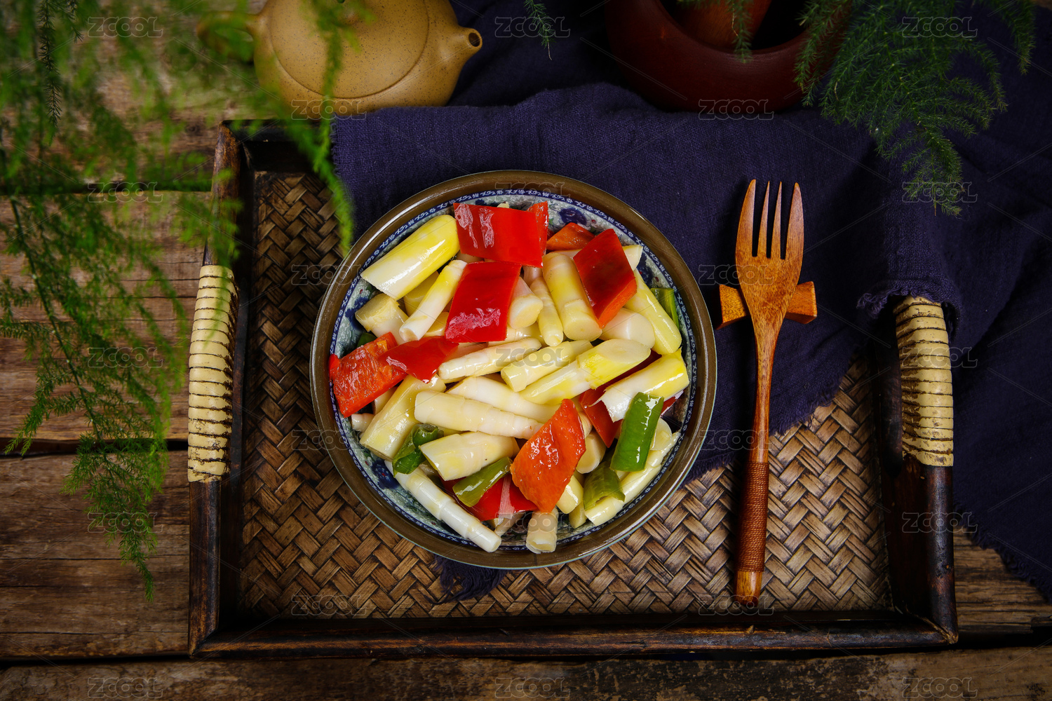 木桌上餐具里擺放的脆筍片
