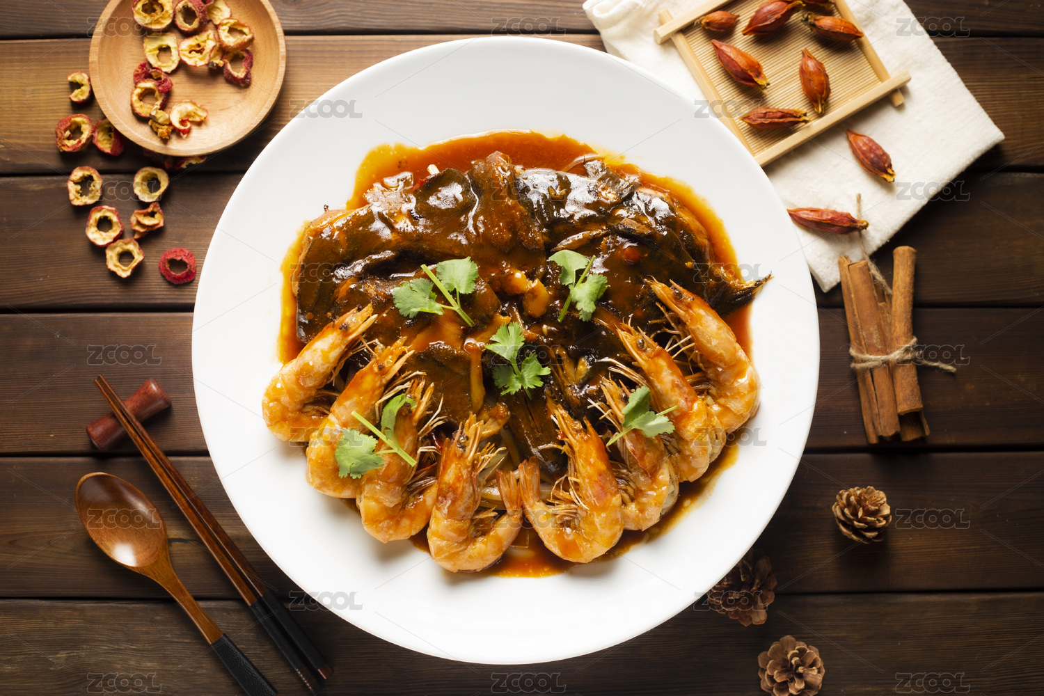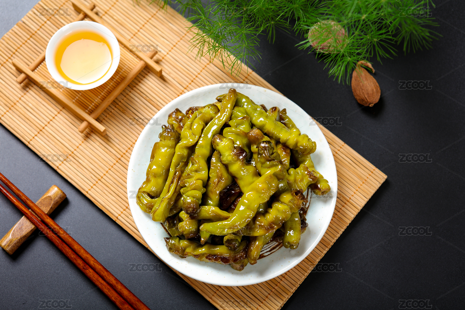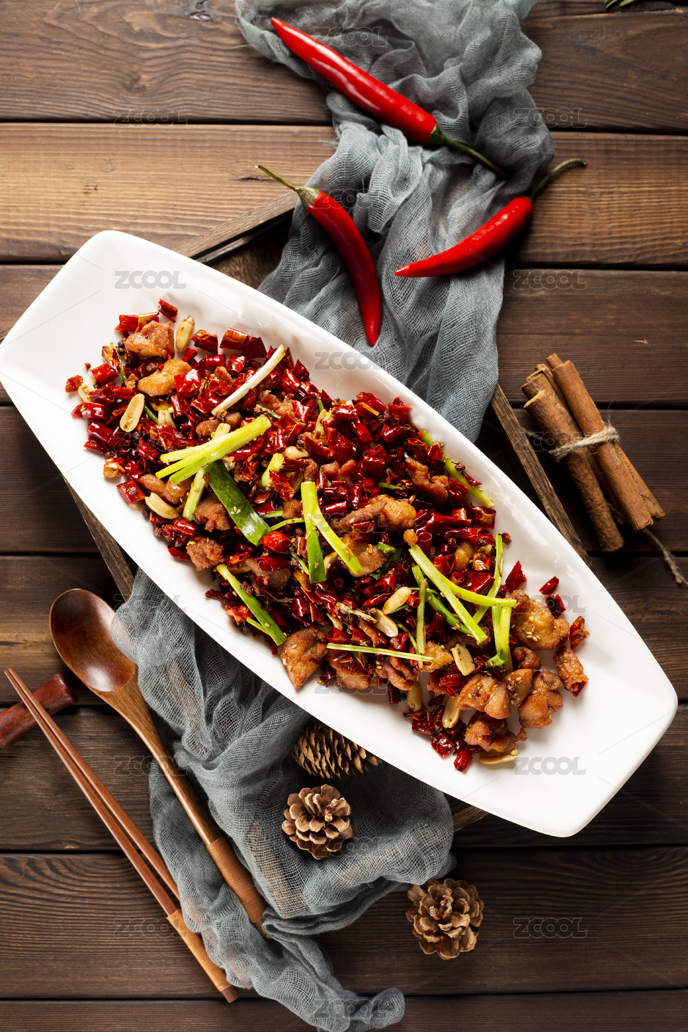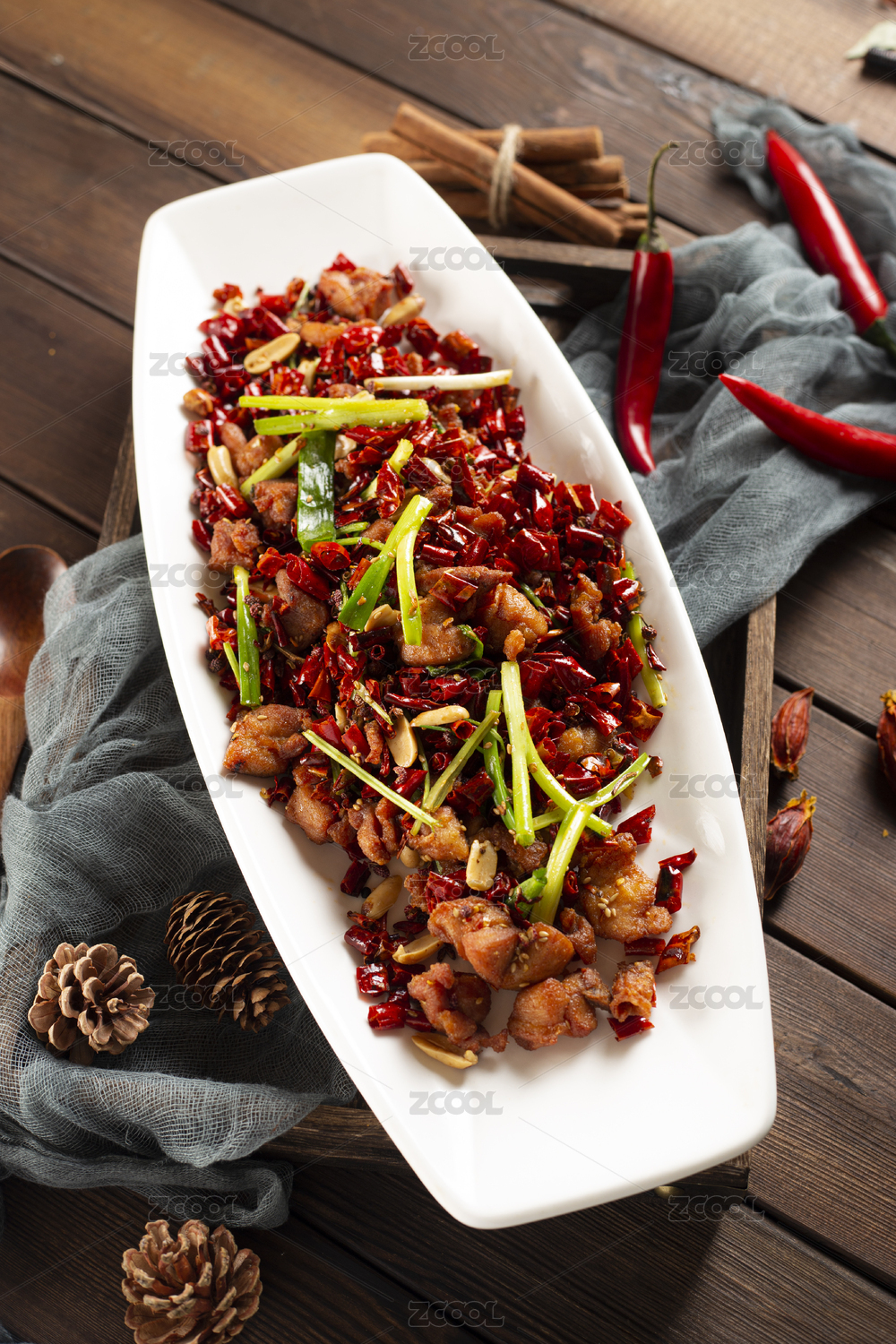 白瓷盤裝的辣子油炸五花肉山椒卷