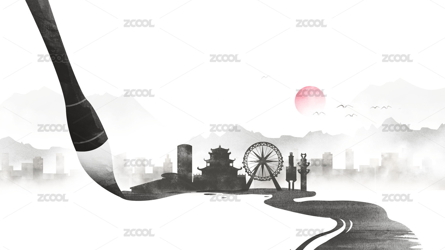 泉州中國風(fēng)水墨城市毛筆水彩畫建筑剪影