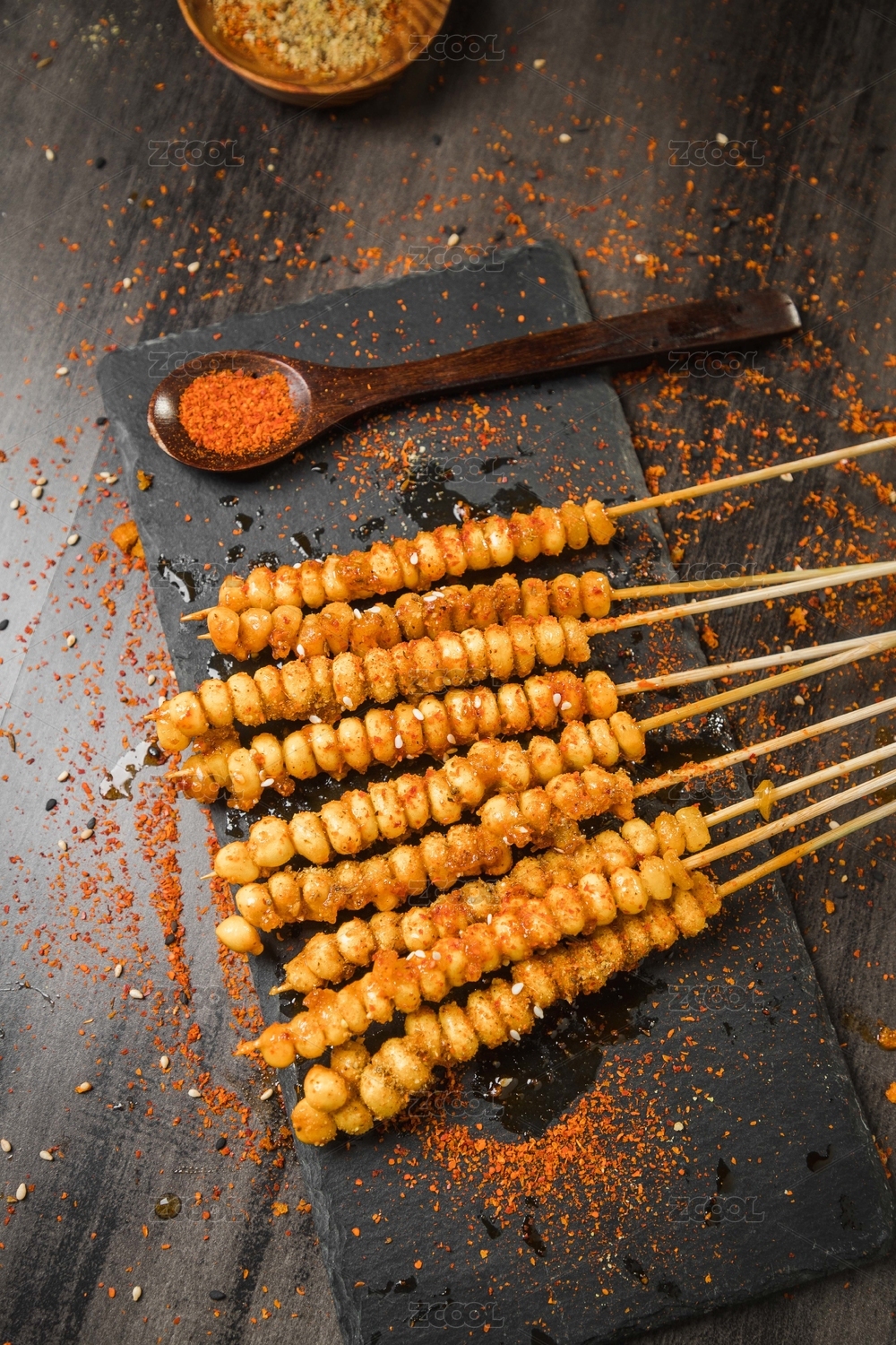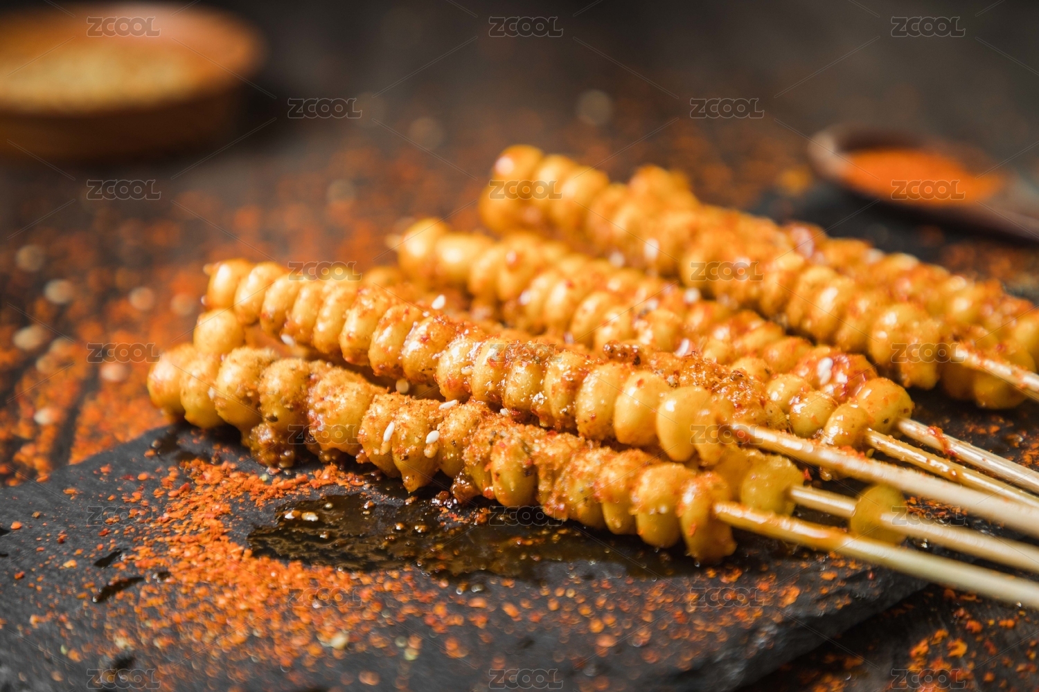 黑色烤架上放著幾串撒著辣椒面的油炸苞米粒