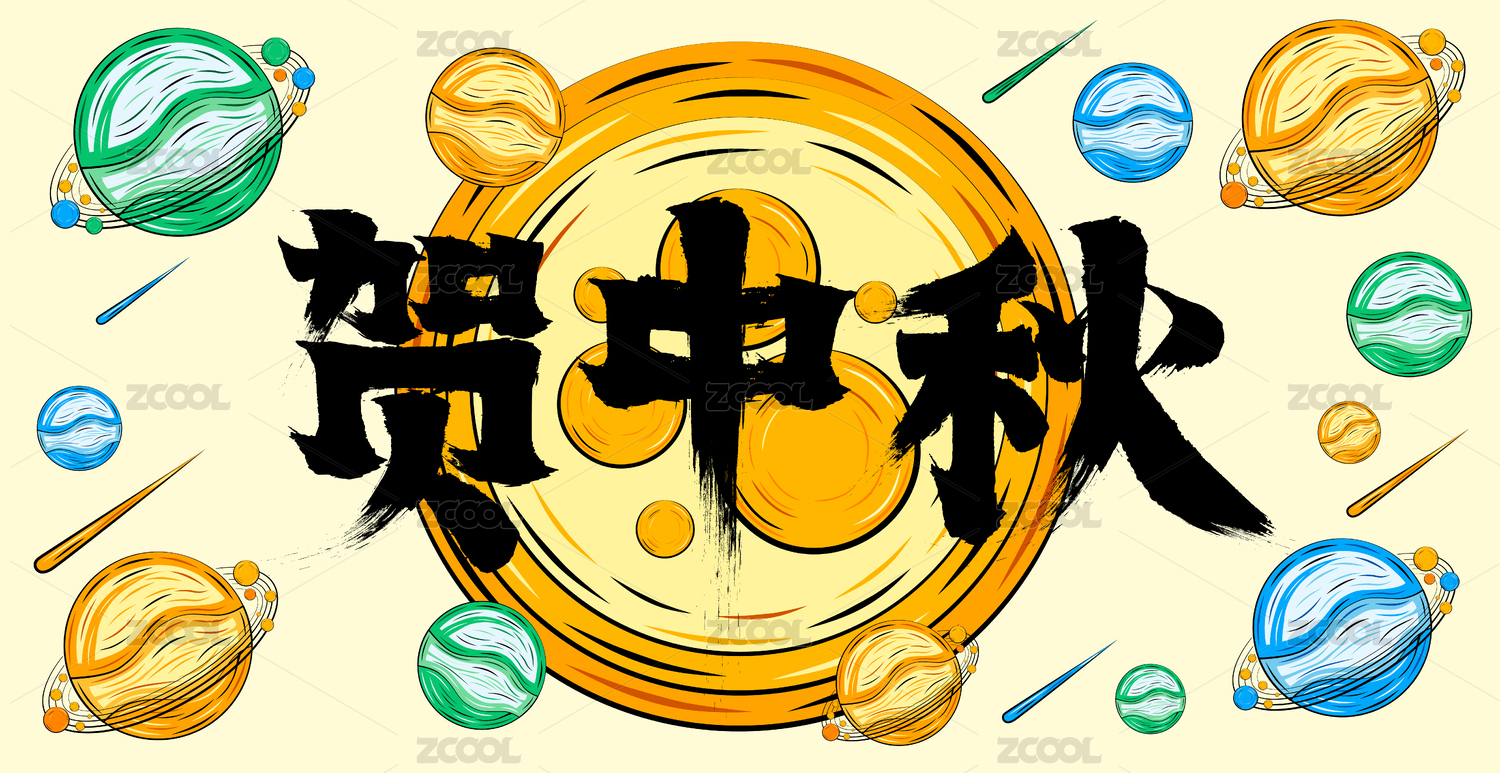 賀中秋國潮手繪圓月星球星空矢量書法字