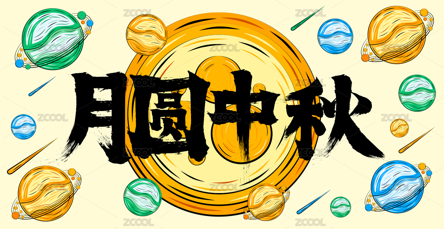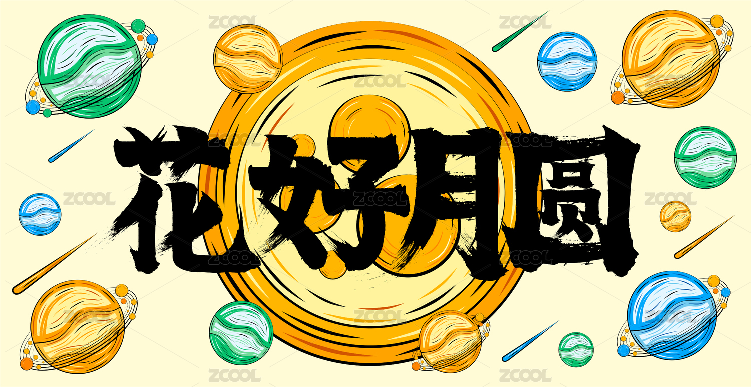 月圓中秋國潮手繪圓月星球星空矢量書法字