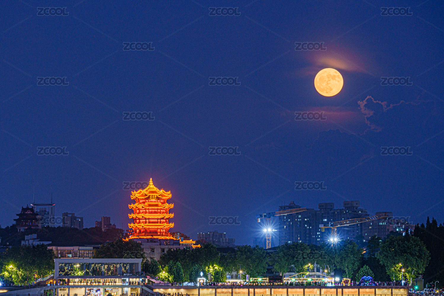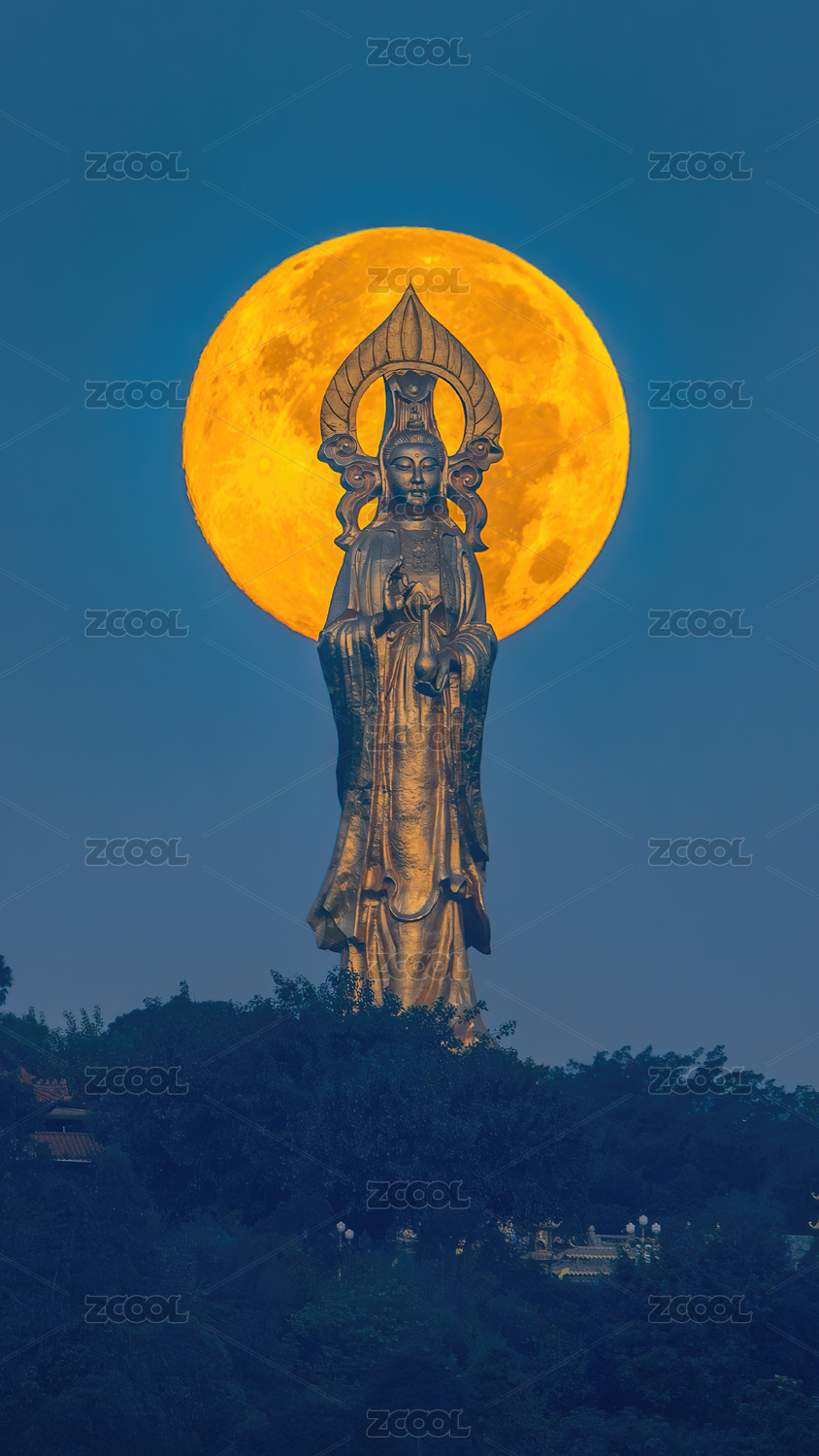 廣州海鷗島月光下的觀音像古塔與圓月奇景