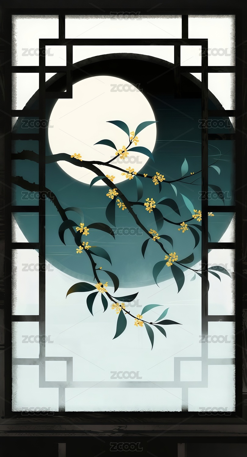 中秋節(jié)傳統(tǒng)節(jié)日矢量插圖:桂花、玉桂樹、小兔子、月光、圓月、賞月