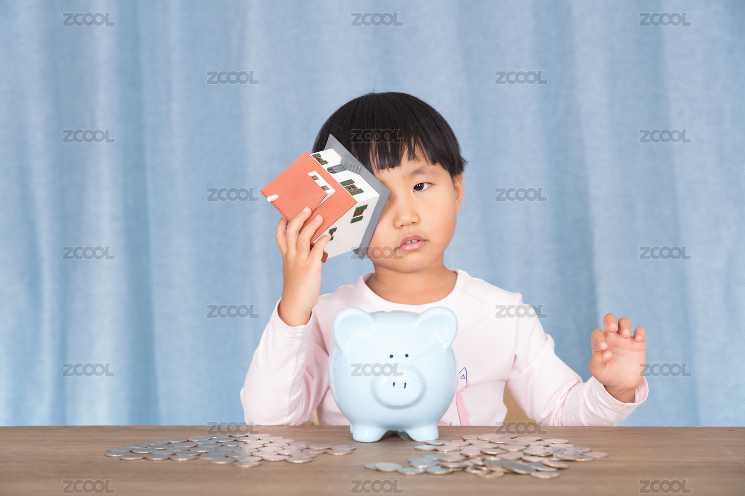 中國(guó)小女孩手拿房子模型貼到眼部向里觀看