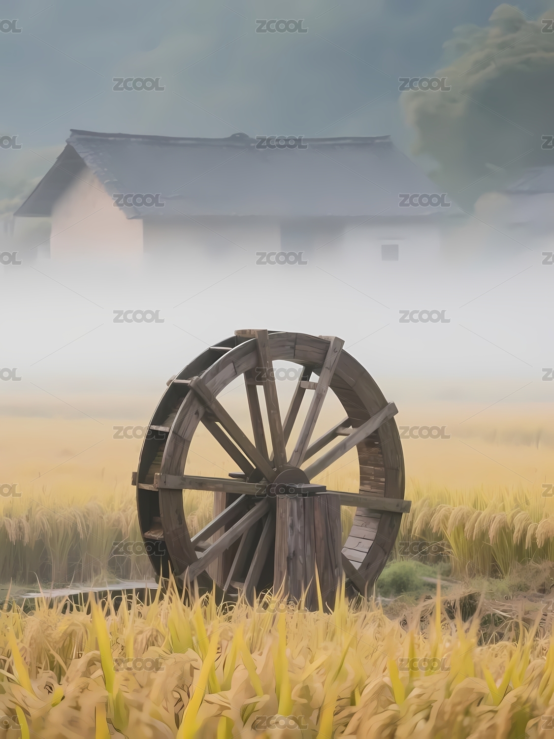 霧中稻田的木輪與農(nóng)舍