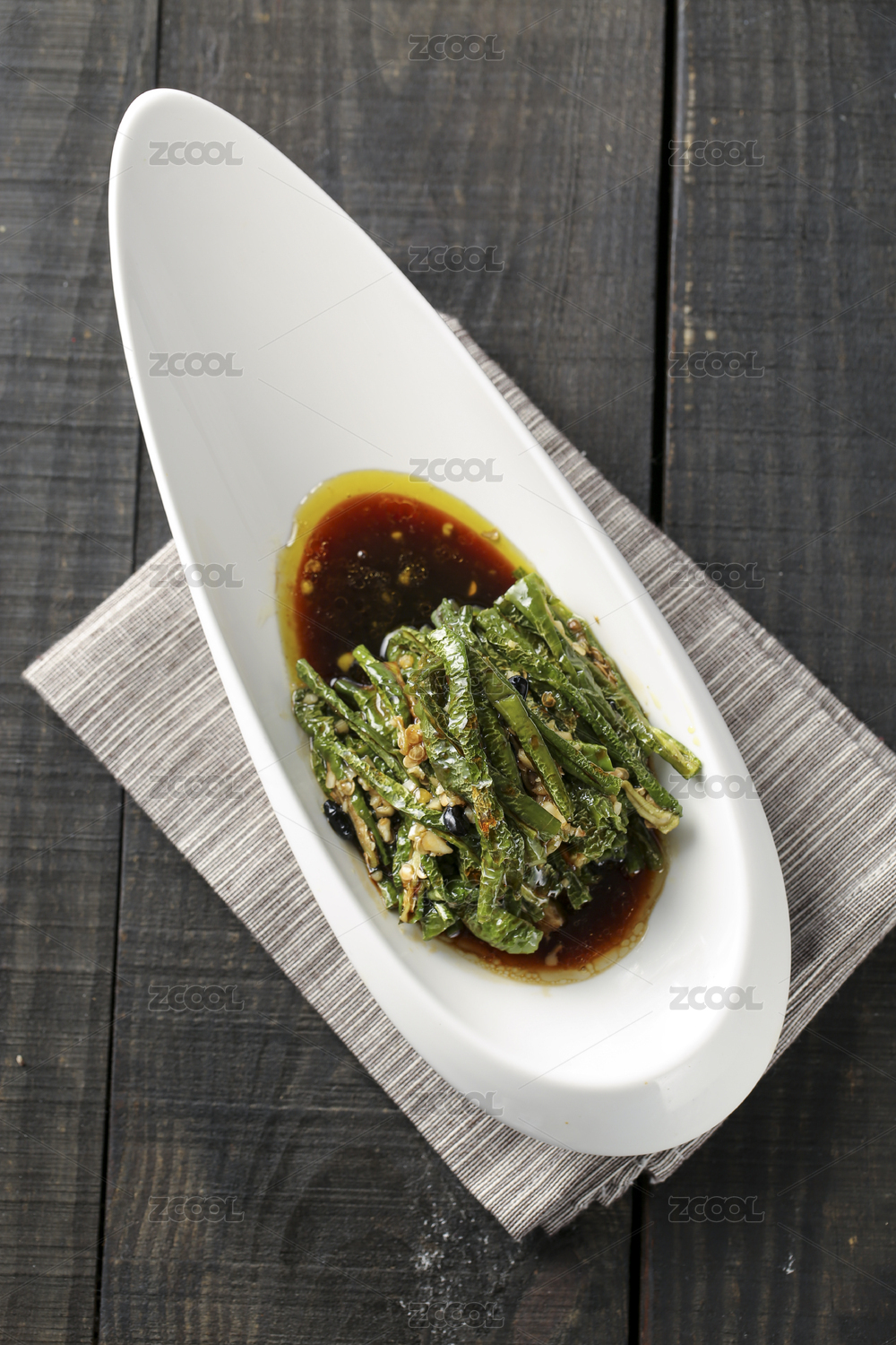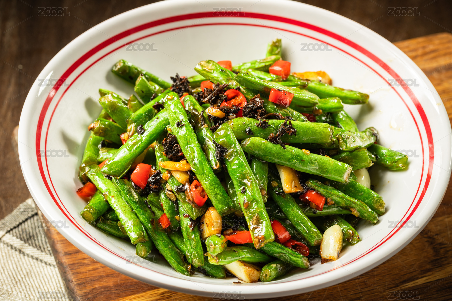 棕色木紋桌面上有一份干煸豆角
