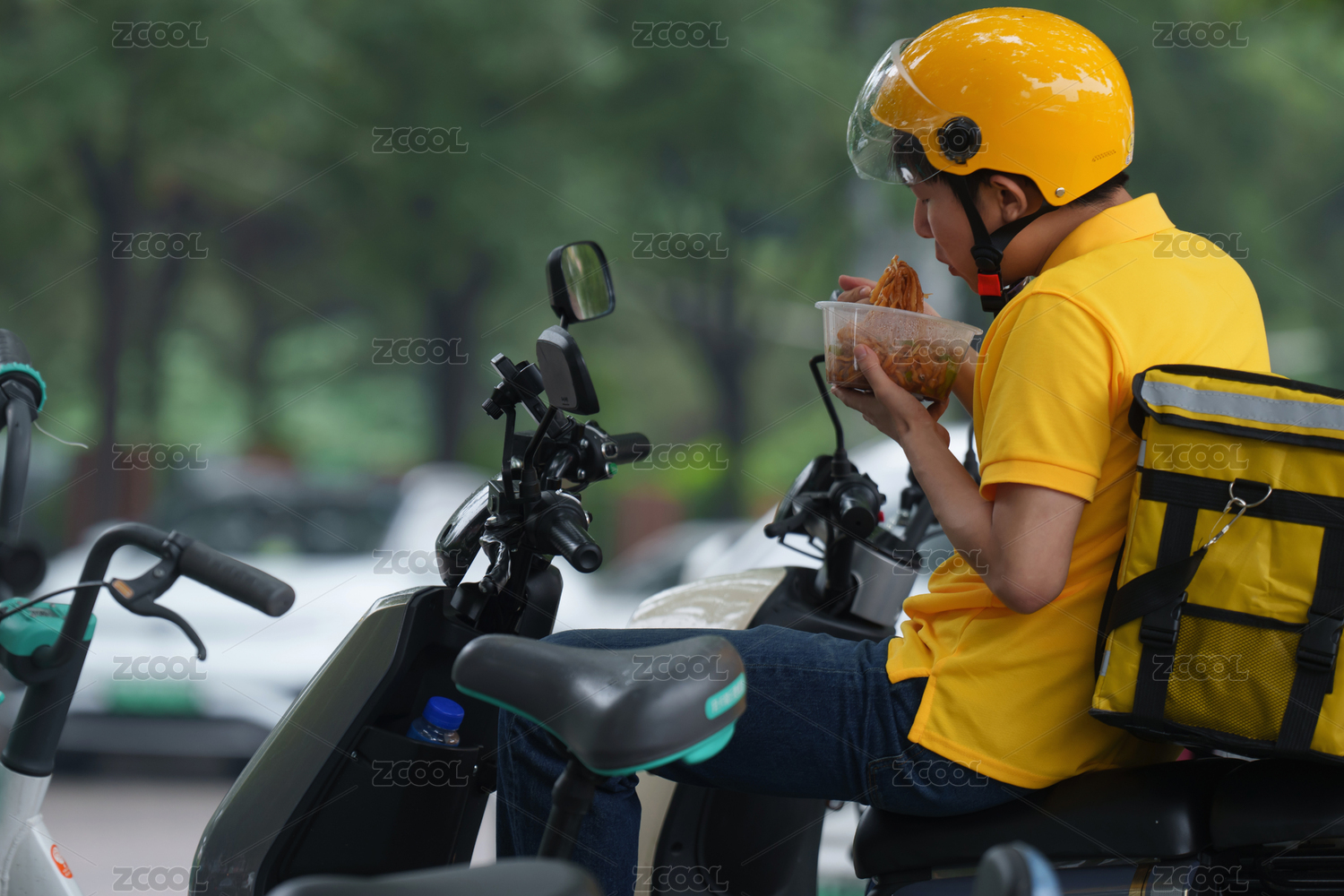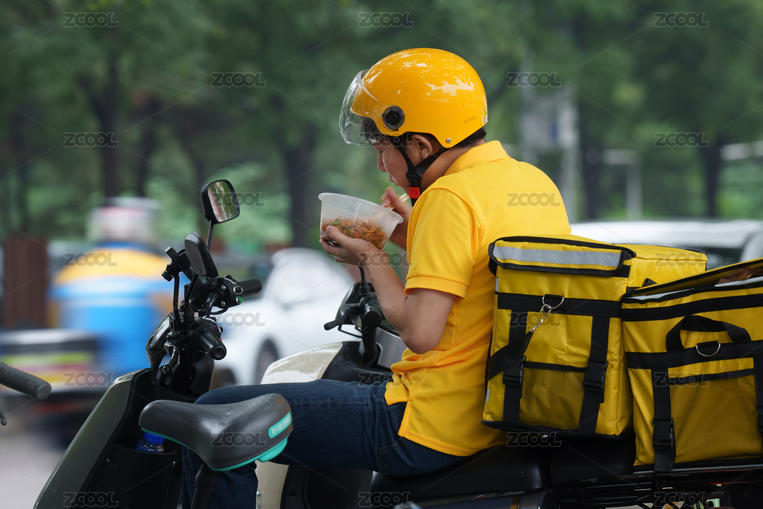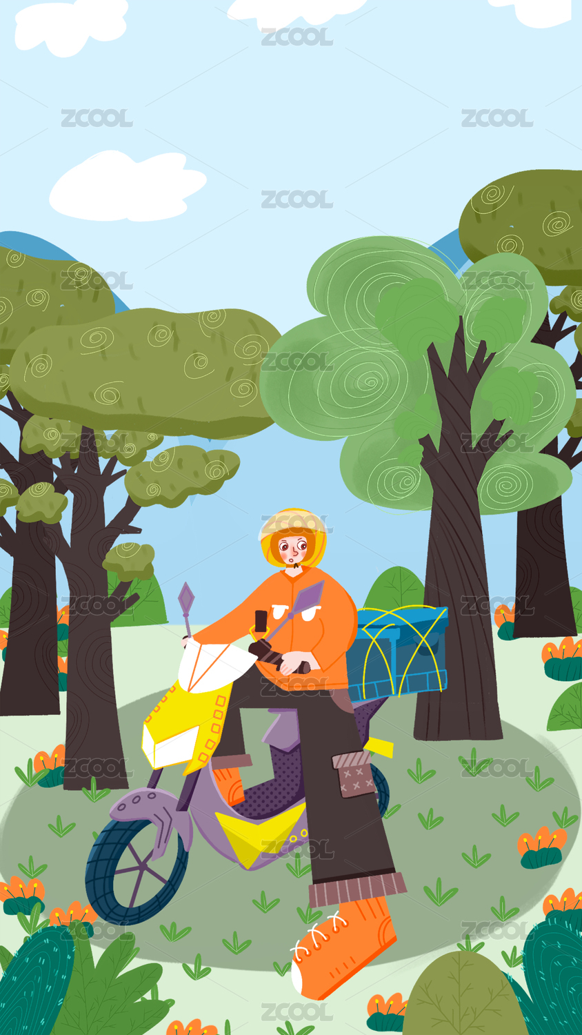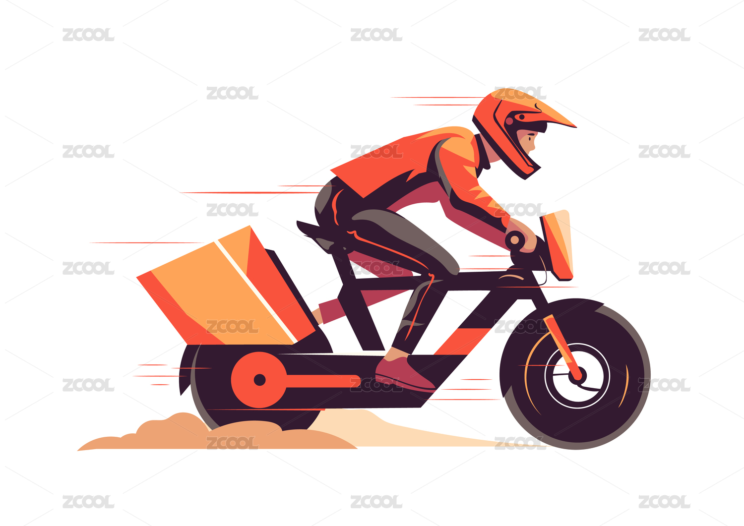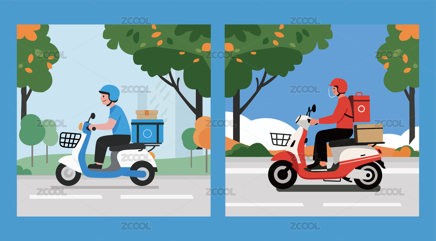 矢量扁平外賣騎手騎著電動(dòng)車在城市前行