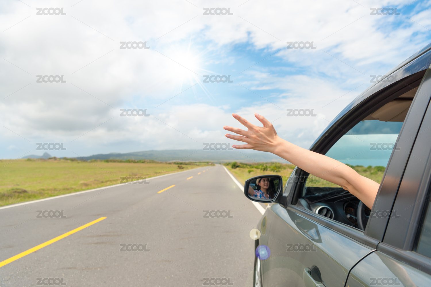 特寫有吸引力的女人的手放松的假期休假,在陽(yáng)光燦爛的日子享受的客場(chǎng)之旅坐在車停在大自然的柏油馬路。
