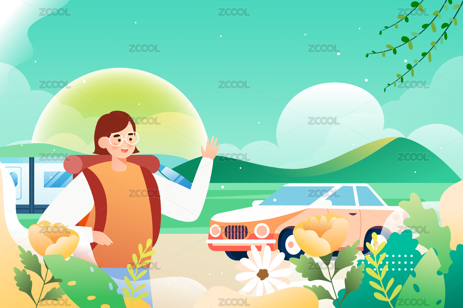 五一勞動節(jié)放假旅行插畫春天旅游自由行海報